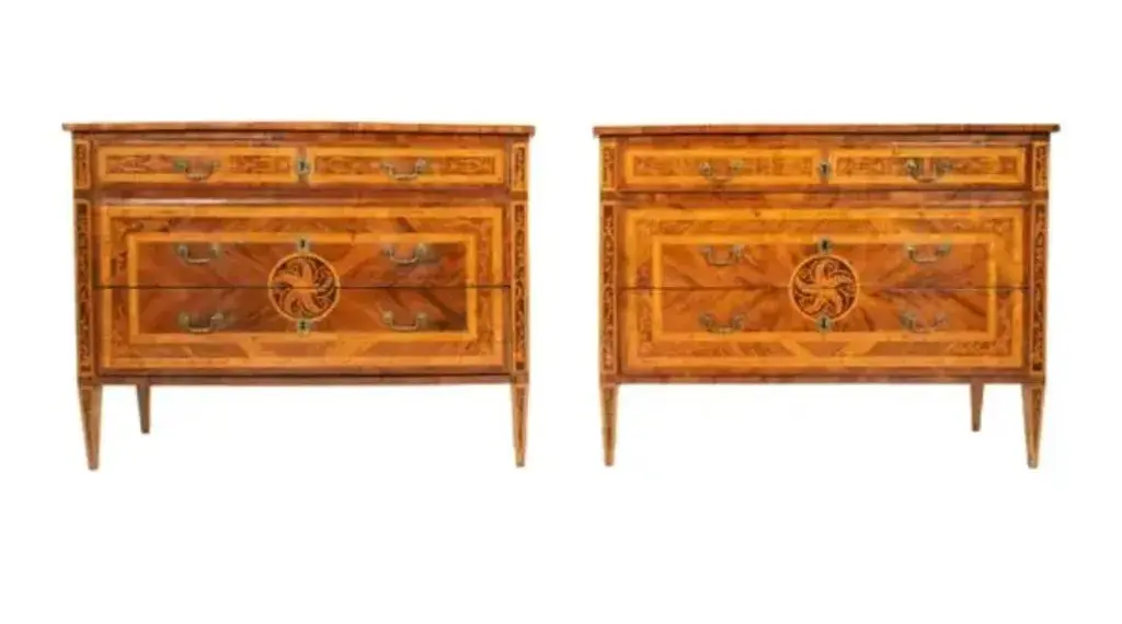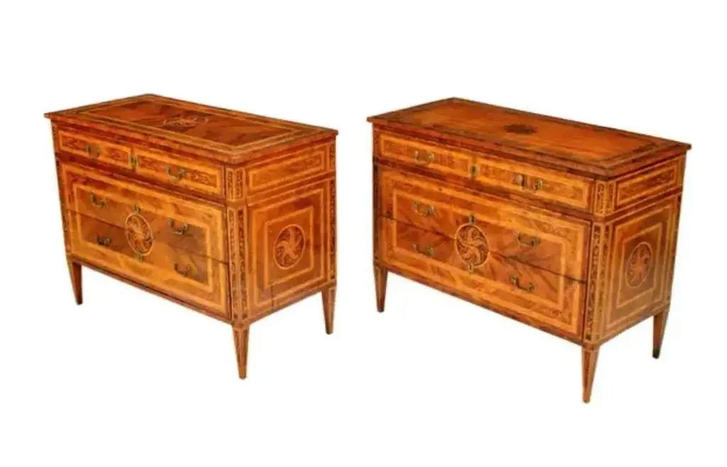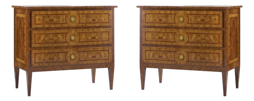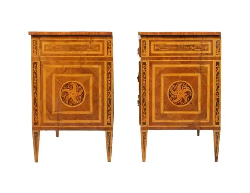This listing is for One commode. We have two available. Italian 18th Century Giuseppe Maggiolini Style Inlaid Commode. Celebrated for their intricate marquetry and elegant forms, Giuseppe Maggiolini's stylish and ornate furniture was famous for his skill in marquetry, where different woods and materials are inlaid to create elaborate and detailed patterns, often including floral and geometric designs. This pair exhibit graceful lines and proportionate shapes, reflecting the neoclassical style that was popular during his time. Tops, sides and drawer fronts are finely inlaid with a center medallion. Below are three drawers with finely crafted bronze mounts and hardware, which add a touch of sophistication and complement the overall design. Supported by four inverted truncated pyramid feet which are also inlaid. The craftmanship reflects the artistic skill and attention to detail prevalent during the era.