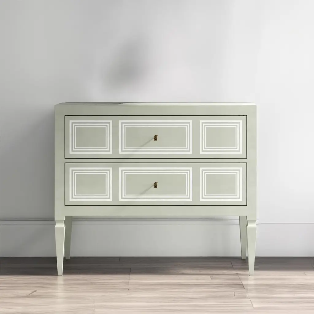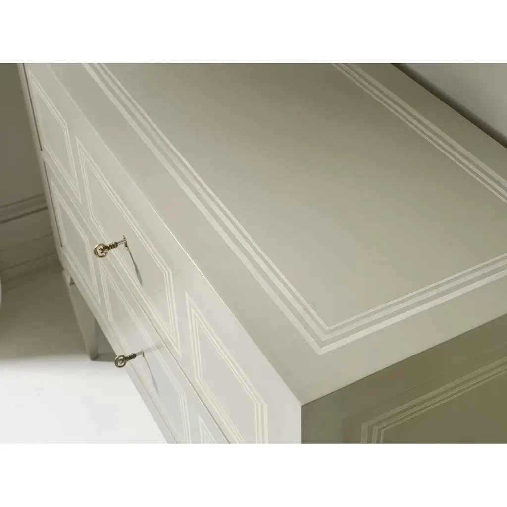 Northern Italian Neo Classic Painted Commode with a grey painted finish and ivory accents, this hand-painted two drawer commode has a simple modern look and roots in Northern Italy in the 19th century.Two long drawers with antique key pulls raised on square tapered legs.Dimensions: 40" W x 18" D x 34" H.