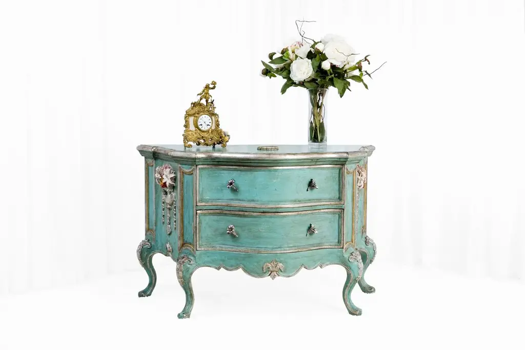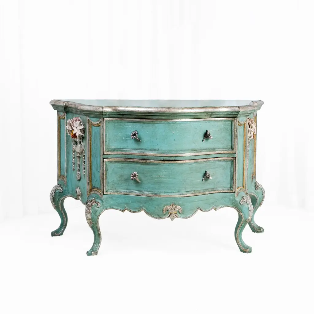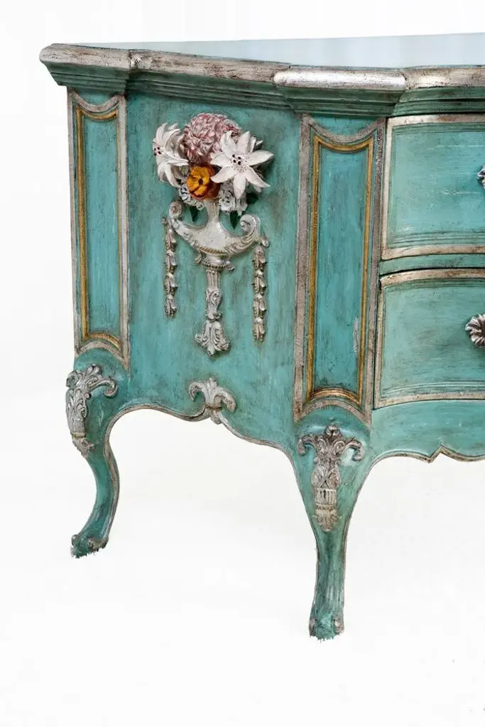 Created for The Rothschild Collection - "Joy" 2005 © - An Italian rococo commode is manufactured out of American Poplar, with a serpentine-shaped top above a pair of conforming paneled drawers with trumpet flower-cast silvered bronze drawer pulls, above a waved apron with central flur-de-lys, with shaped paneled angles, the sides richly carved with a foliate urn issuing a floral bouquet with lilies, poppies, rose, and hydrangea with trailing husk detail, on deep cabriole legs carved with stylized foliage. "Joy" simply brings joy to any room. Named after an amazing colorful woman, this piece is a colorful fantastically elegant showstopper!