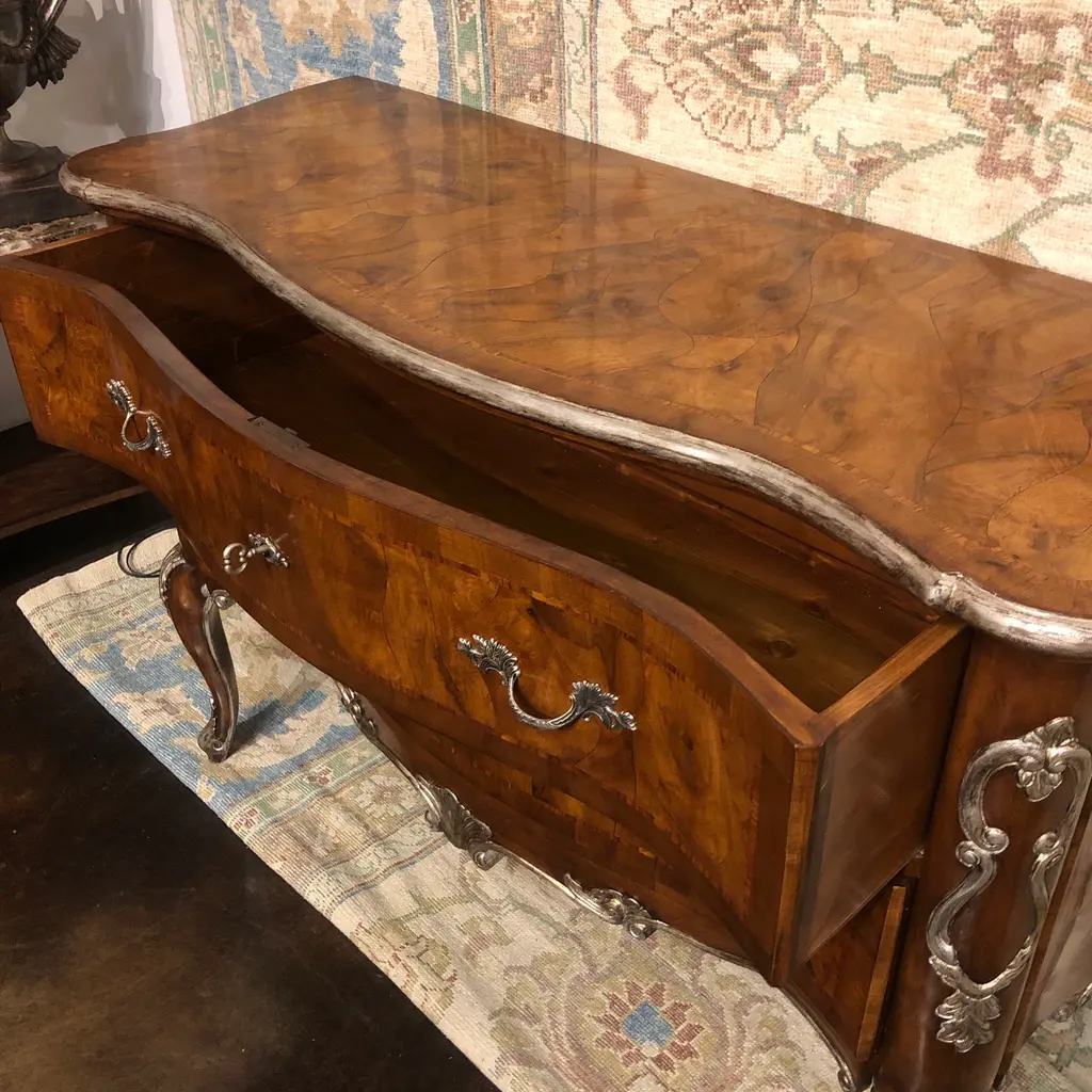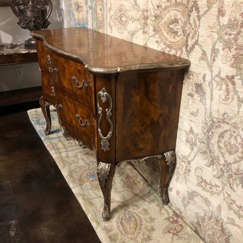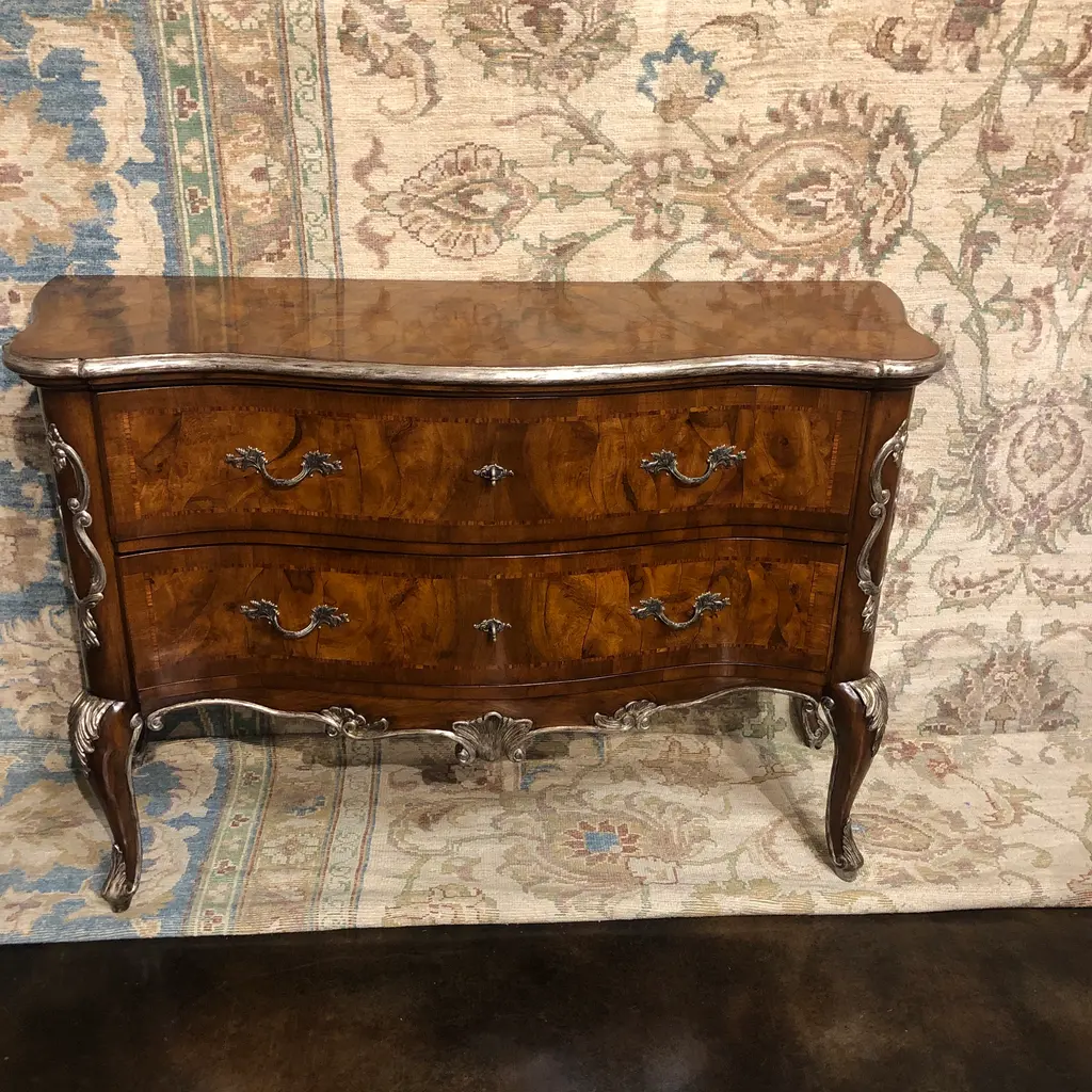 Two drawer shaped chest of drawers featuring walnut oyster wood style wood inlay and a rosewood inlay line detail on the top, sides and front drawer panels with a hand rubbed finish. Italy This item includes restricted materials and can not be sold outside of the contiguous United States.