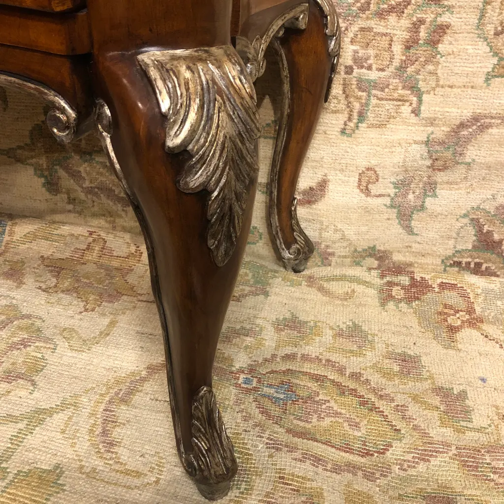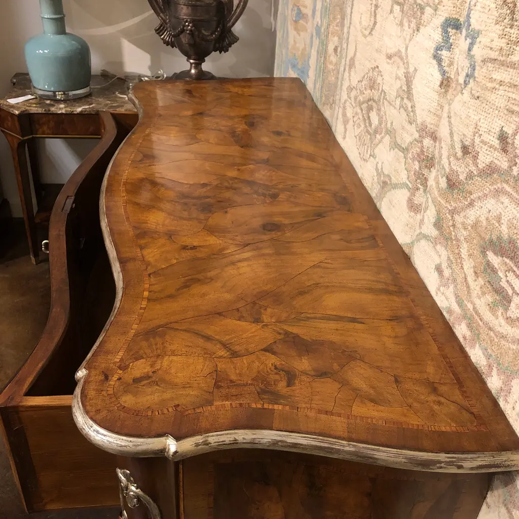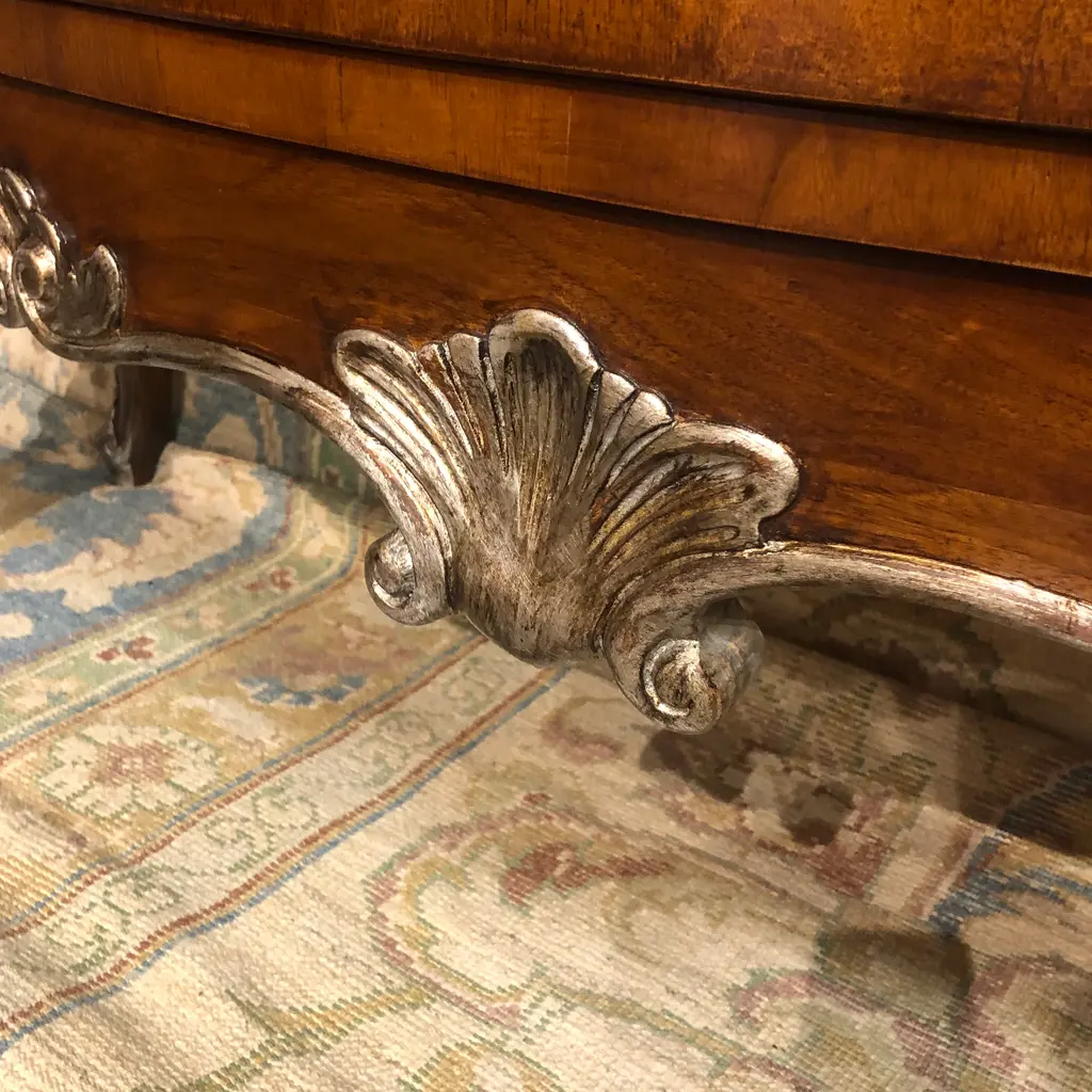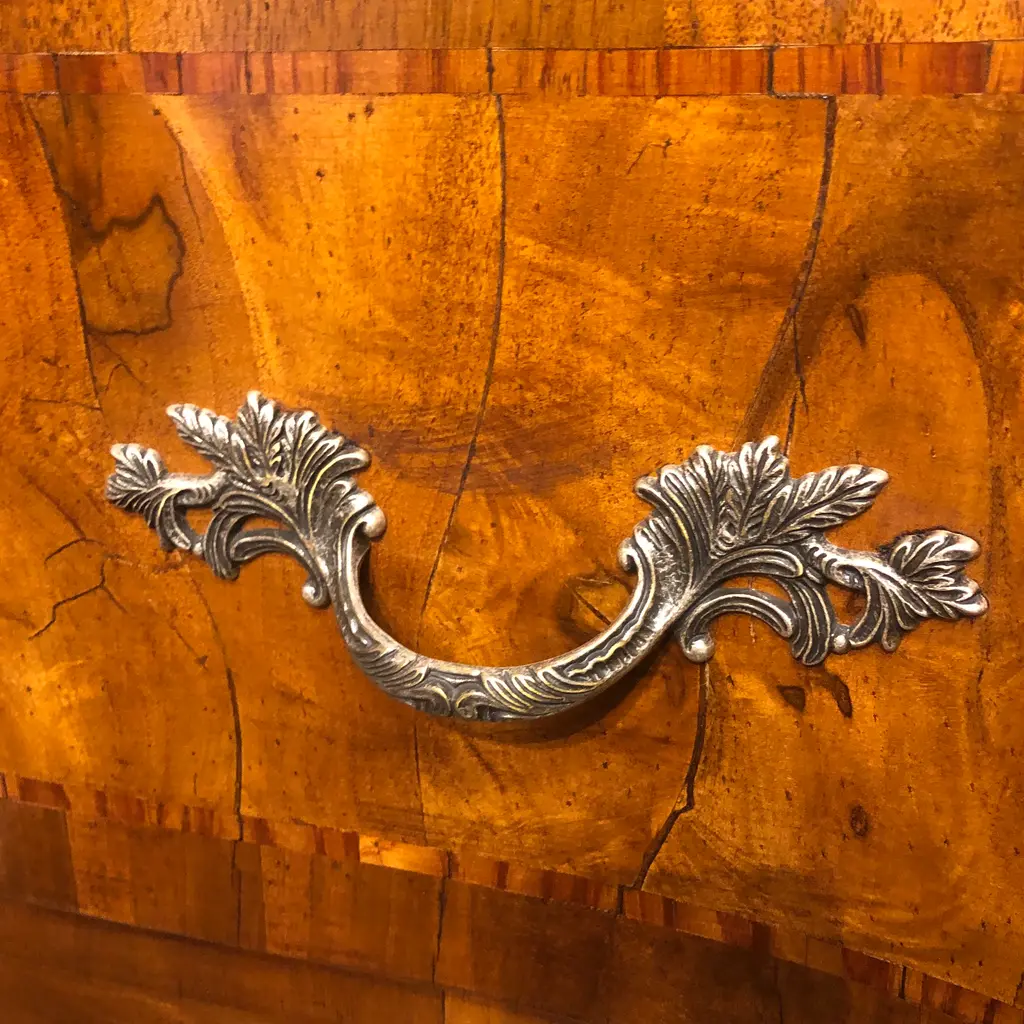 Two drawer shaped chest of drawers featuring walnut oyster wood style wood inlay and a rosewood inlay line detail on the top, sides and front drawer panels with a hand rubbed finish. Italy This item includes restricted materials and can not be sold outside of the contiguous United States.