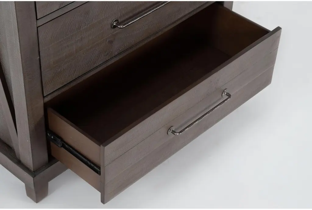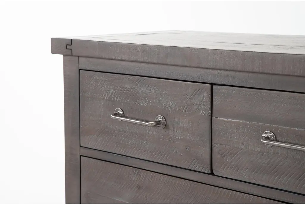 Introducing the Jaxon Grey Wood 57" Tall 6 Drawer Chest, a perfect blend of industrial style and rustic charm. Crafted from solid pine, this chest features an aged grey finish that complements any bedroom decor. With six spacious drawers, it offers ample storage for all your essentials while maintaining a sleek, vertical profile.