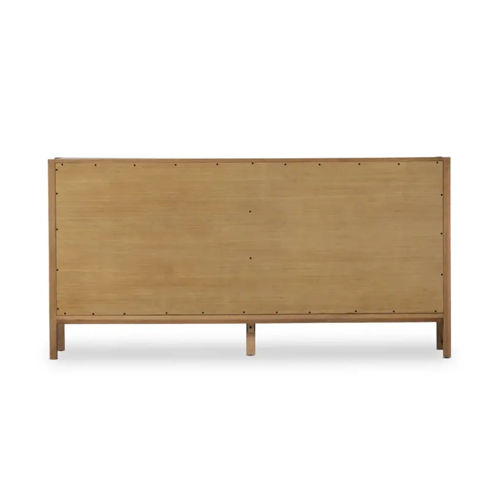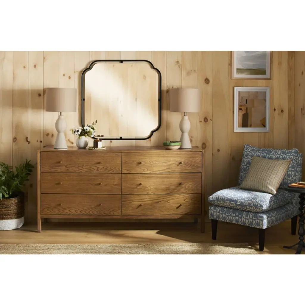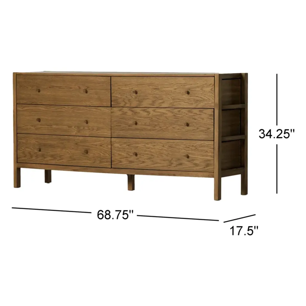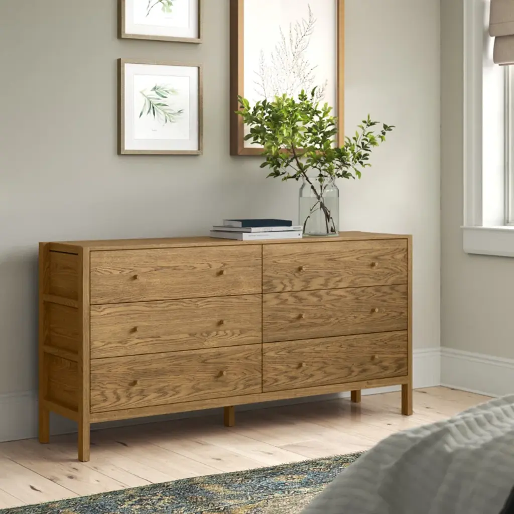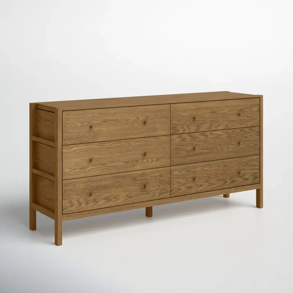 With simple shaping inspired by mid-century casing, exposed framework, and a warm oak finish bring a handcrafted, minimalist look to modern bedroom styling with six spacious drawers for ample storage.