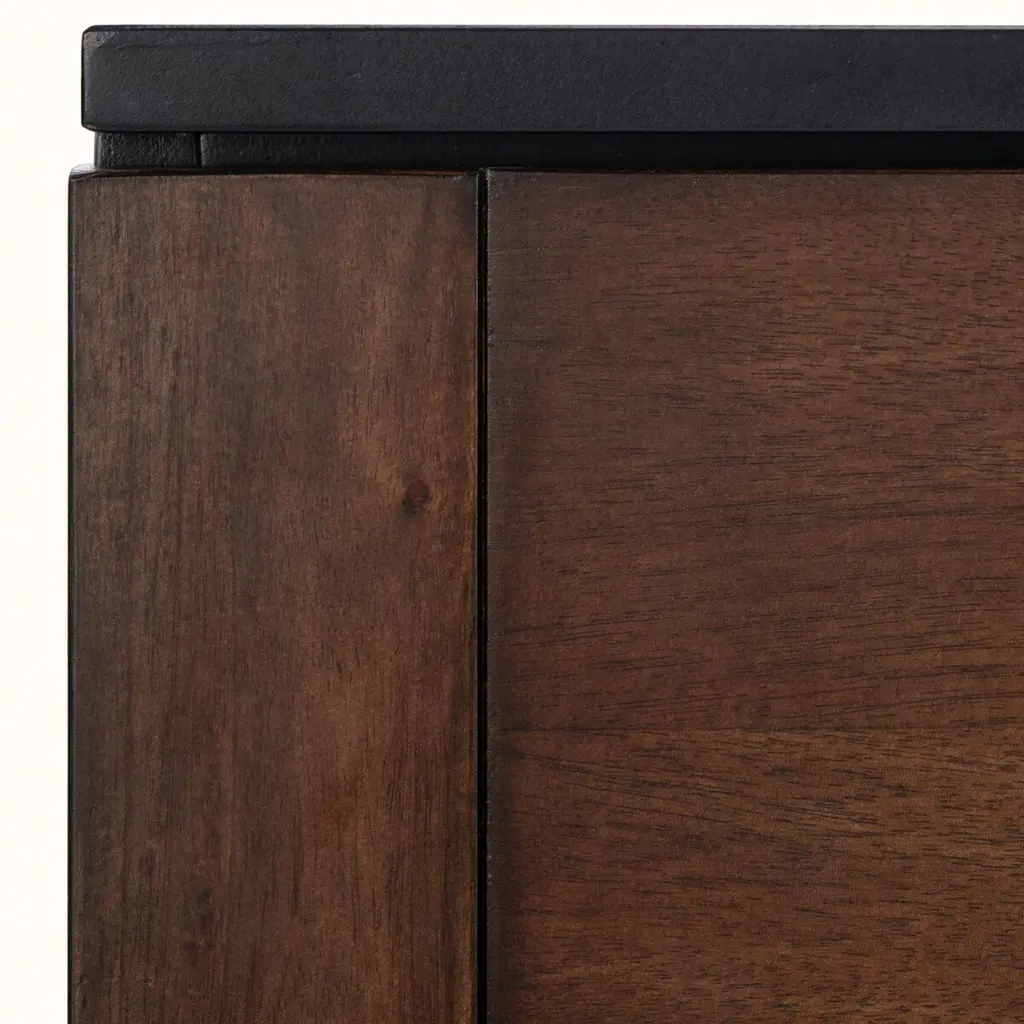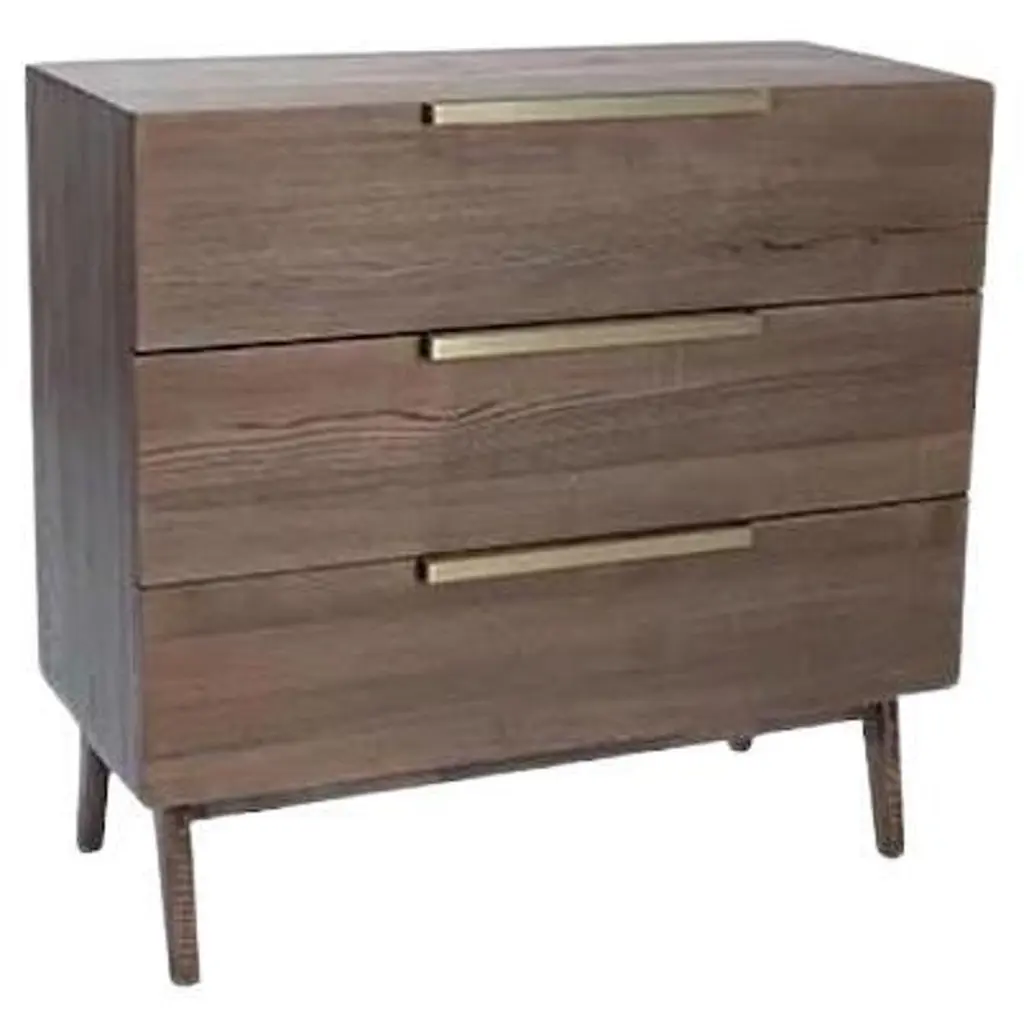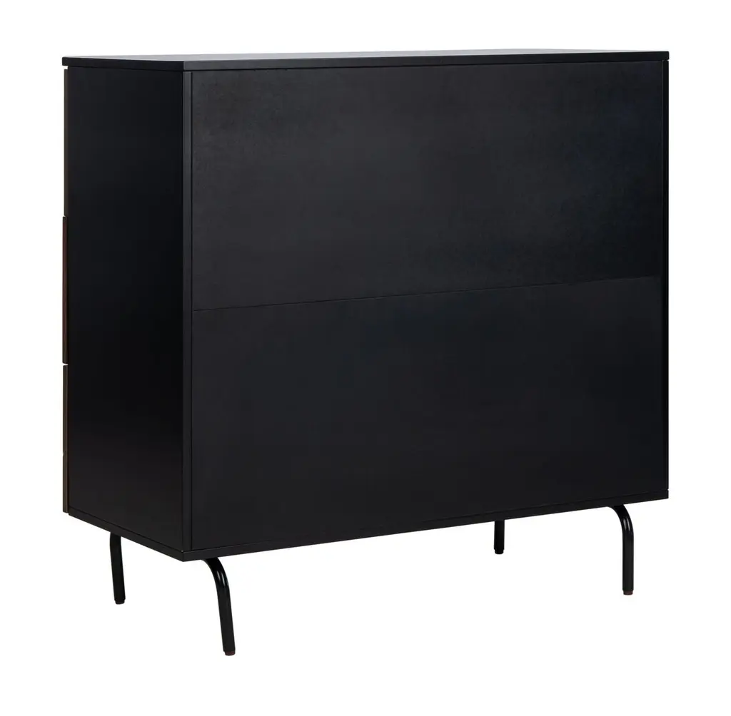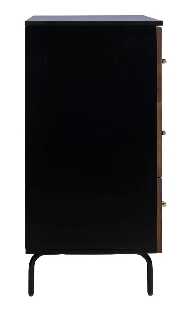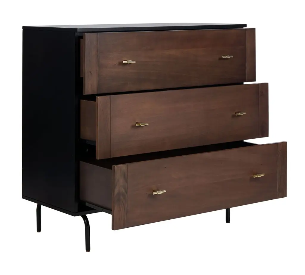 This dresser features three drawers that offer a tonal and textural contrast to the sleek finish of the frame and the metal legs. Its design combines elegance and functionality, making it a versatile addition to any room.