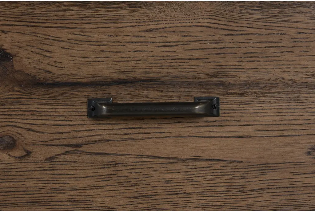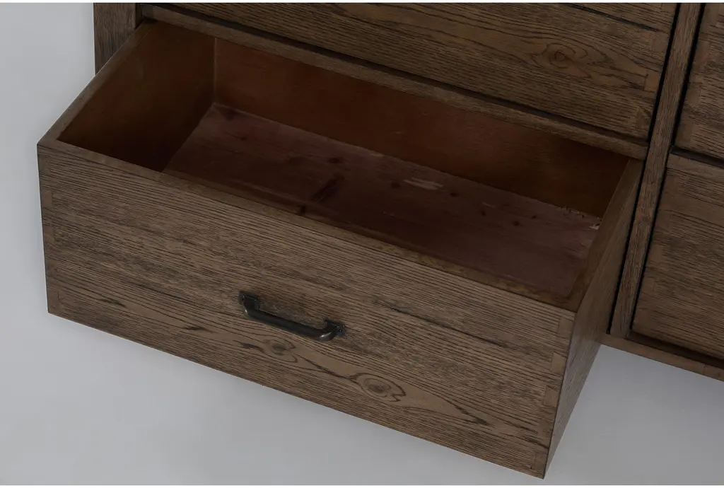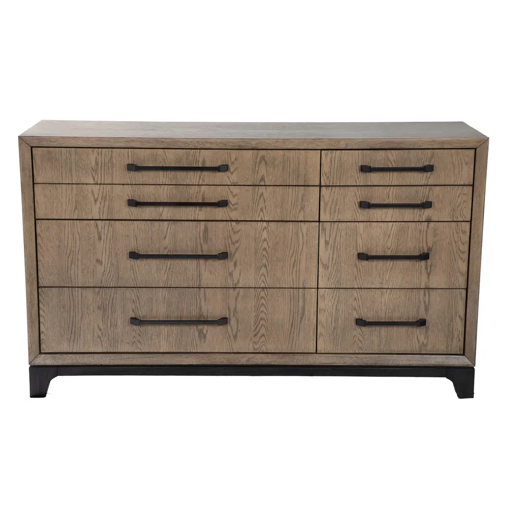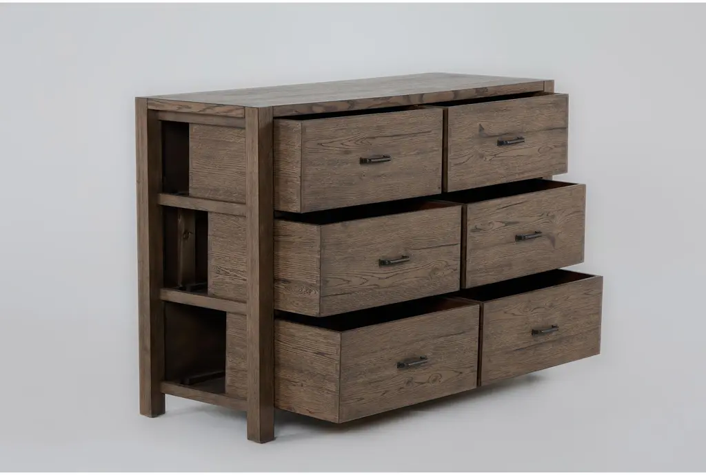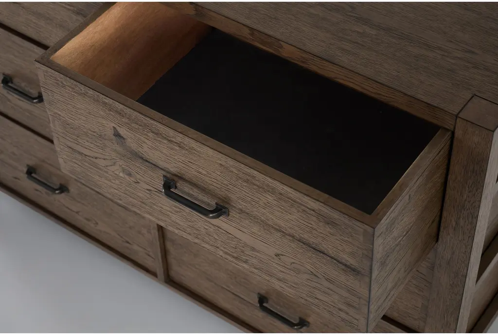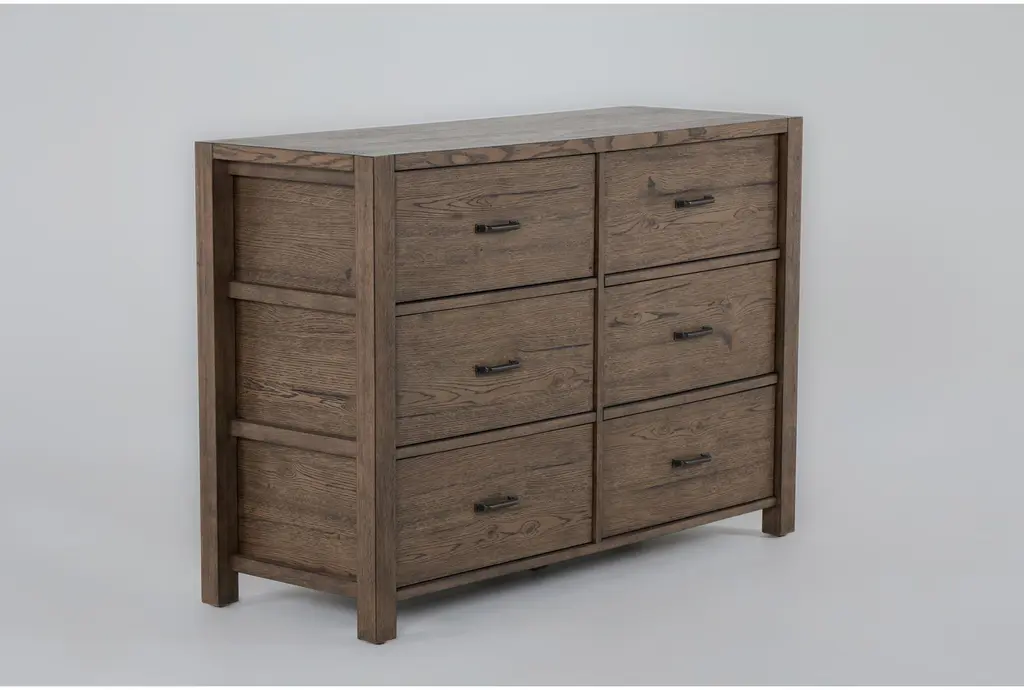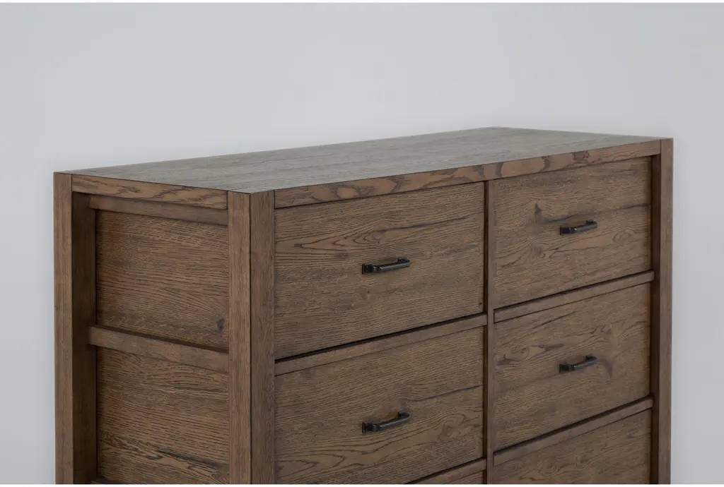 The Kai Brown 6-Drawer Dresser brings rustic charm to your bedroom while providing ample storage space. Constructed from oak veneers and solid rubberwood, this dresser ensures durability and longevity. Its natural brown finish enhances the rustic appeal and complements a variety of bedroom décors.