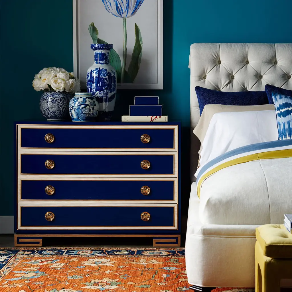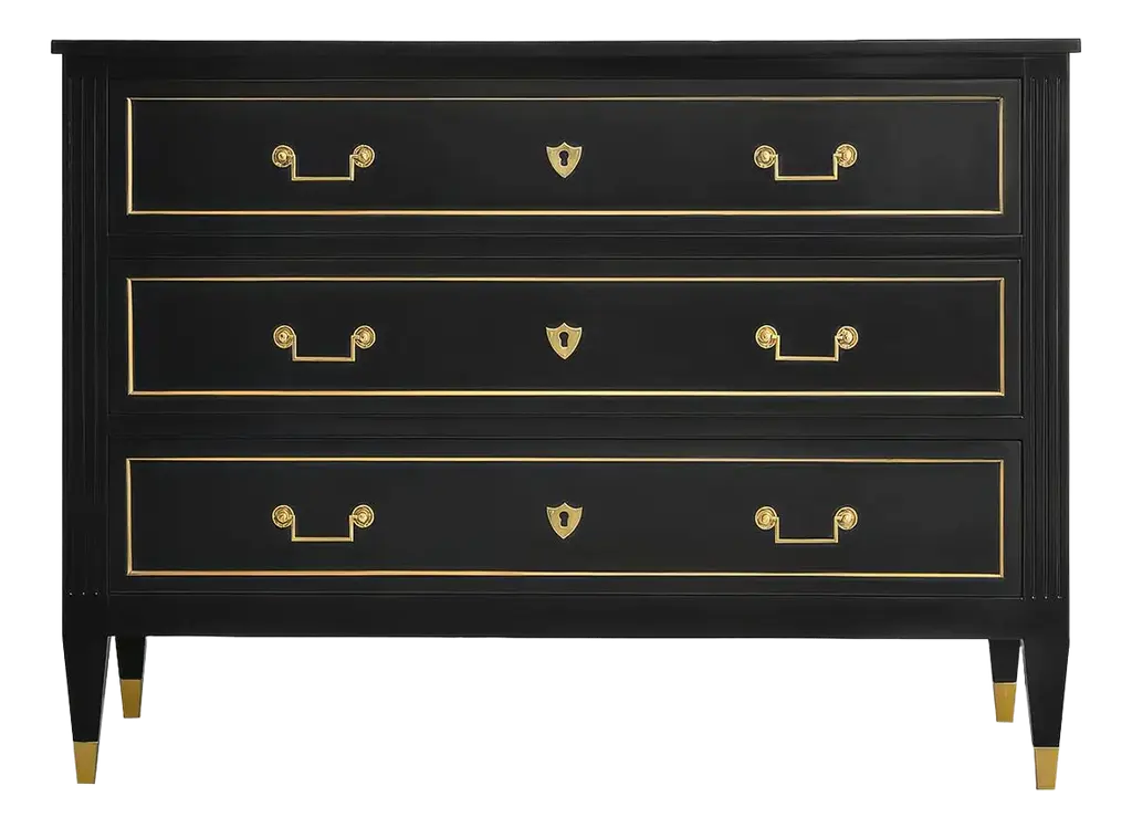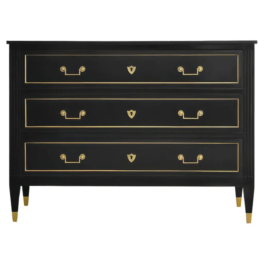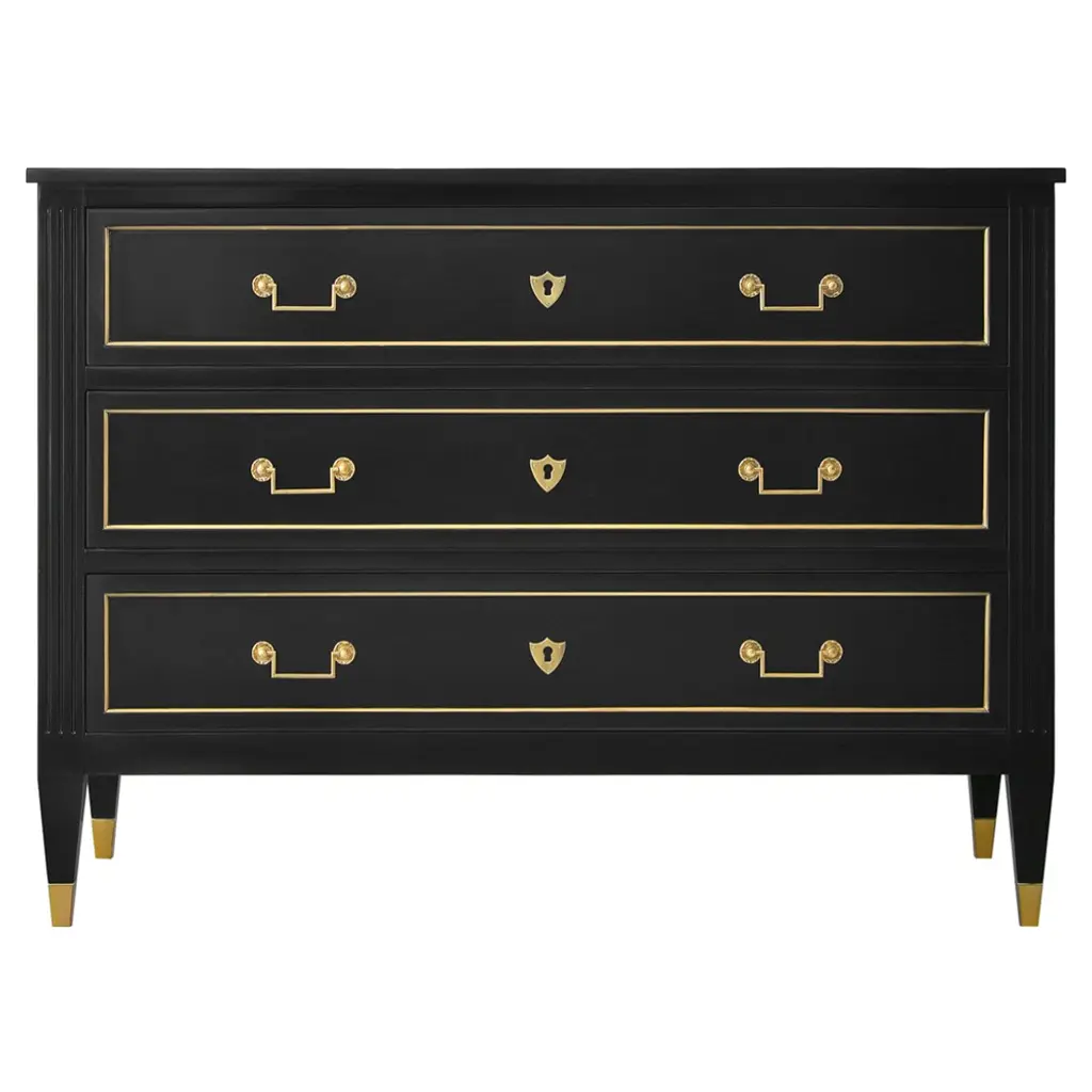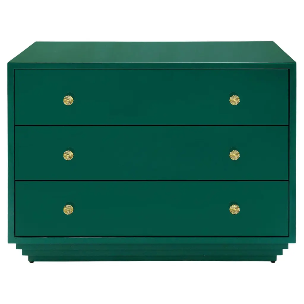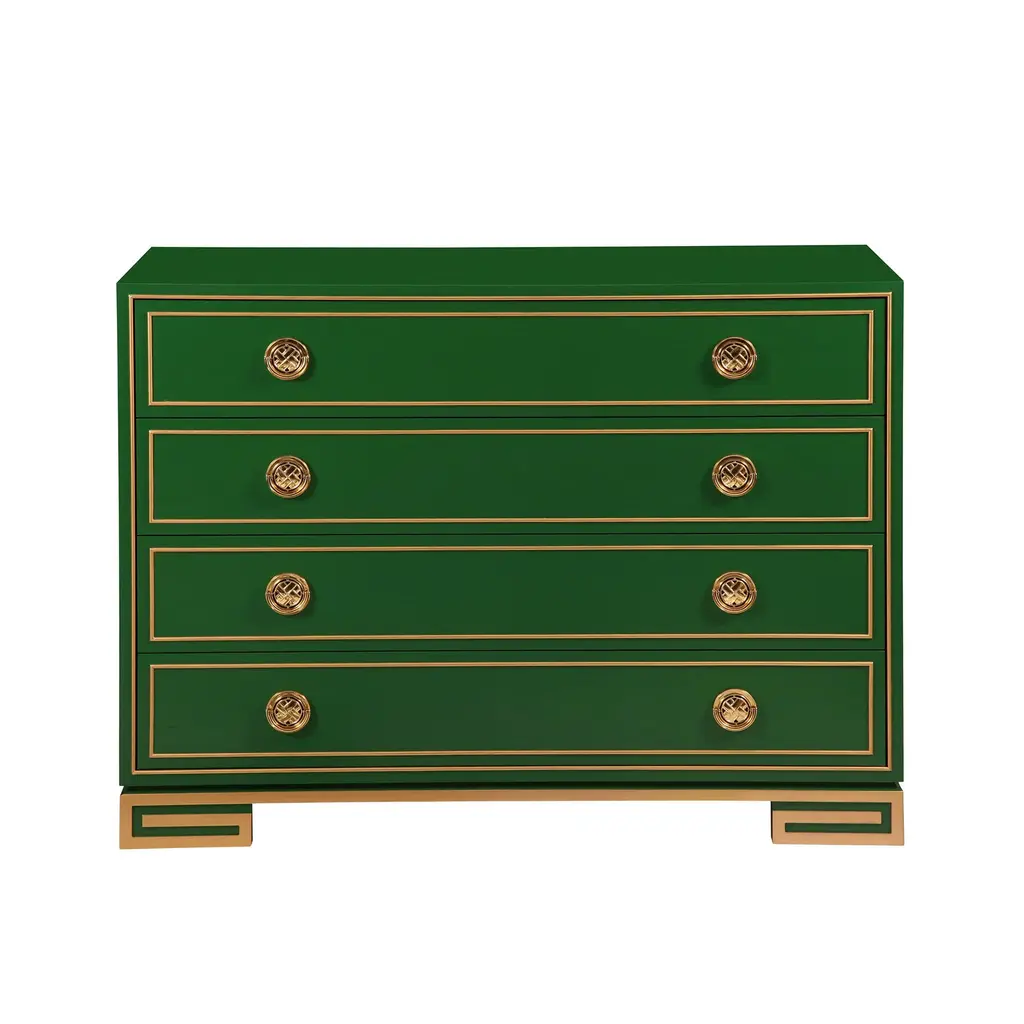 A nod to the elegance of the 1930's Hollywood Regency period, our Karl chest features a hand carved gold leaf panted Greek key base with polished brass hardware. Ships In 10-12 Weeks Polished brass hardware Greek design accents Customizable finish As Shown Finish: Custom Match This product can be special ordered in additional finishes. Click here to email us for for additional information about special ordering.This image is for illustrative purposes only. The colors shown are accurate within the constraints of lighting, photography, and the color accuracy of your screen.