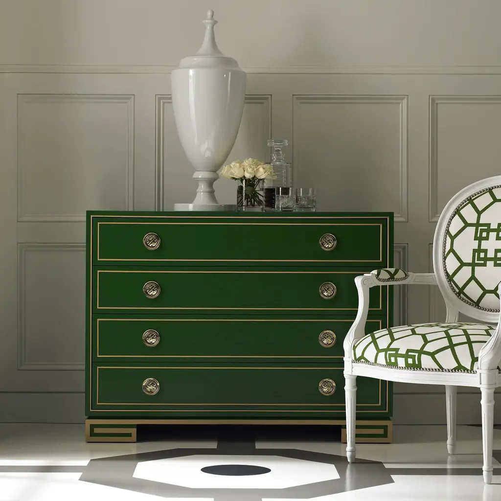 A nod to the elegance of the 1930's Hollywood Regency period, our Karl chest features a hand carved gold leaf panted Greek key base with polished brass hardware. Ships In 10-12 Weeks Polished brass hardware Greek design accents Customizable finish As Shown Finish: Custom Match This product can be special ordered in additional finishes. Click here to email us for for additional information about special ordering.This image is for illustrative purposes only. The colors shown are accurate within the constraints of lighting, photography, and the color accuracy of your screen.