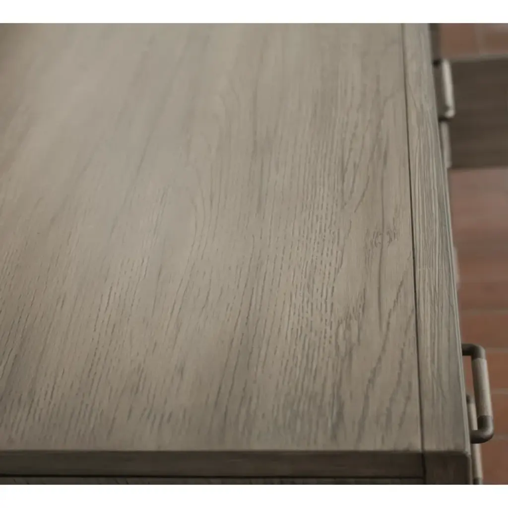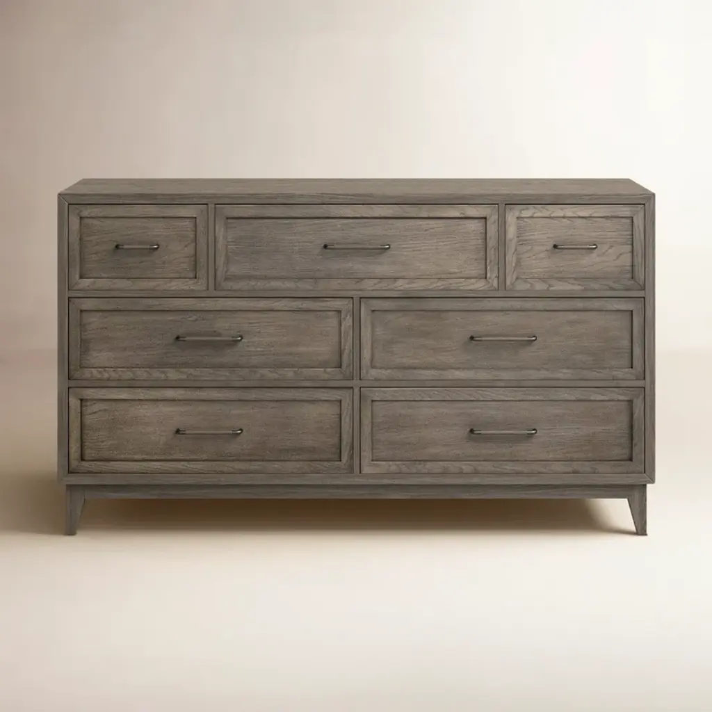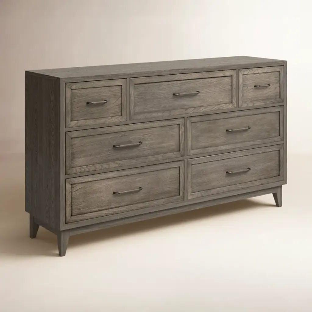 Say hello to this horizontal dresser, a versatile and functional addition to your bedroom. Made from a blend of engineered wood and solid oak and poplar, it showcases the natural wood grain color variation for an authentic look. With multiple drawer sizes and full-extension ball bearing glides, you'll have easy access to your clothes and accessories. The metal handles are removable, allowing you to customize your storage space. Plus, a tipover restraint device is included for added safety. Just remember, this piece is designed for residential use only.