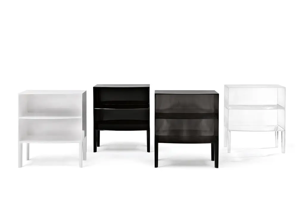 The Kartell catalogue adds yet another piece to its furniture collection, the commode. Starck has revamped it and the Kartell-style commode evokes the lines of Classic furniture while its transparency and plastic material give it a contemporary voice. Corners and curves, straight lines and sinuous play over its surfaces and give life to an intriguing game of eye-catching perspectives and reflections. Ghost Buster with three open front shelves and four bifacial legs is the largest plastic monobloc ever yet made in the world of furnishings - another demonstration of Kartell's determination to break down all the barriers of technical Challenge.