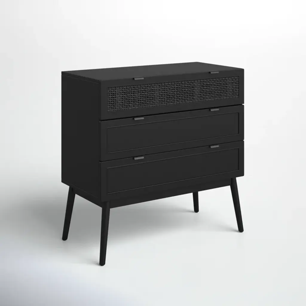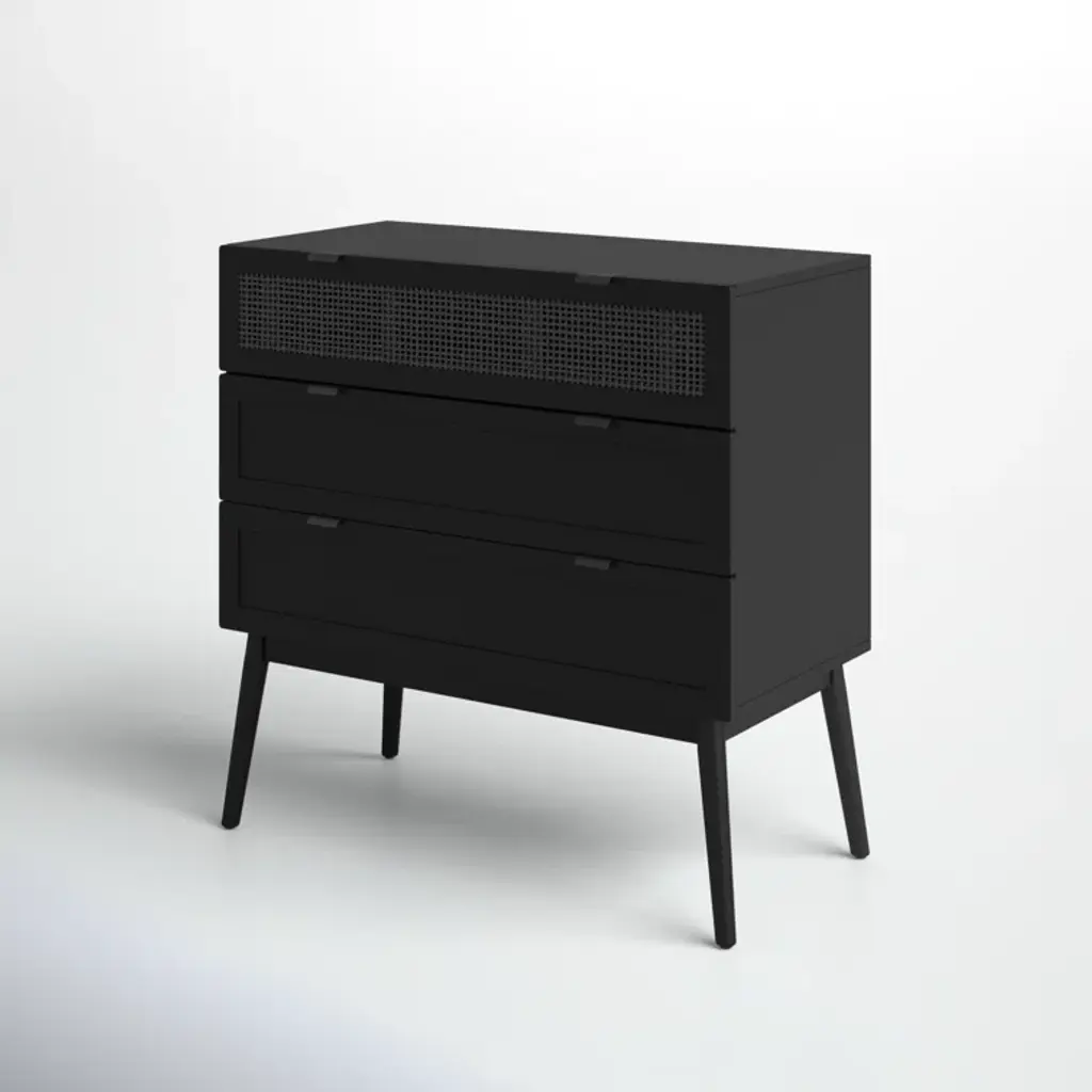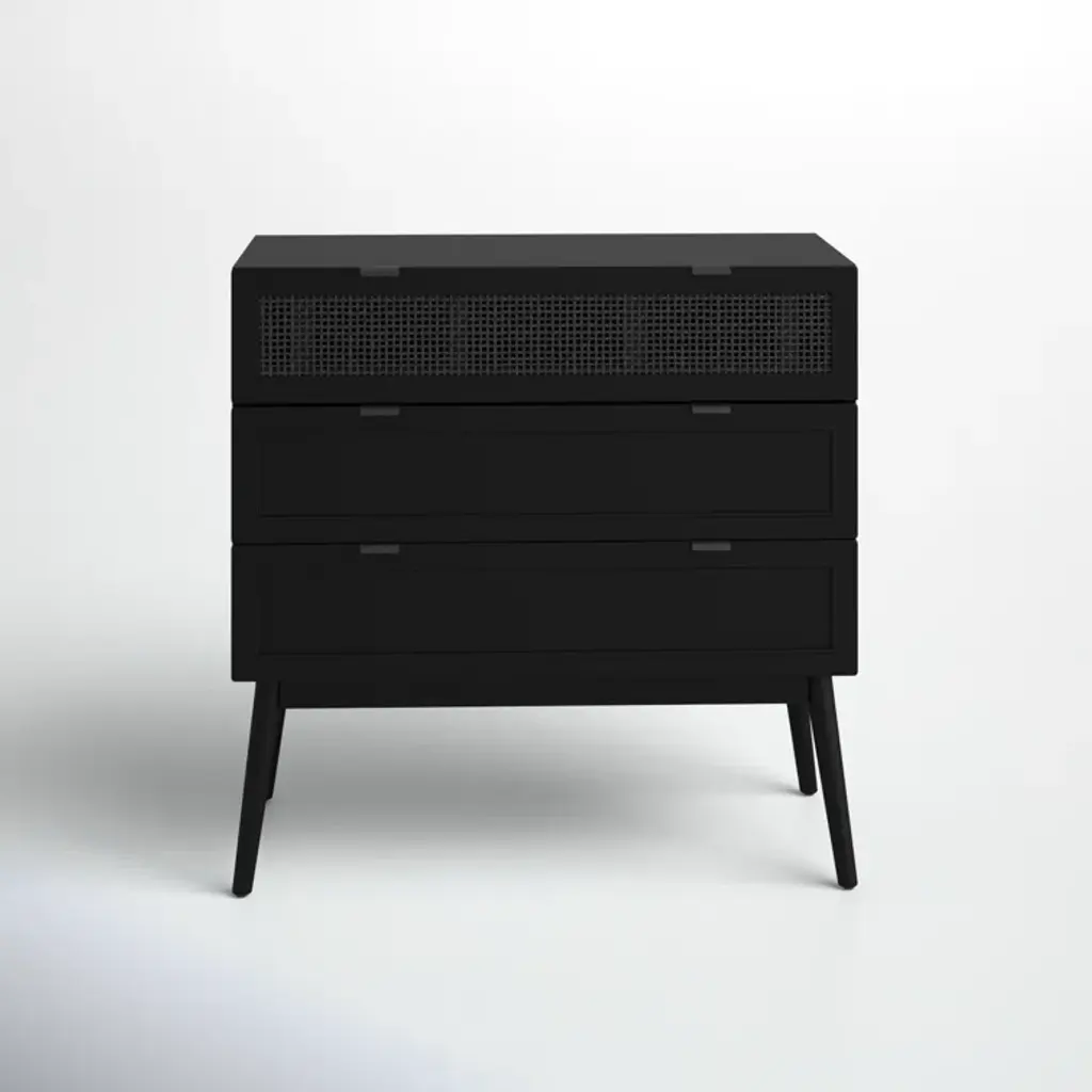 This 3-drawer chest fuses chic mid-century design elements with contemporary lines – and we love the result. It is crafted from a blend of solid mahogany and engineered wood. The slender flared legs and minimalist hardware add to the modern, on-trend vibe. A woven rattan front accents the top drawer, while the middle and lower drawers have solid fronts. They all sit on roller glides and are fully extendable, making it easy to access your items. Moreover, the surface is ideal for displaying framed photographs, collectibles, or a house plant or two for a pop of color.