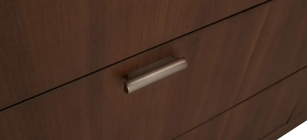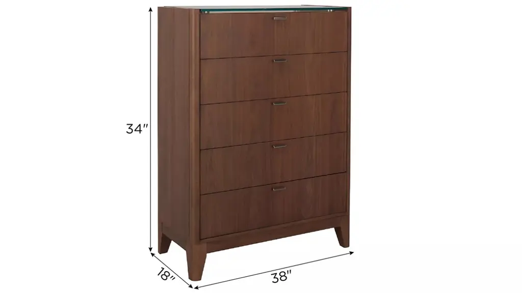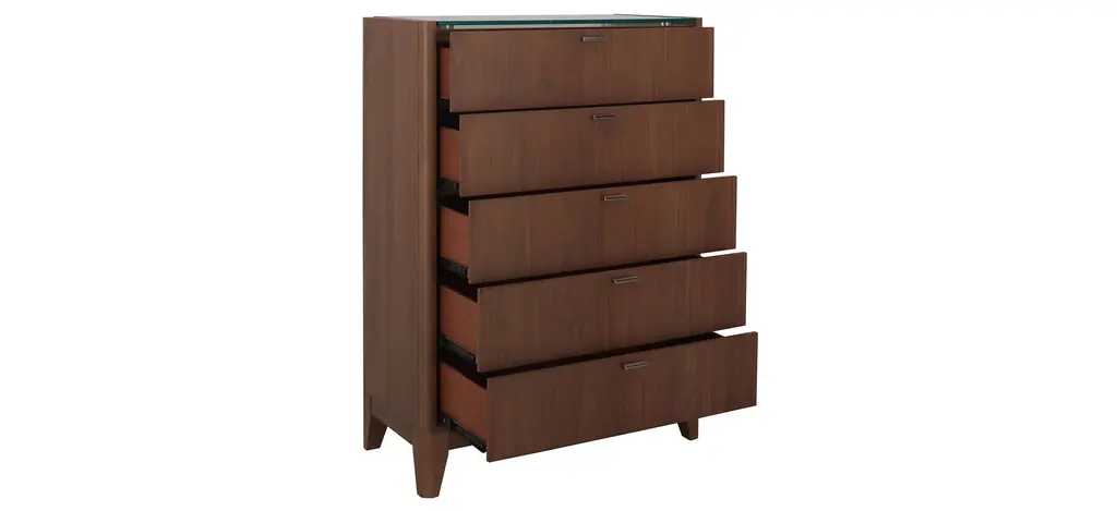 Low-profile design, glass topped surface, light walnut finish ... what more can we say about the Kerrigan bedroom chest? The first-rate craftsmanship and smart nickel hardware fit the bill with everything you want for a modern midcentury look. It also has five roomy drawers for maximum function.