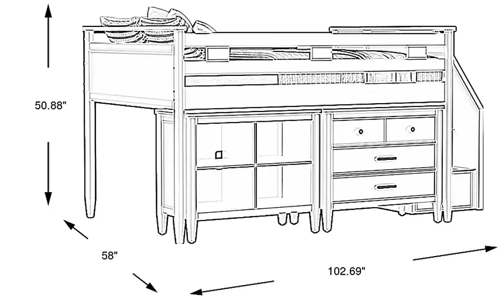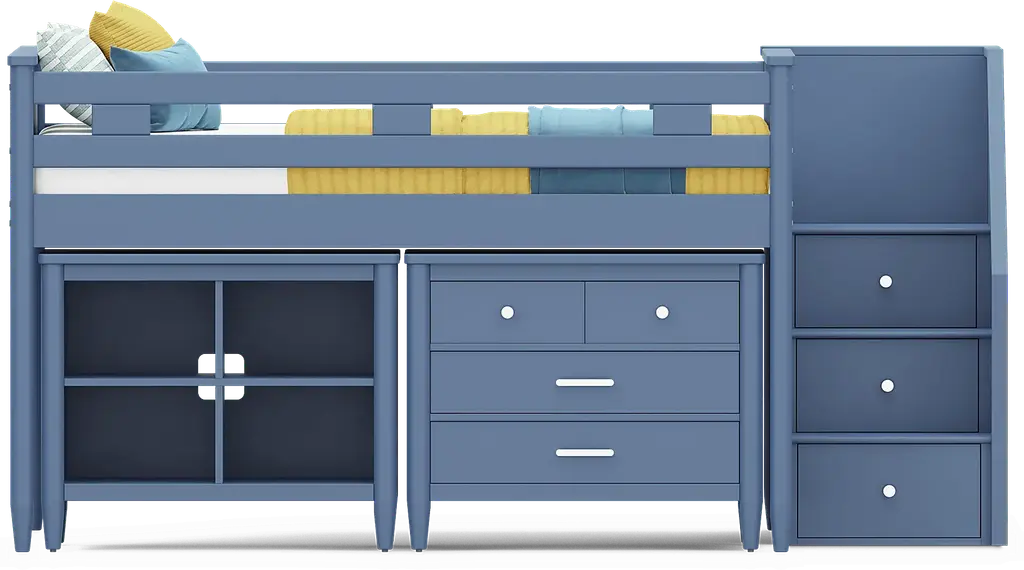 The ultimate collection for your color obsession is finally here with the Modern Colors full low loft bed. Constructed from poplar solids in slate blue finish, each piece balances ultra-sleek craftsmanship with easygoing comfort. Featuring a full bed that sits lower to the ground than a traditional loft, this piece has a reversible staircase that can be affixed to either side of the bed. The steps feature storage drawers that are perfect for stashing away clothing, books and more. The coordinating loft chest has three drawers crafted with front French dovetail joints and ball bearing, side mounted glides. A matching 37-inch bookcase can shelve books, comics, magazines, decor and more. The hardware is finished in brushed nickel but brushed gold knobs and pulls are also included with purchase. Mattress and foundation (if required) sold separately. This product requires a bunkie board (sold separately).