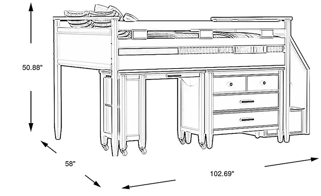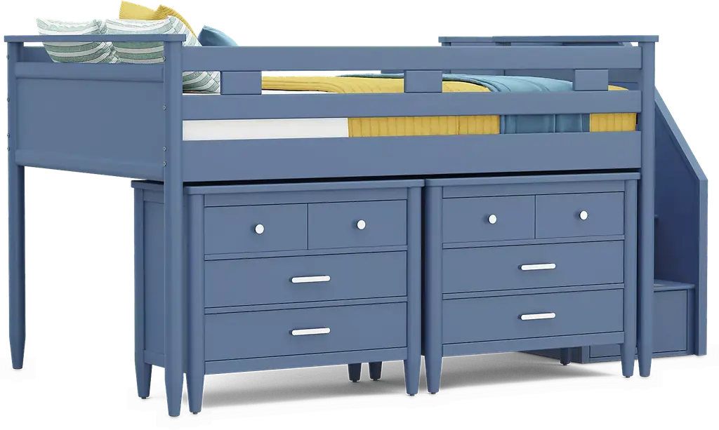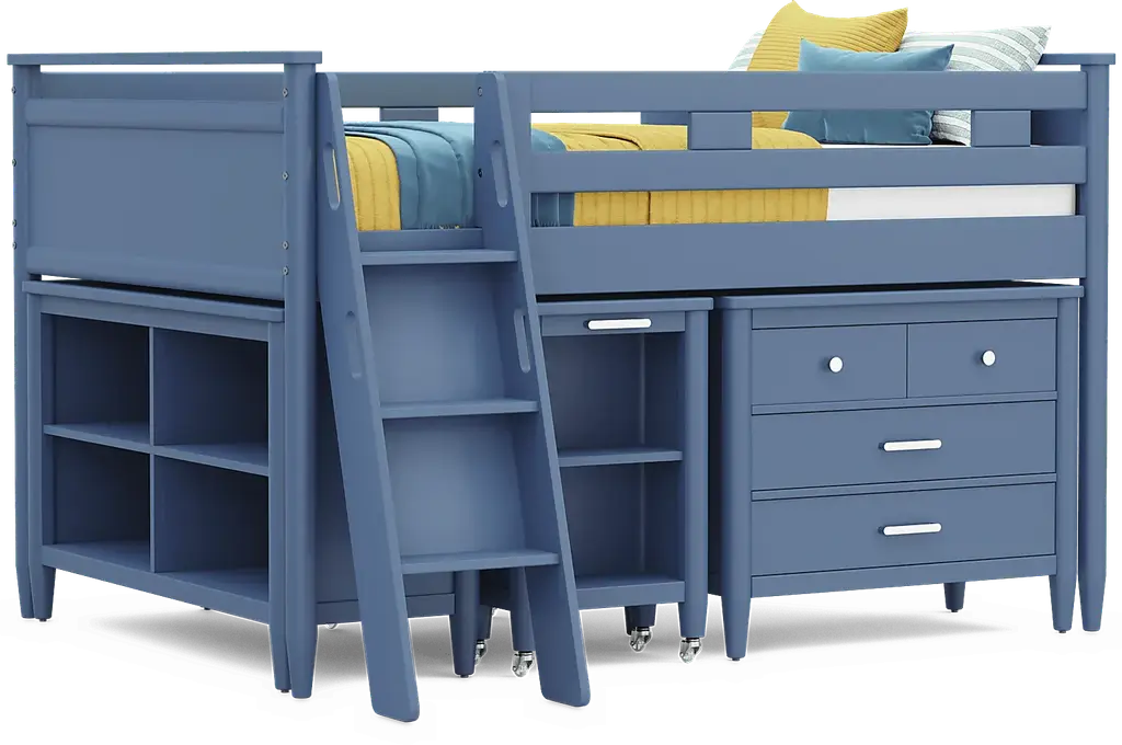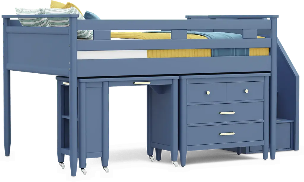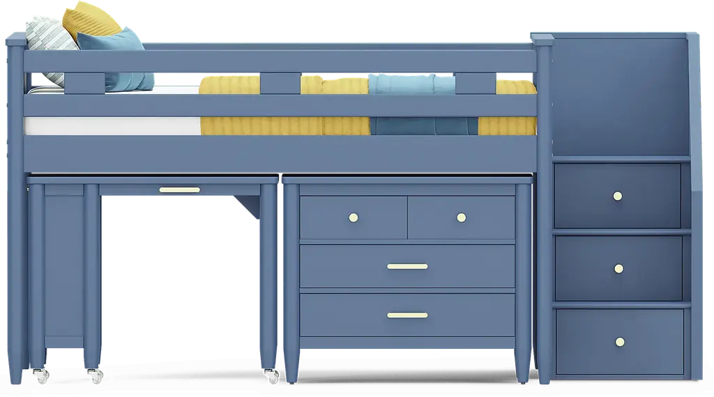 The ultimate collection for your color obsession is finally here with the Modern Colors full low loft bed. Constructed from poplar solids in slate blue finish, each piece balances ultra-sleek craftsmanship with easygoing comfort. Featuring a full bed that sits lower to the ground than a traditional loft, this piece has a reversible staircase that can be affixed to either side of the bed. The steps feature storage drawers that are perfect for stashing away clothing, books and more. The coordinating loft chest has three drawers crafted with front French dovetail joints and ball bearing, side mounted glides. Soar through study time with the coordinating caster desk that can be wheeled out and around at a moment's notice. The desk even has a couple cubbies that are perfect for textbooks or homework supplies. The hardware is finished in brushed nickel but brushed gold knobs and pulls are also included with purchase. Mattress and foundation (if required) sold separately. This product requires a bunkie board (sold separately).