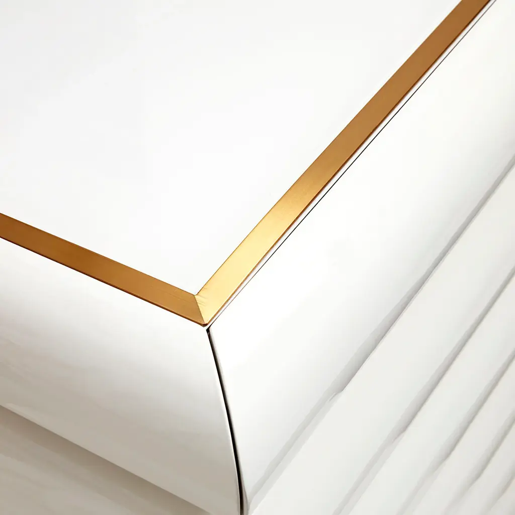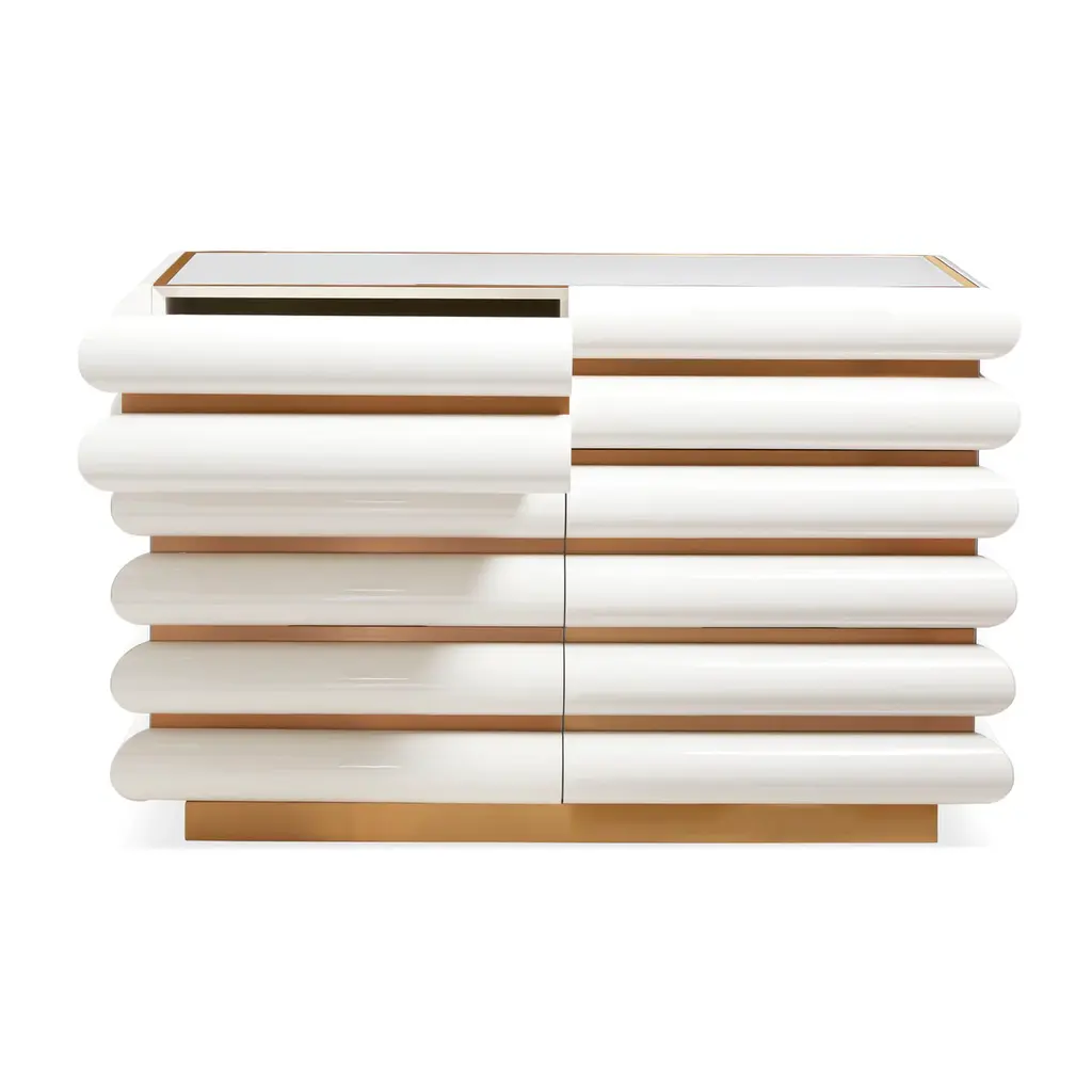 Future Glam. Floating on a recessed base, our Kiki dresser features a brushed brass cabinet faced with puffy capsules in glossy ivory lacquer. Topped with ivory back painted glass and fitted with six velvet-lined interior drawers for stashing your stuff. Fabulously futuristic in a grand foyer and just as glamorous in modern boudoir.