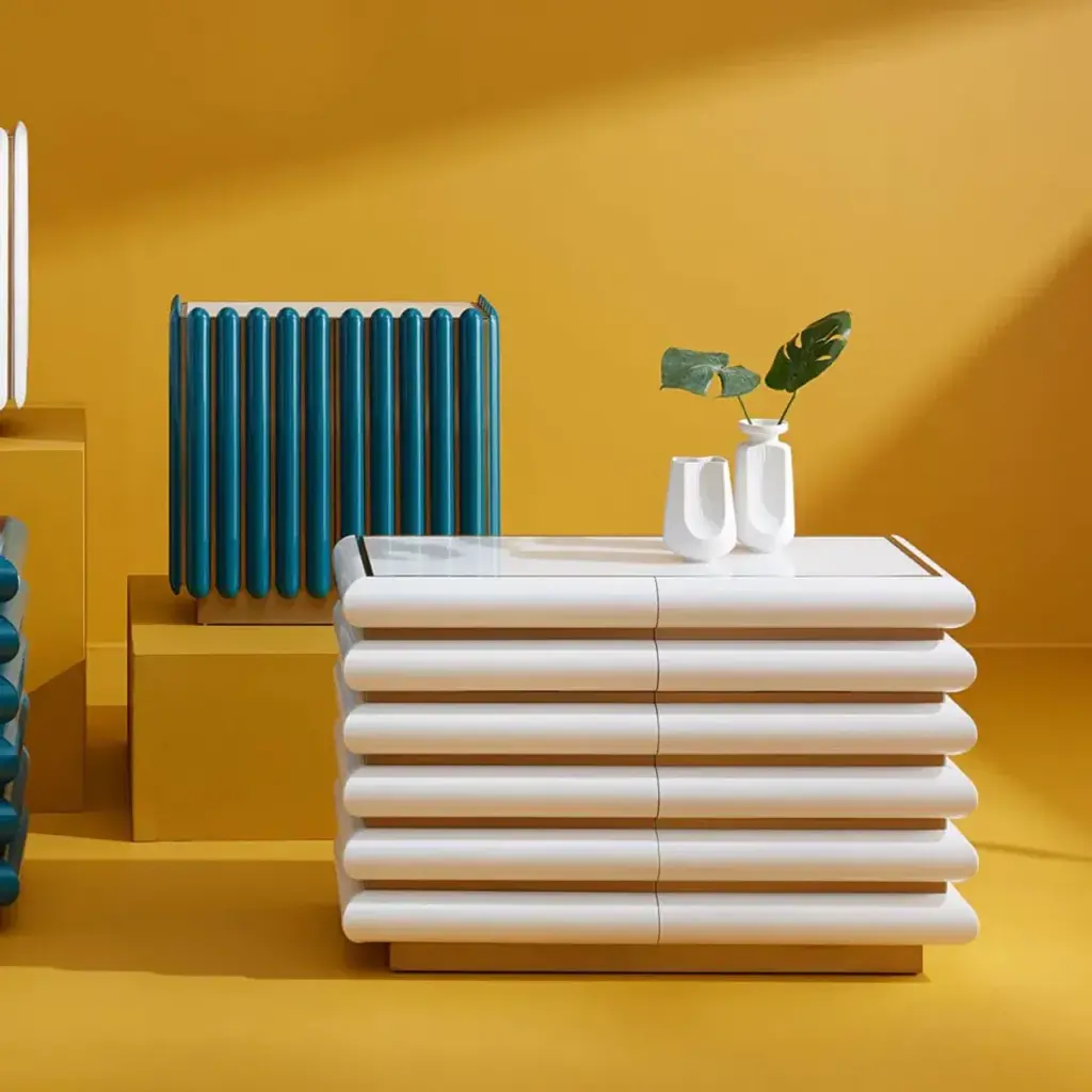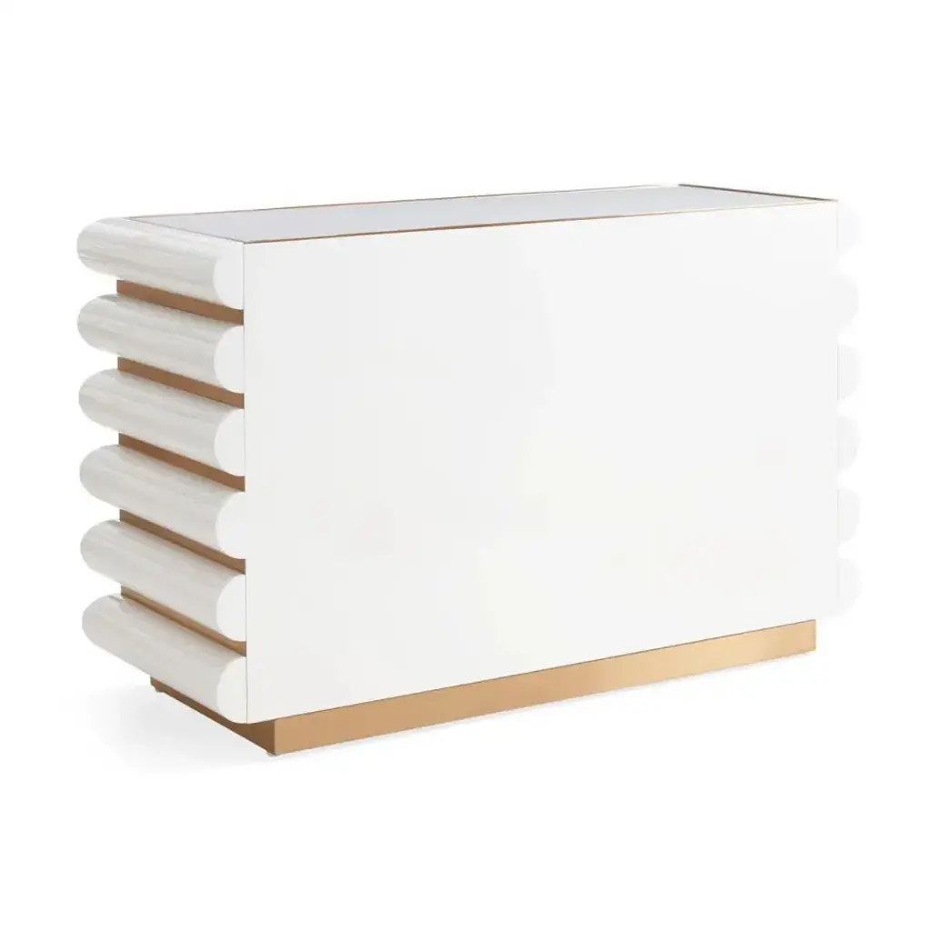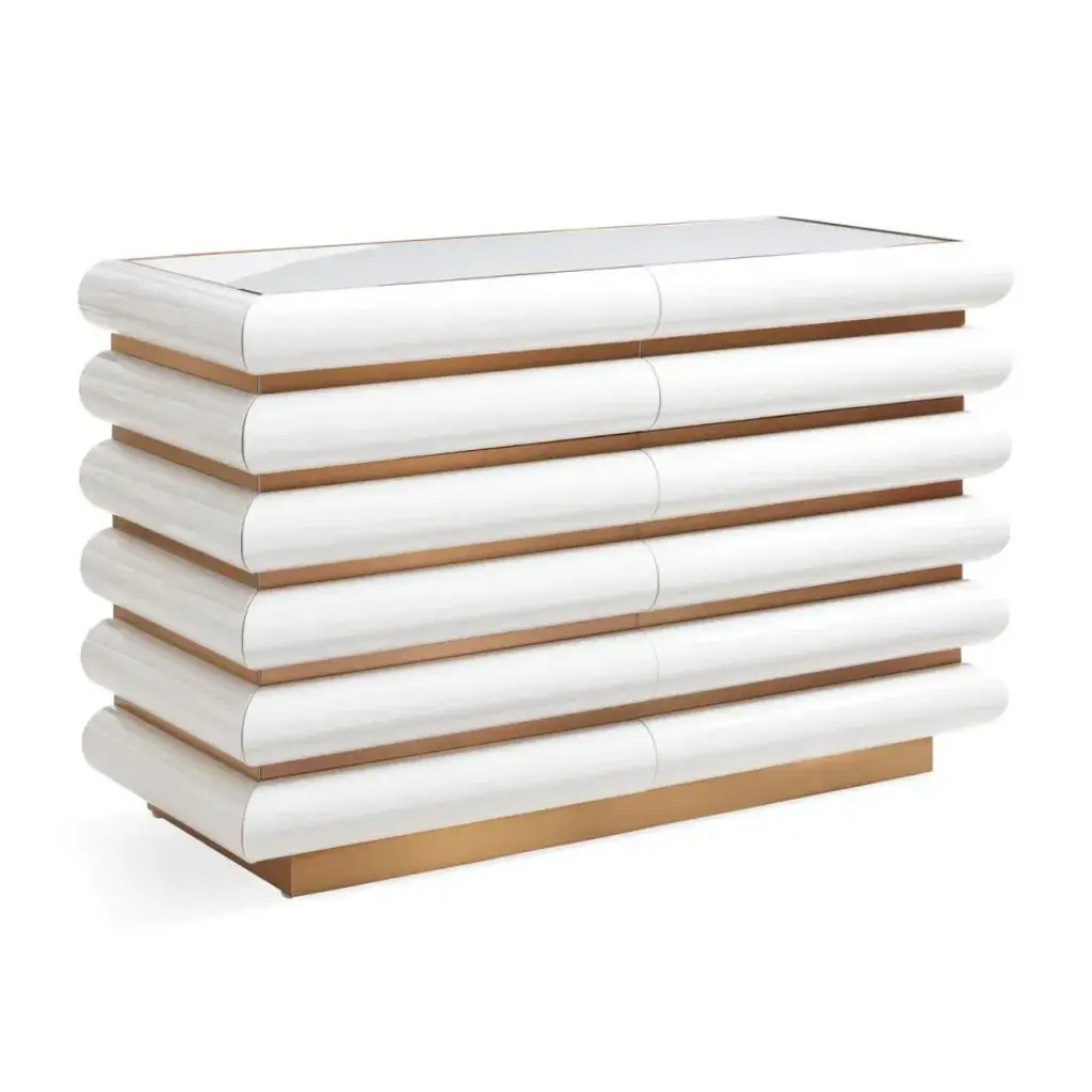 Floating on a recessed base, our Kiki dresser features a brushed brass cabinet faced with puffy capsules in glossy deep teal or ivory lacquer. Topped with ivory back painted glass and fitted with six velvet-lined interior drawers for stashing your stuff. Fabulously futuristic in a grand foyer and just as glamorous in modern boudoir.