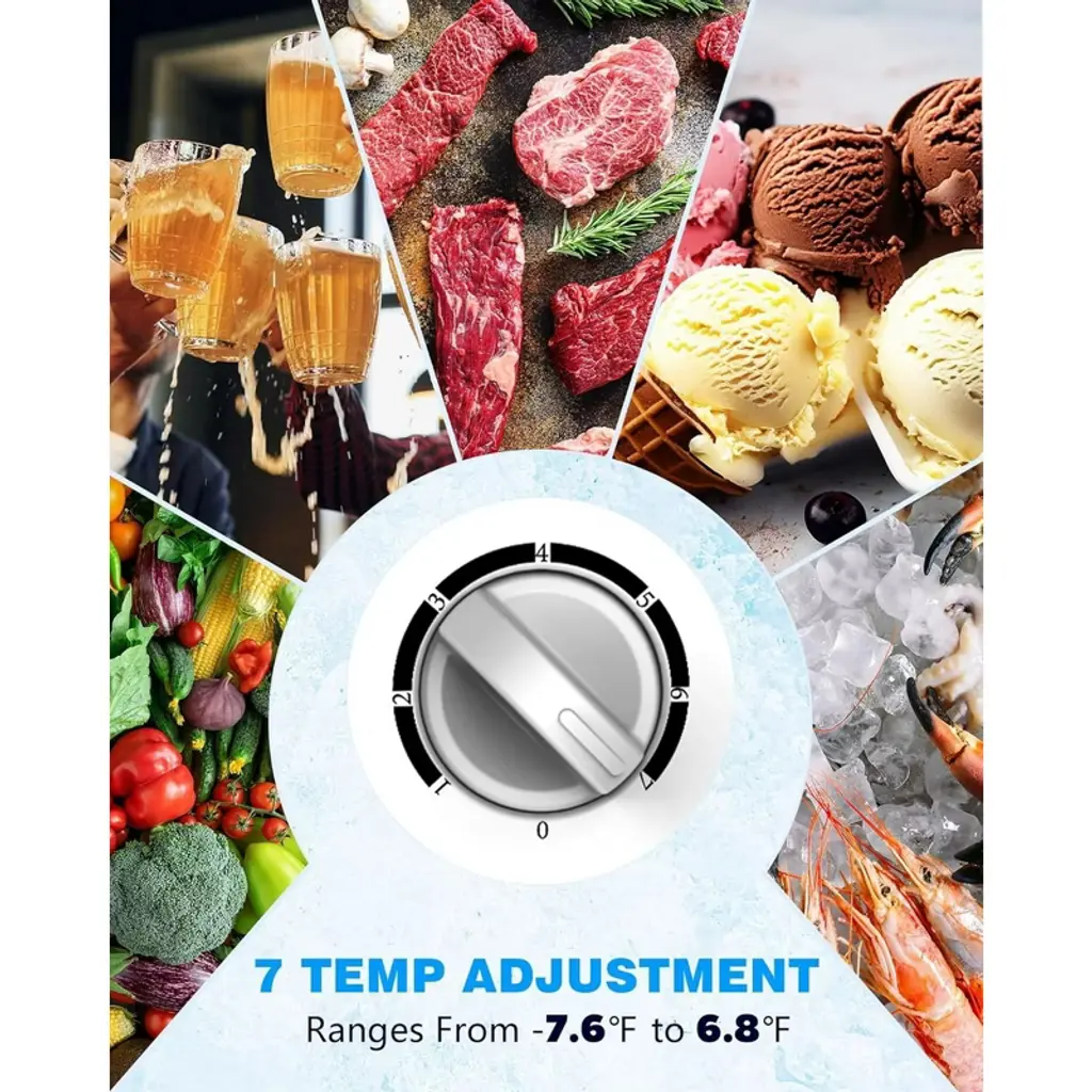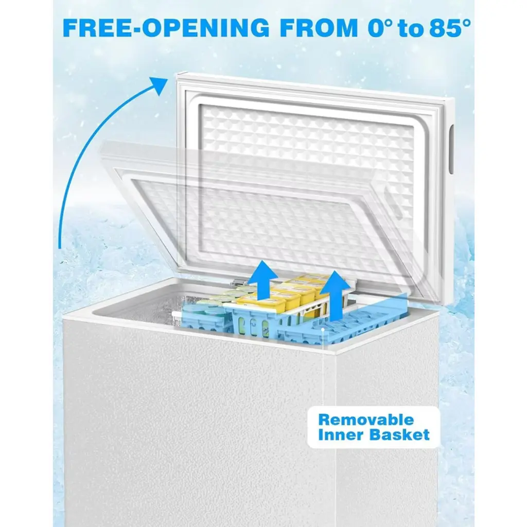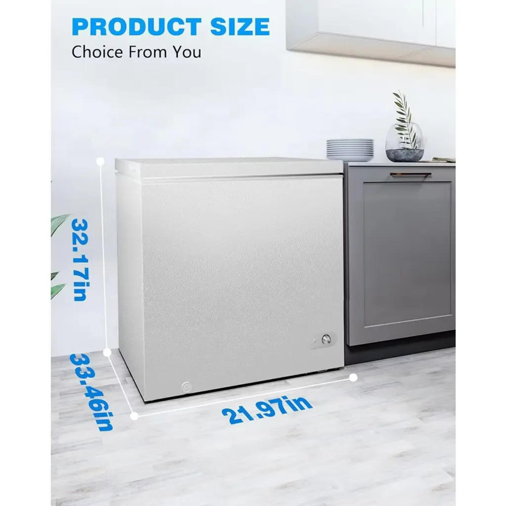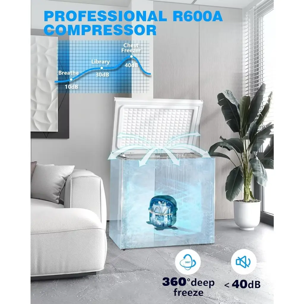 This high-performance chest freezer delivers massive 7.0 Cu.ft storage capacity, completely eliminating storage anxiety for frozen foods, beverages and refrigerated essentials. Designed for energy efficiency, it features an R600a high-efficiency compressor that cools rapidly while consuming only 0.68 kWh daily, making it both environmentally friendly and budget-conscious. The ultra-quiet operation maintains below 40 decibels for undisturbed use. Precision temperature management is achieved through its 7-level adjustable control system, accommodating diverse storage needs. Practical design elements include space-saving bottom drainage for easy cleaning/defrosting and flexible placement in kitchens, garages or offices. The balanced hinge system maintains door angles between 45-85° for effortless access, supported by durable metal hinges that prevent door detachment. Enhanced insulation comes from high-density foam layers and tight door seals, working with the premium hinge mechanism to extend freezing duration while operating silently.