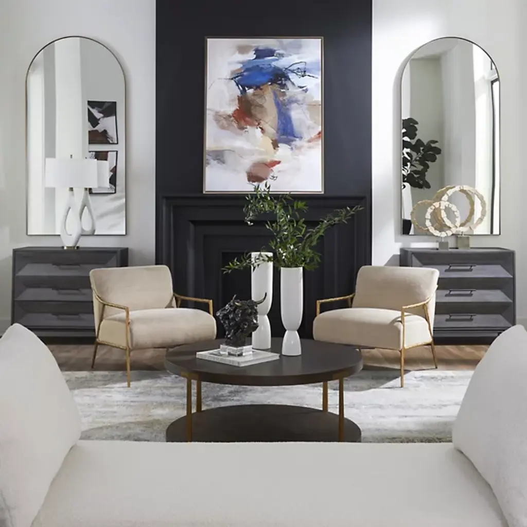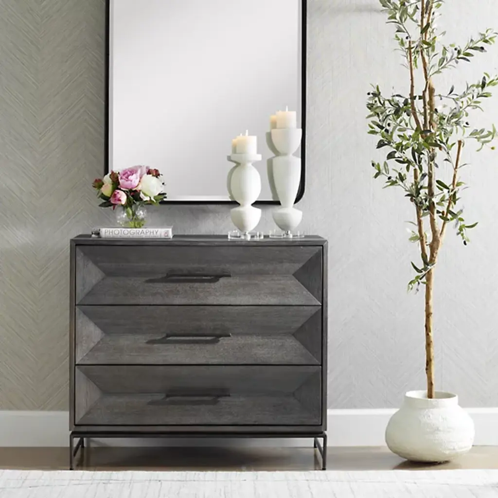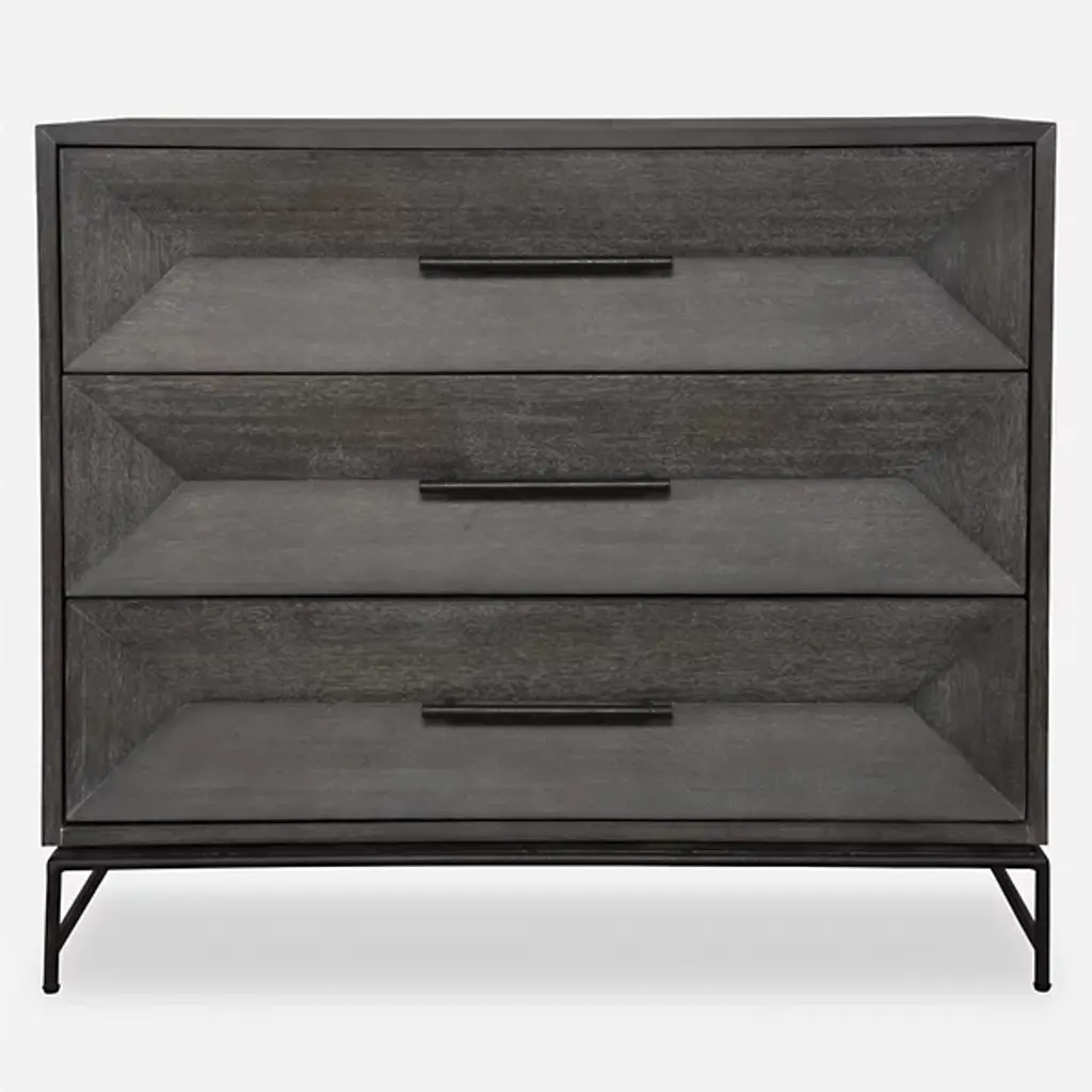 The Knox Accent Chest from Uttermost, crafted by Matthew Williams, features three spacious drawers in acacia veneer. The metal hardware provides easy access to each drawer, while the iron legs add stability and lift the piece off the floor. The chest’s construction combines MDF backing with wood veneer for durability and consistent performance. The drawer mechanics are engineered for smooth operation and quiet closing. This chest suits bedrooms, living rooms, or any space needing additional storage, with its proportions allowing it to fit various room sizes.