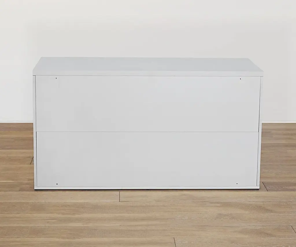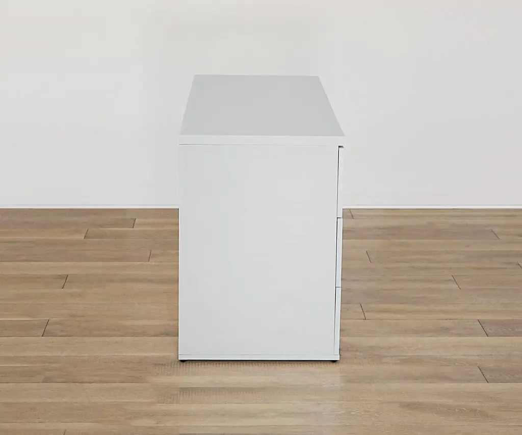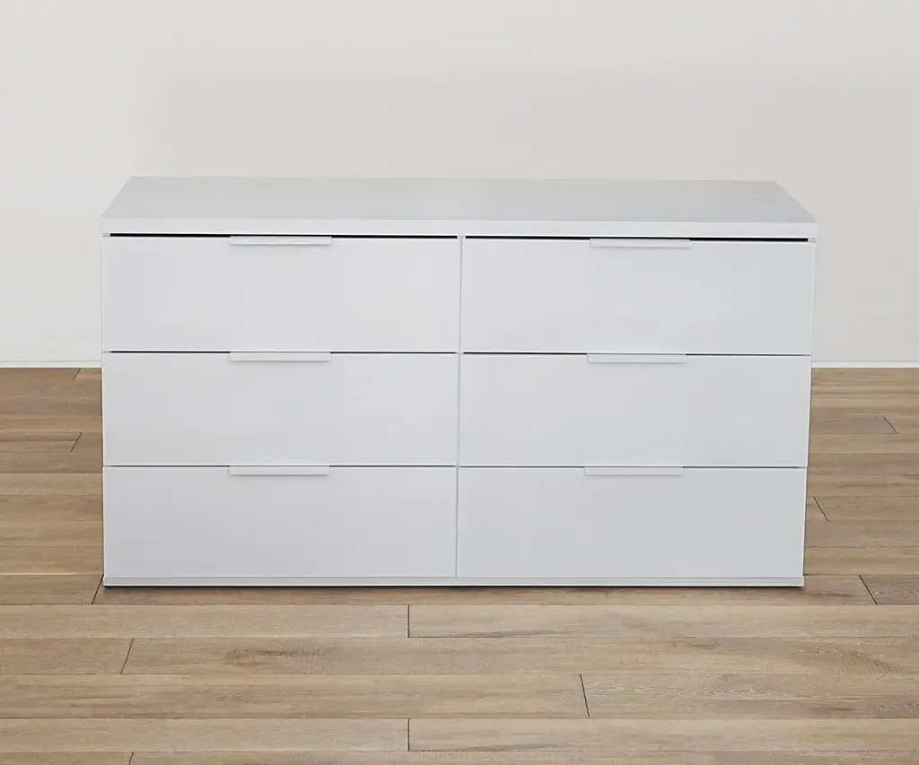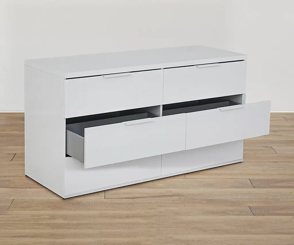 The all-white motif of the Knox Double Dresser brings sleek contemporary style to your bedroom. Made in Italy and featuring a striking high-gloss finish, this piece comes with eight drawers to provide you with ample storage and opportunity to sort and organize your bedroom necessities. Minimalistic white metal handles complete the clean-lined look of this piece. Pair this piece with the rest of the Knox Collection to complete the elevated contemporary look of your home. Requires assembly. Made in Italy from 100% recycled eco-friendly materials, this piece was deliberately produced with minimal environmental impact.