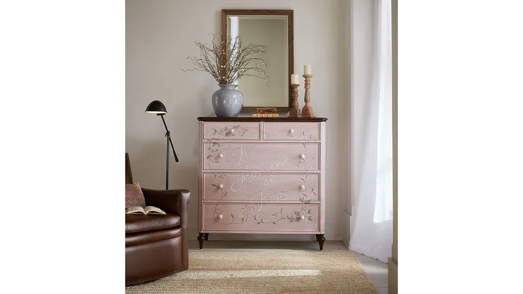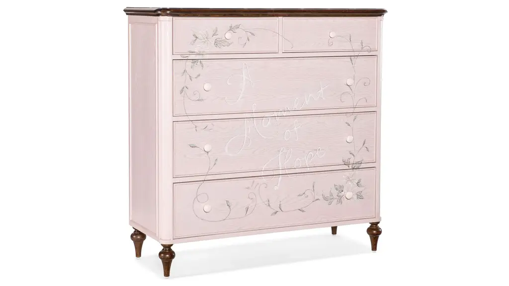 Beautiful and uplifting, the Komen Accent Chest has a serene pink finish with handpainted lettering and delicate floral accents on the drawer fronts. The five self-closing drawers have creamy white interiors, and a contrasting wood finish is featured on the top and legs. Crafted of Oak and Walnut Veneers, the chest is part of a curated collection to honor the spirit and courage of those battling breast cancer, with a portion of the proceeds from each chest sold going to the Susan G. Komen Foundation.
