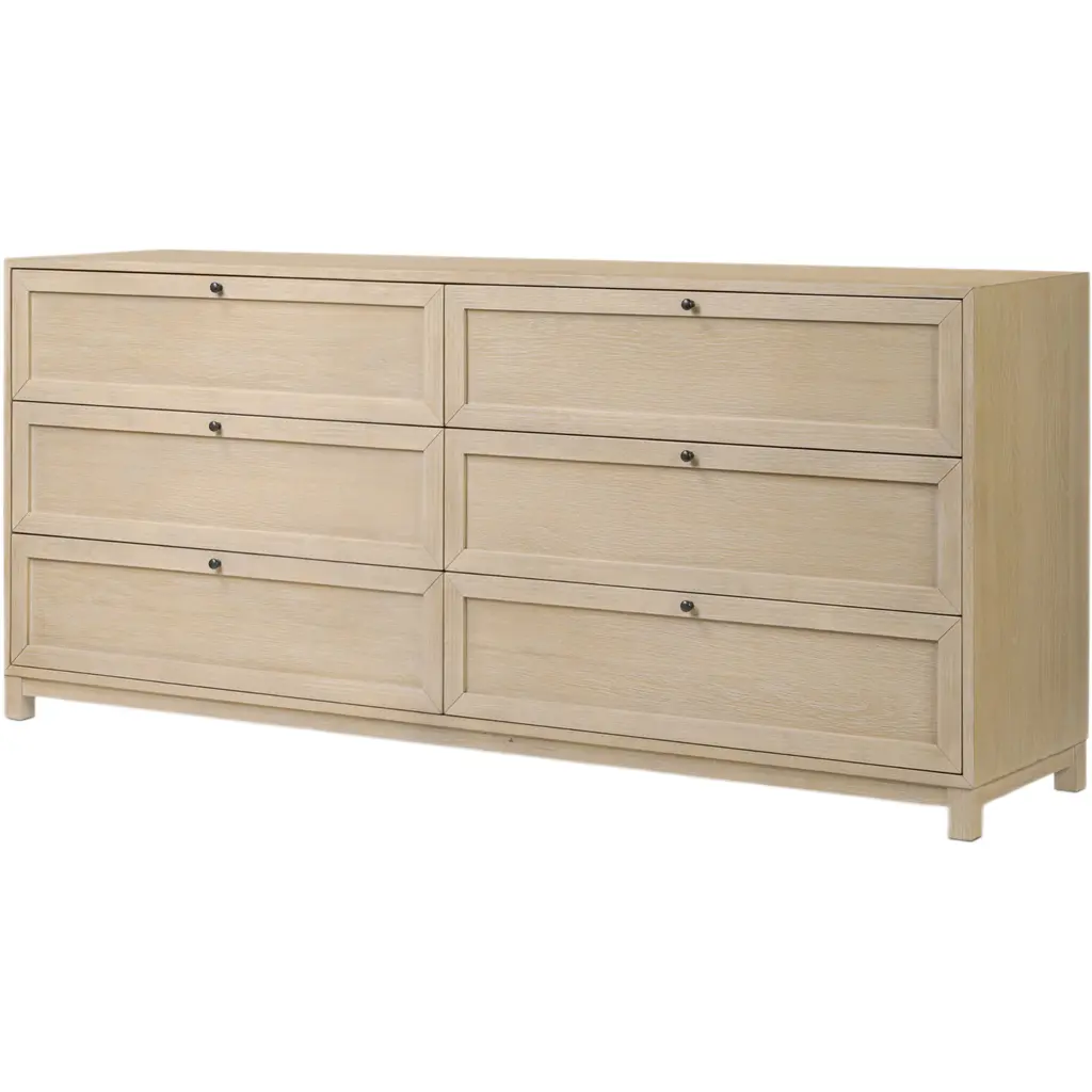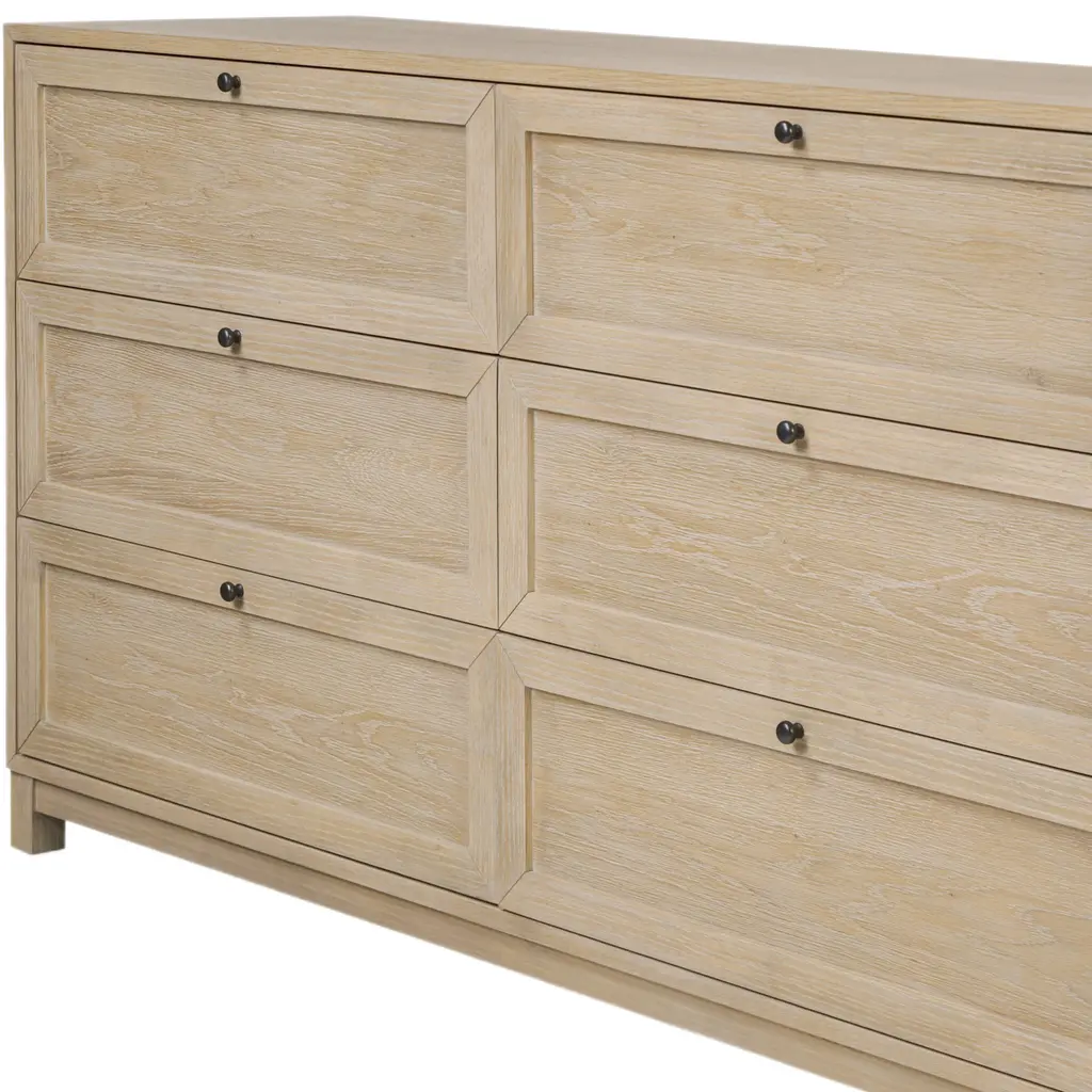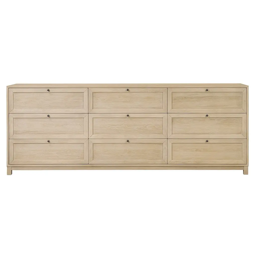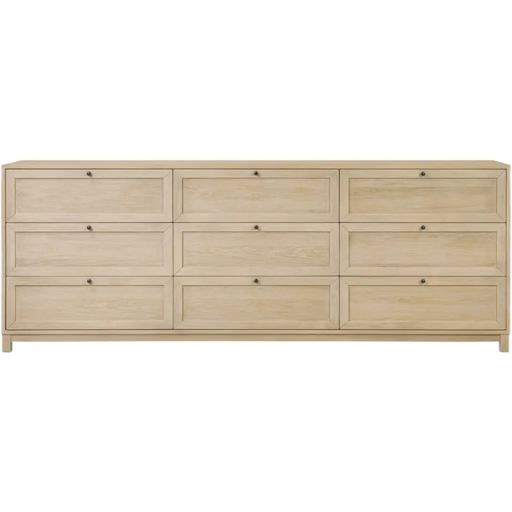 The Laila 9 Drawer Dresser offers a perfect blend of style and functionality. With its nine spacious drawers, each featuring smooth fronts and matching knobs, this dresser provides ample storage space for your belongings. The light oak veneer finish adds a touch of elegance to any room, making it a versatile addition to your home decor. Designed with both aesthetics and practicality in mind, this dresser is a timeless piece that complements a variety of interior styles.