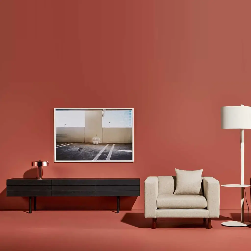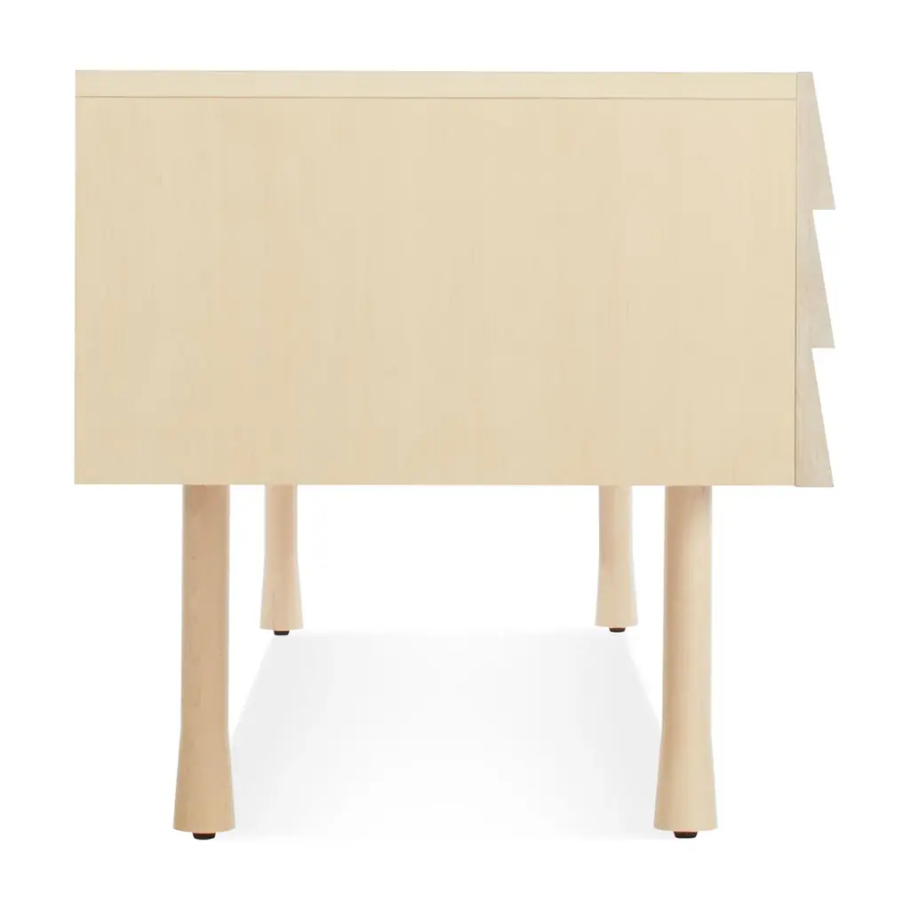 Overlapping wood drawer and door fronts give the collection its name, while the white washed maple finish and a scene stealing leg bring the visual charisma. With soft close doors and drawers. The Long and Low features a center flip-down door flanked by two doors with adjustable interior shelves. Features