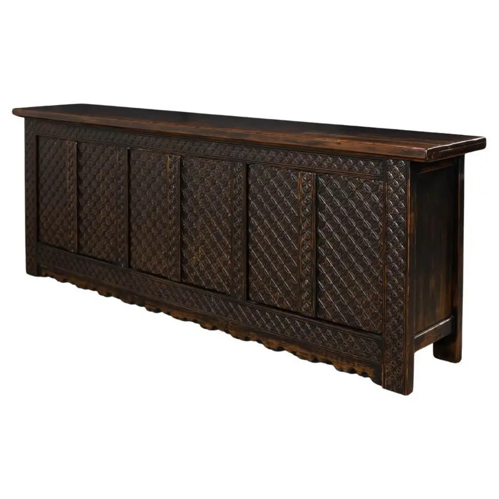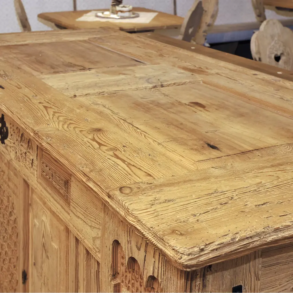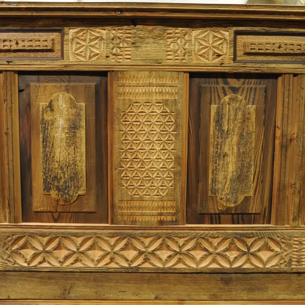 This stunning chest is an exquisite example of masterful craftsmanship and traditional design, inspired by the gothic style of the French region of Elsass. Its imposing shape was crafted of 400 to 600 years old larch and carved by hand with stunning bas-relief decorations that grace its front and size. This piece opens by simply pushing a button positioned on the side, thanks to a hydraulic system, which is also available equipped with a remote control. This chest is also available in a smaller size - please ask the Concierge for details and changes in pricing with different options.