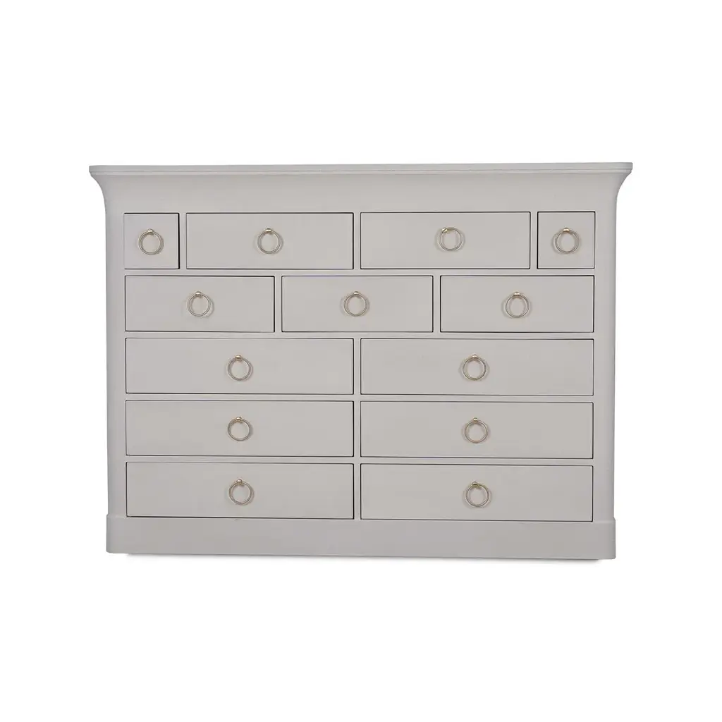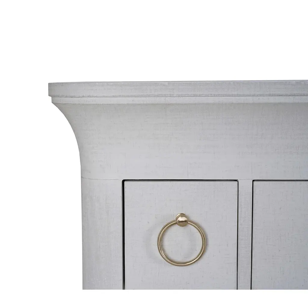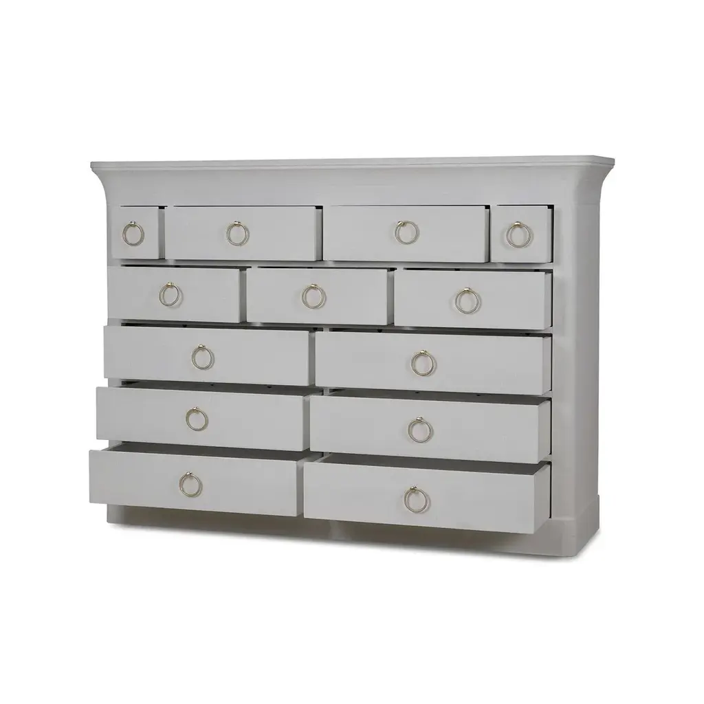 A perfect blend of elegance and functionality for any modern bedroom. This exquisite piece is meticulously wrapped in luxurious dove white linen, offering a sophisticated texture and a soft, neutral tone that complements a variety of interior styles. The thirteen spacious drawers provide ample storage for your clothing, accessories, or household essentials, while the sleek gold ring pulls add a touch of refined glamour. With its clean lines and understated design, this chest is an ideal addition to bedrooms, living rooms, or entryways, bringing both style and practicality to your home. Dimensions: 71" W x 20" D x 51" H