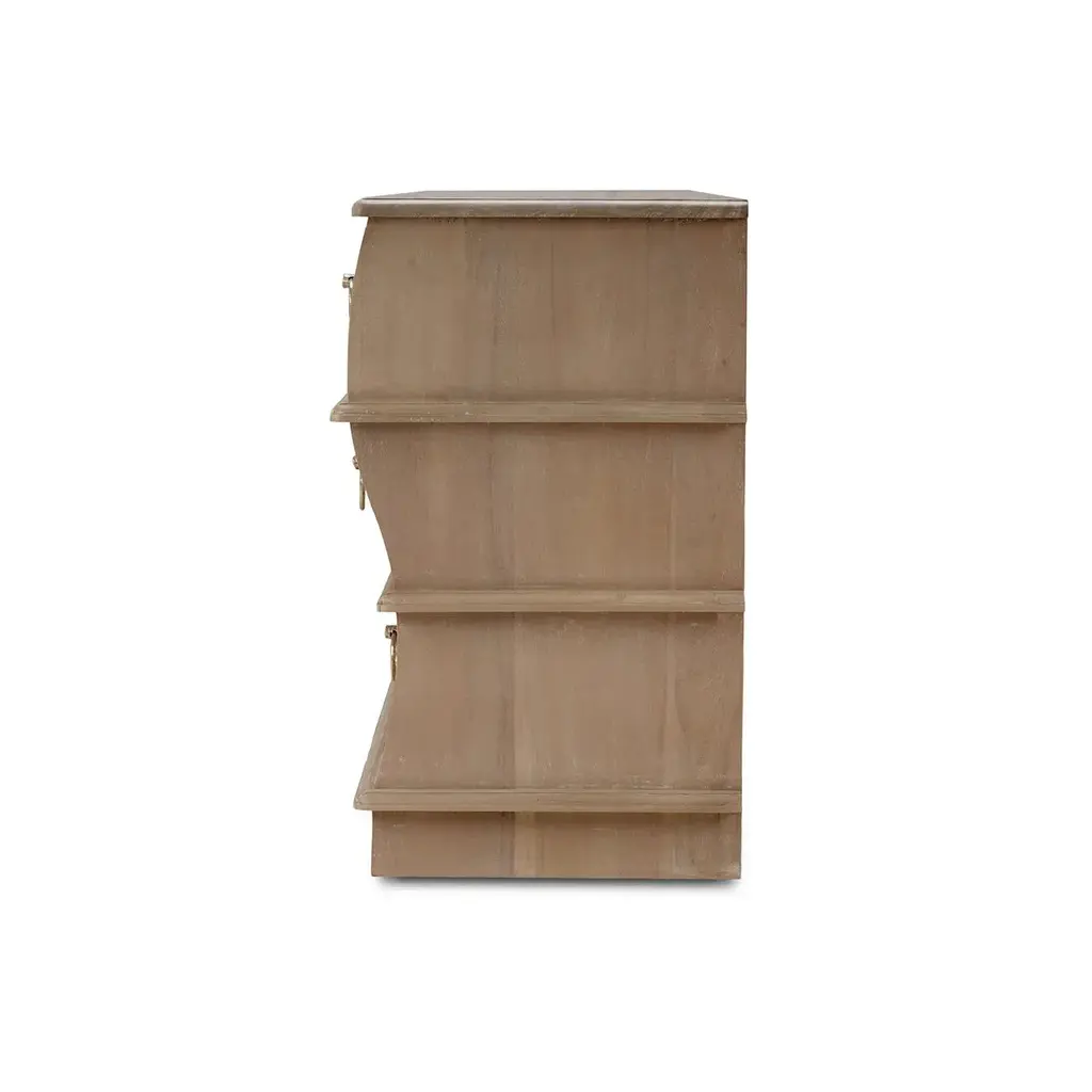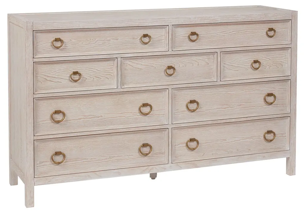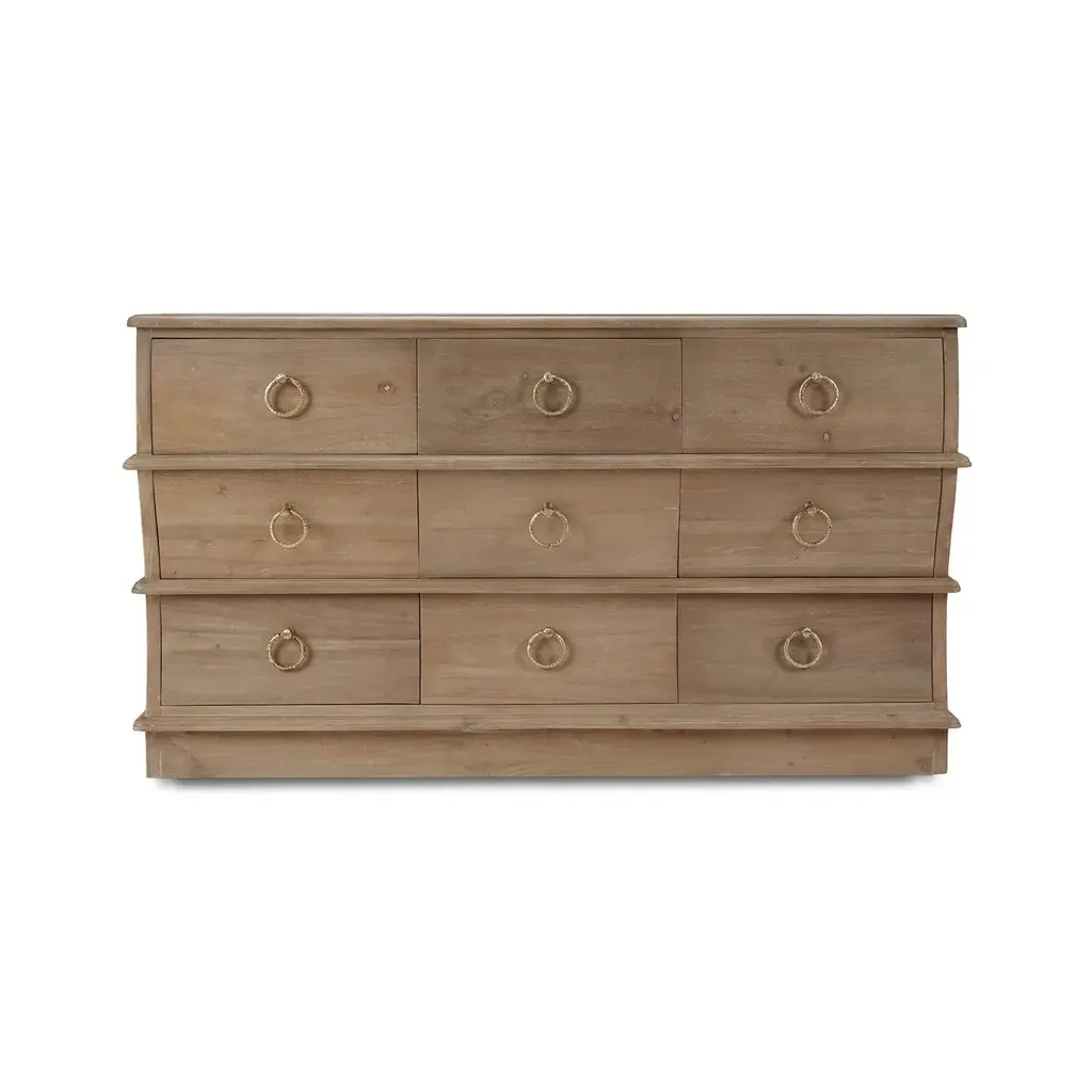 Crafted from solid mahogany, this dresser features a distinctive serpentine front that adds a unique touch of sophistication to any room. The natural wood sandbar finish highlights the beautiful grain and texture, creating a warm and inviting aesthetic. With its nine spacious drawers, each drawer is adorned with elegant gold ring pulls, enhancing the dresser's refined appearance, this dresser offers ample storage for all your essentials, making it both a stylish and practical addition to your home. Dimensions: 65" W x 22" D x 37" H