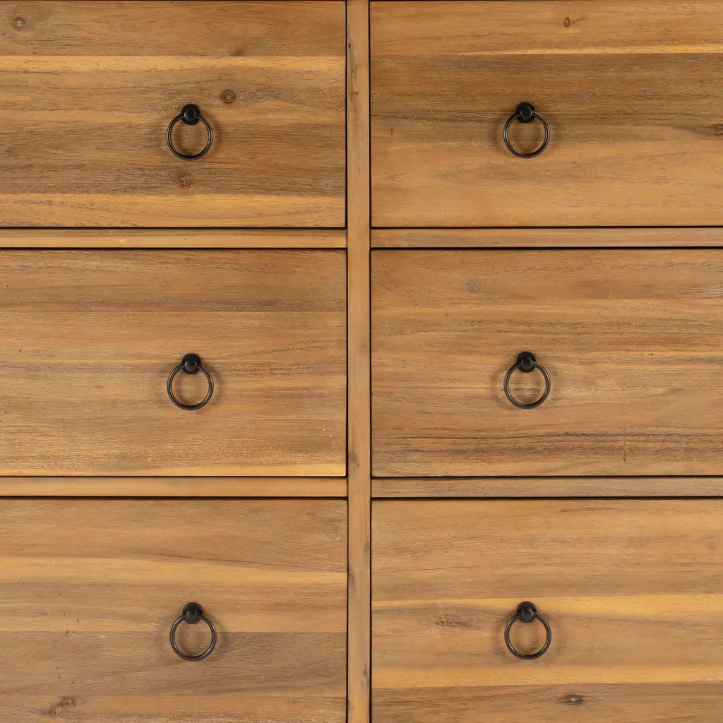 The minimalist design of this stylish dresser makes it an ideal addition in any contemporary space. Crafted from acacia or pine Wood solids and engineered Wood products, it features six drawers with ring pulls, for a hint of glam, and ball bearing glides for easy opening and closing. Each drawer interior is smooth to the touch to protect clothing and will provide ample storage for anyone with a sizable wardrobe. Available in white, navy, and natural wire brush finishes. Durably Constructed With: Acacia Wood Solids, MDF, Acacia Veneer Product Construction Features: Metal Slide,Finish Distressing Product Assembled Measurement & Weight: 35.25" H x 60.0" W x 18.0" D -- 152.0 lbs. 200 lbs. Suggested weight capacity Item Arrives: Assembled Wood, like all natural materials, has inherent disparities in color and grain pattern. Variations in shade and markings are normal and can be expected with the natural materials used in the construction of this product. Photo may slightly differ from actual item in terms of color/finish due to the lighting during photo shoot or the monitor's display.
