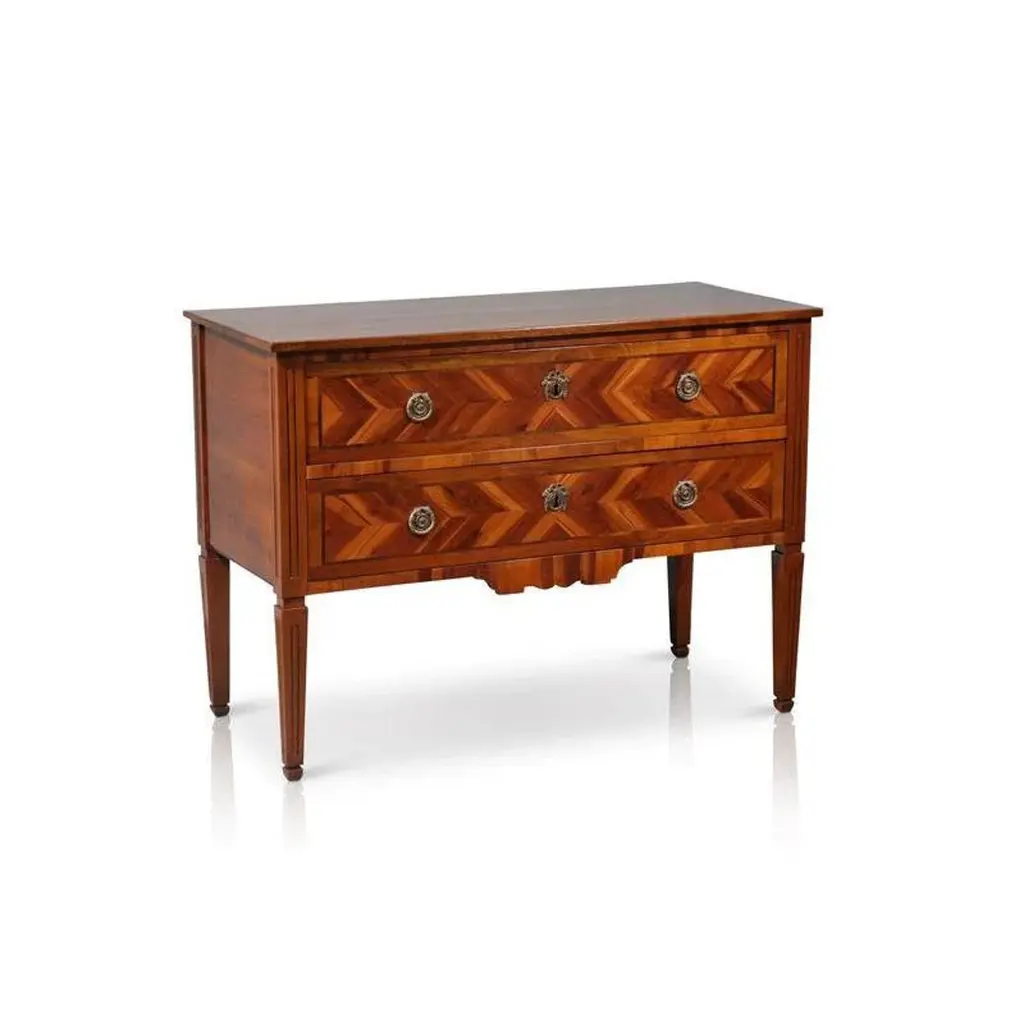 This late 1800’s English Walnut Parquetry Commode comes with its Original Key and was purchased by us in Italy. It has a stunning almost herringbone type of marquetry on the front patina and is in impeccable restored condition. Pieces of this nature don't come along often. A showpiece for ones interior, whether that be a formal lounge or bedroom. The size of this product:Width: 52 cmLength: 115 cmHeight: 83 cm.