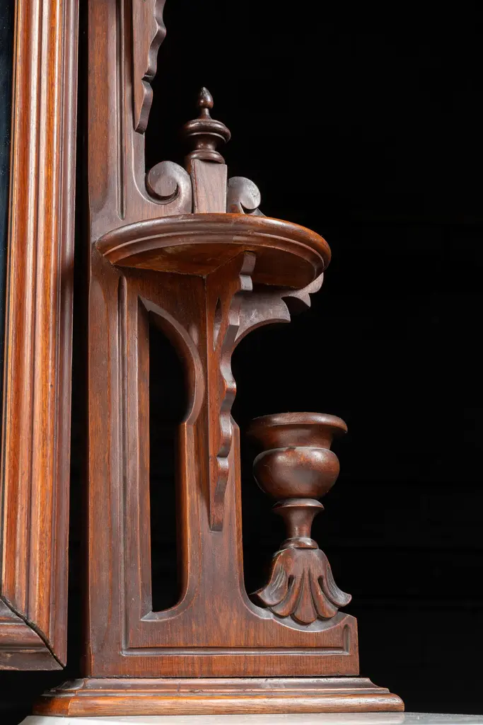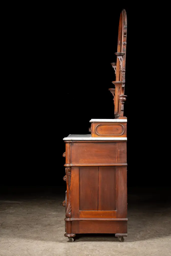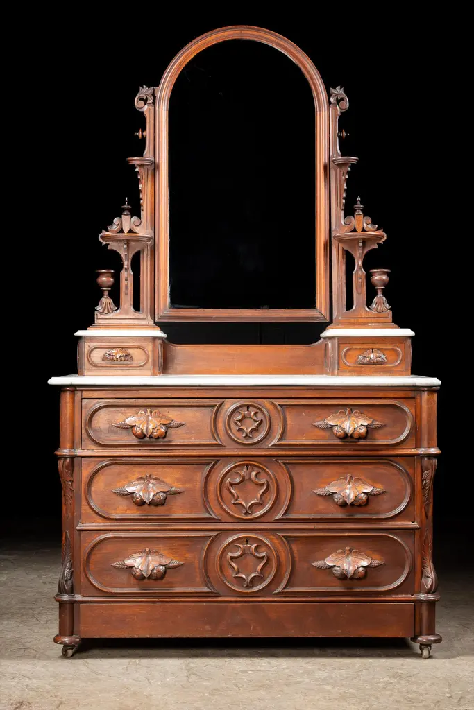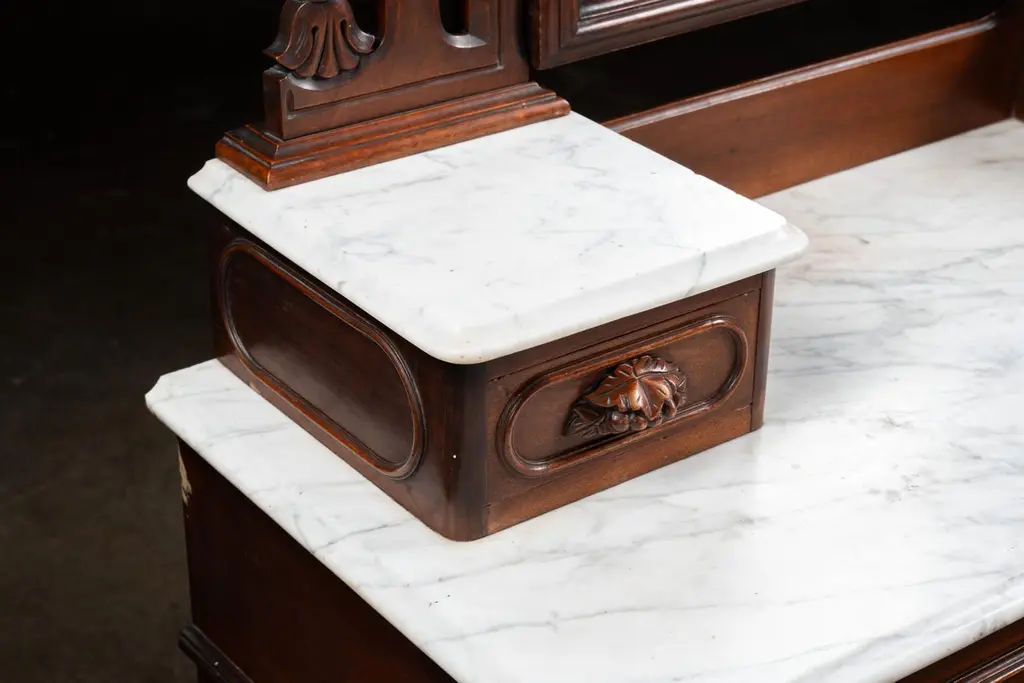 Antique Victorian dresser and mirror.Crafted from walnut, this vanity dresser hearkens back to a time of superior American craftsmanship. Features a curved marble top with twin jewelry or catchall boxes, optimal storage, and gorgeous raised leaf motif pulls and adornments. A large mirror is housed between two large columns, flocked on all sides by the same leaf embellishments, though these have a more scrolled appearance.45.5" W x 20.5" D x 79" HBoxes (x2): 7.25" W x 8.75" D x 2.5" HDrawers: 38.5" W x 15.5" D x 5" HPlease refer to photos regarding condition.