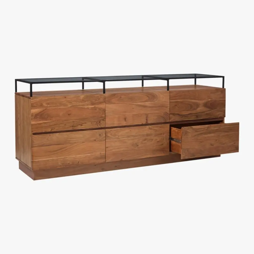 Slim black iron frame floats atop six solid acacia wood drawers and tops dresser off in clear glass. Best of both storage worlds, open shelf displays jewelry/sunnies/accessories while drawers hold everyday essentials. CB2 exclusive.