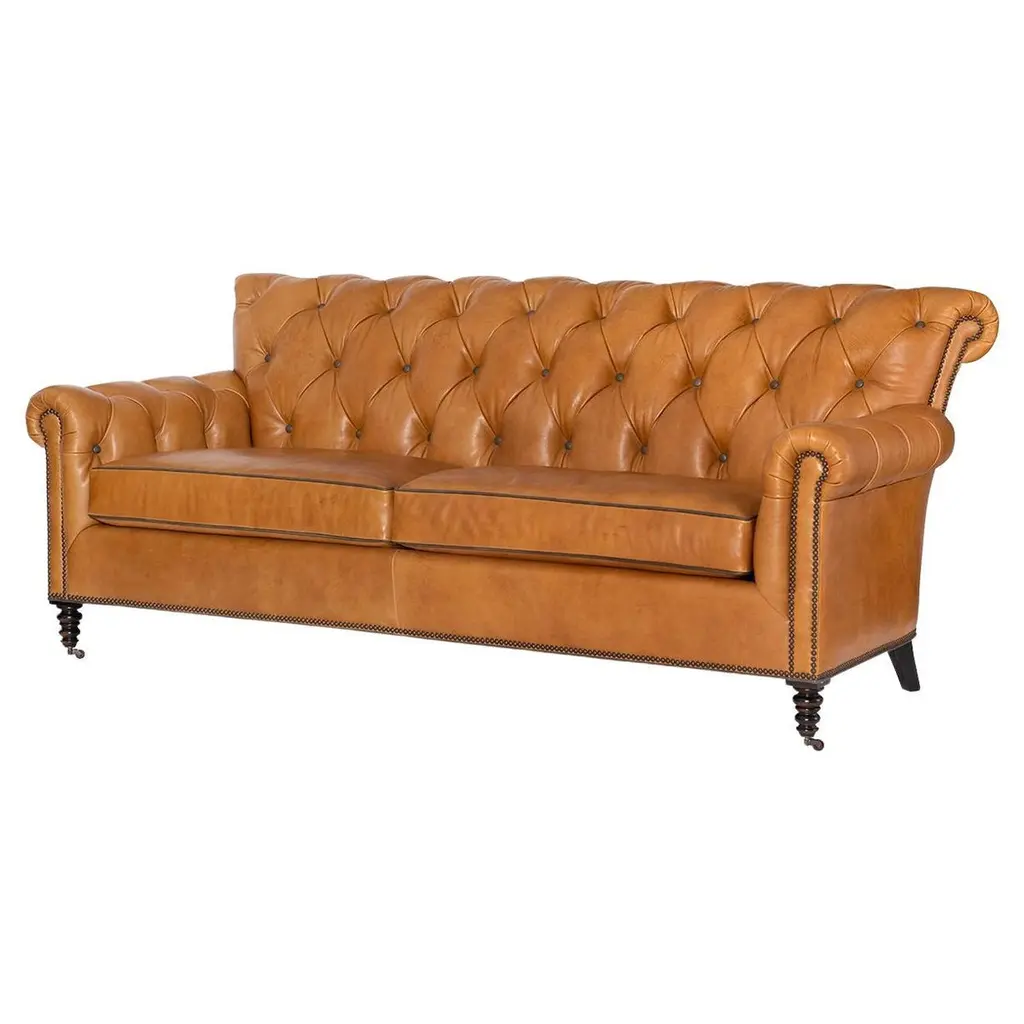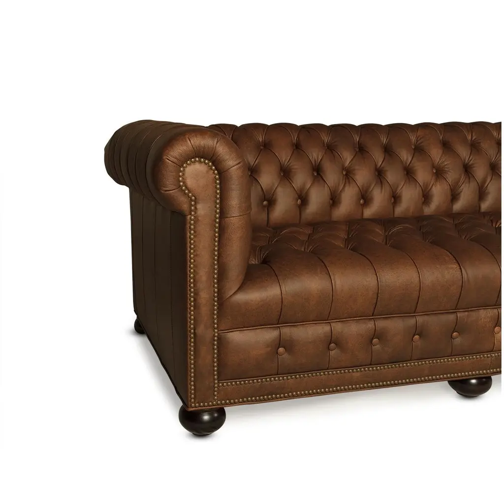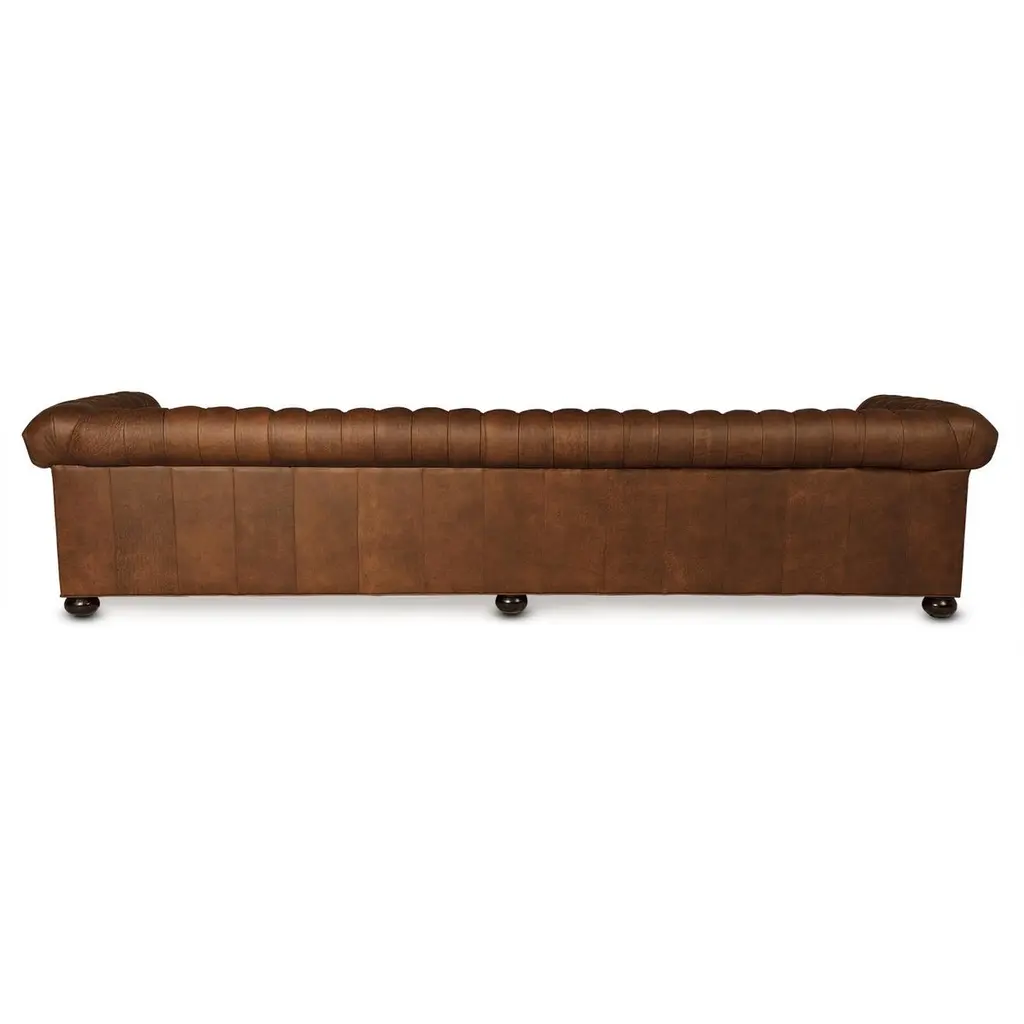 A classic long leather 4 seater Chesterfield sofa. The unusual long tufted chesterfield sofa is ideal for a long entry hall, living room, a hotel lobby, or a public waiting area. Covered in a "Protected Leather" for additional protection and durability it will withstand heavy use and staining.Made in the USA by our world-leading craftsman in Hickory NC. Constructed of solid mapleNailhead Trim DetailsTight button Tufted backrest and seatCustom options also availableDimensions: 131" W x 37" D x 31" HSeat - 18" H x 24" D x 103" WCovered in Run Wyld Tree Climb, a unique 'Protected Leather'. The dusty cowboy look of the leather is hand-sanded by craftsmen to give you a random two-tone effect. With a distressed look and softness, it also provides stain protection and wearability. Made in the USA by our top craftsman in Hickory, NC.