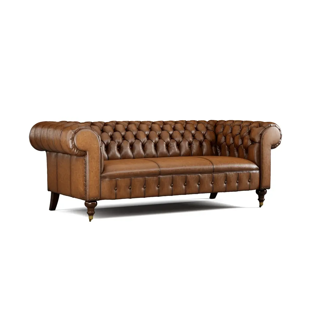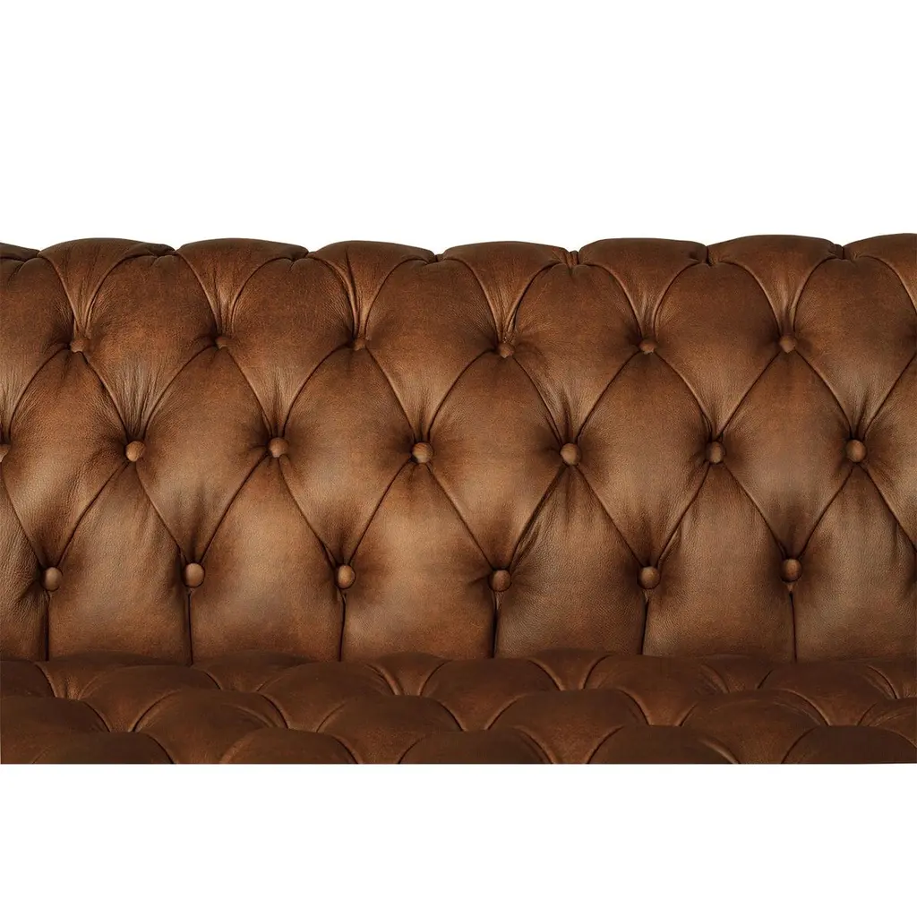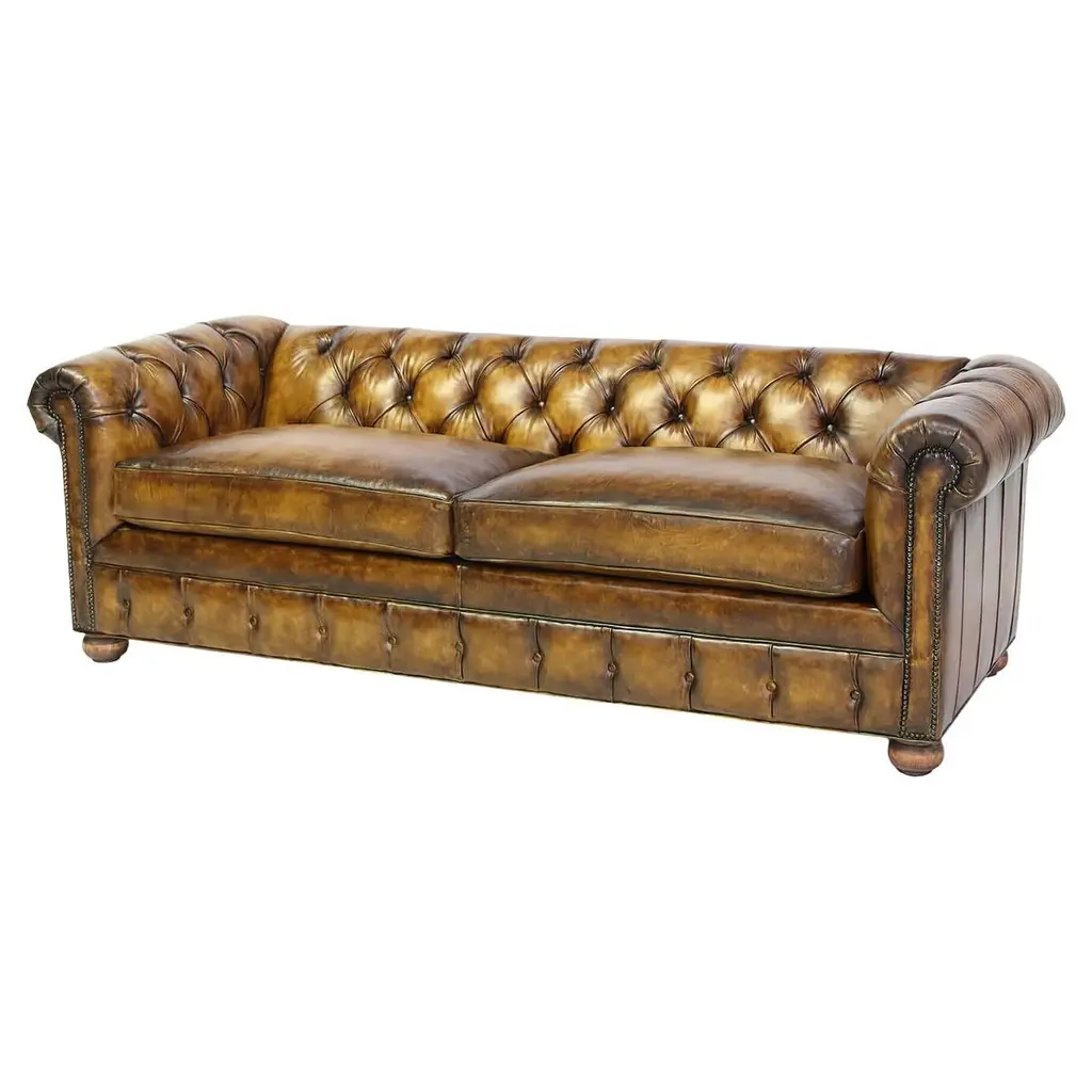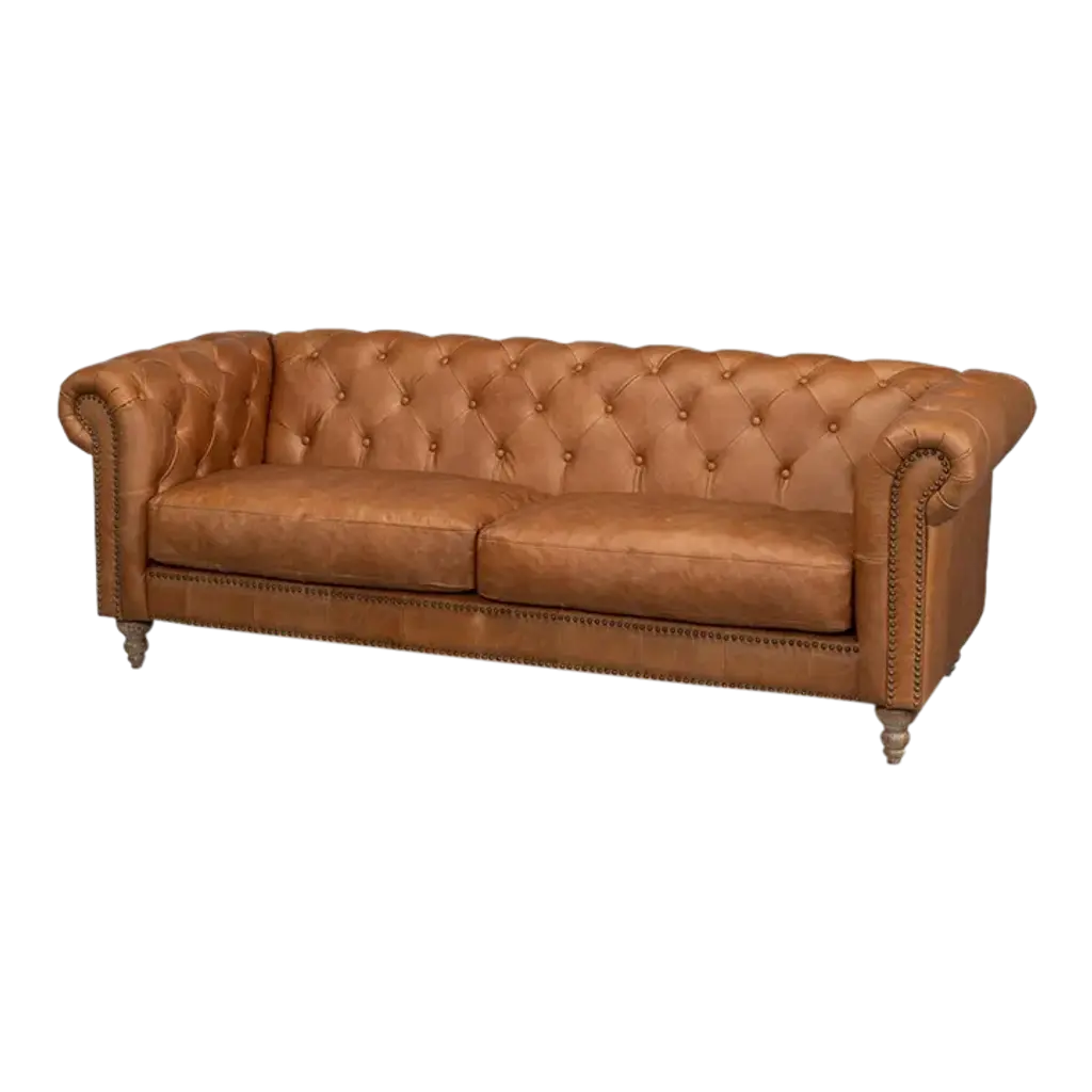 A classic long leather 4 seater Chesterfield sofa. The unusual long tufted chesterfield sofa is ideal for a long entry hall, living room, a hotel lobby, or a public waiting area. Covered in a "Protected Leather" for additional protection and durability it will withstand heavy use and staining.Made in the USA by our world-leading craftsman in Hickory NC. Constructed of solid mapleNailhead Trim DetailsTight button Tufted backrest and seatCustom options also availableDimensions: 131" W x 37" D x 31" HSeat - 18" H x 24" D x 103" WCovered in Run Wyld Tree Climb, a unique 'Protected Leather'. The dusty cowboy look of the leather is hand-sanded by craftsmen to give you a random two-tone effect. With a distressed look and softness, it also provides stain protection and wearability. Made in the USA by our top craftsman in Hickory, NC.