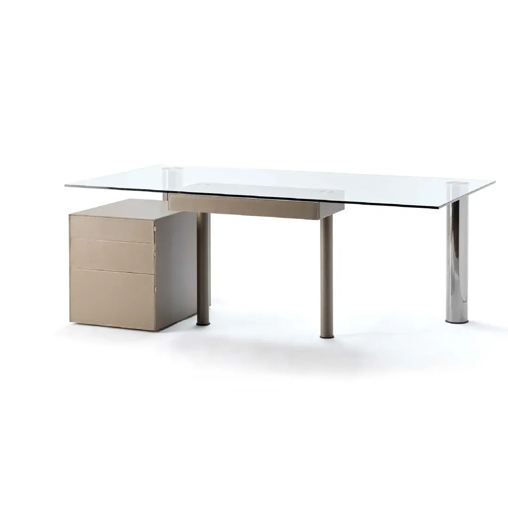 Ala is the desk drawer unit made of MDF on wheels. Equipped with two drawers and a document holder. The interior is painted black, and the exterior is fully covered in full-grain Fasem leather. The accompanying tabs for opening are made of full-grain Fasem leather. It can be used freely as a complement or in harmony and support with the Abaco executive desk.