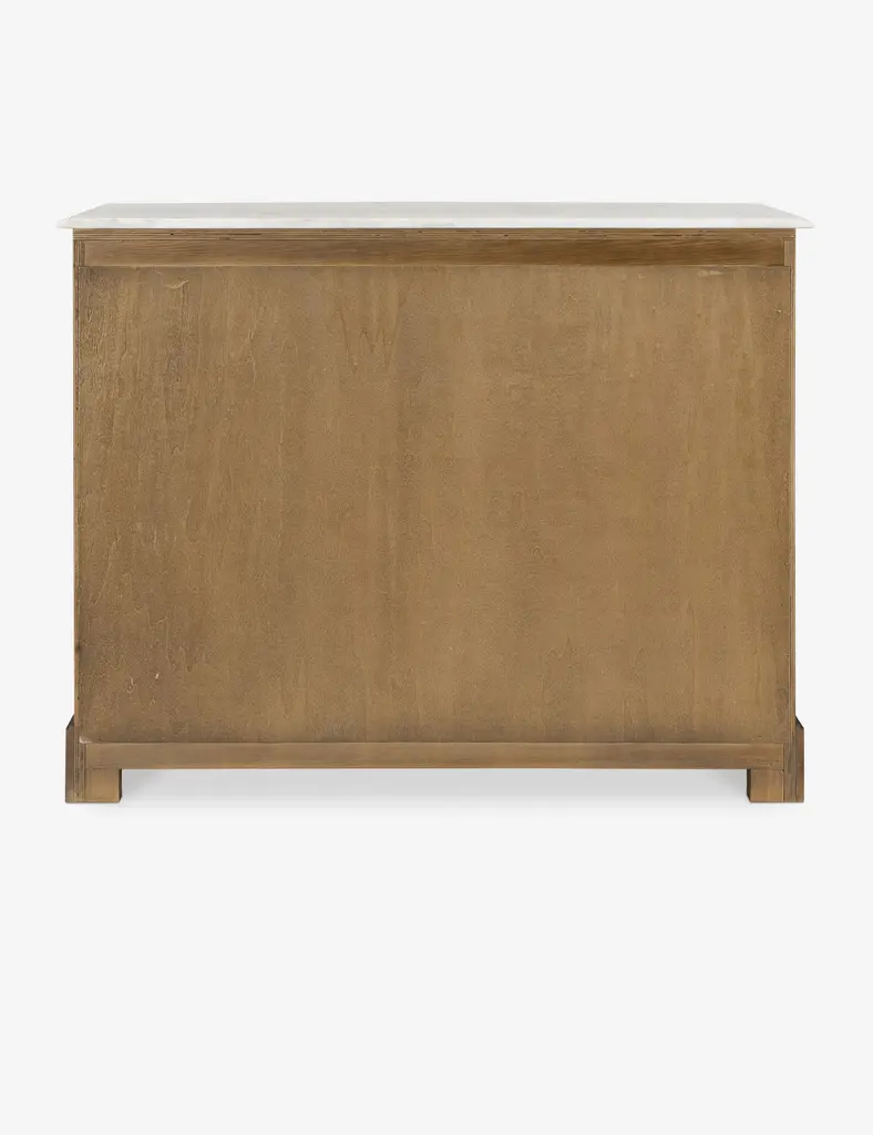 Four Hands brings their exceptional craftsmanship to a timeless collection rooted in Amber Lewis' perennial California style. Spiced oak finishing highlights the beautiful grain details of this five-drawer dresser with brass hardware. A polished white marble top adds sophistication, a perfect balance for a storage piece with style.
