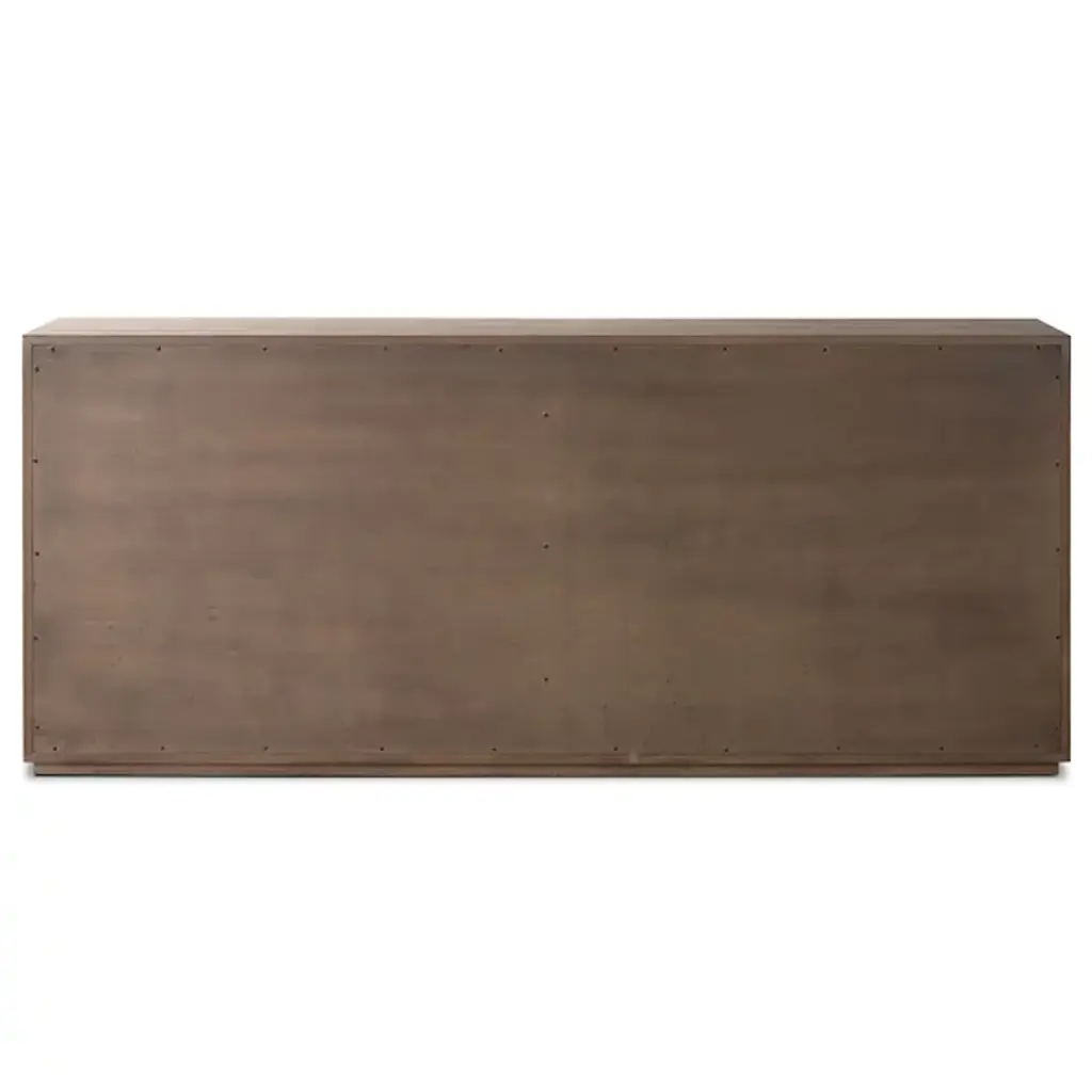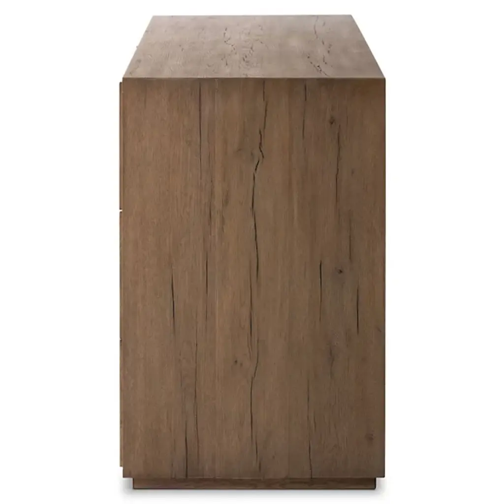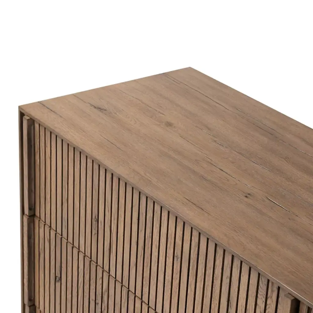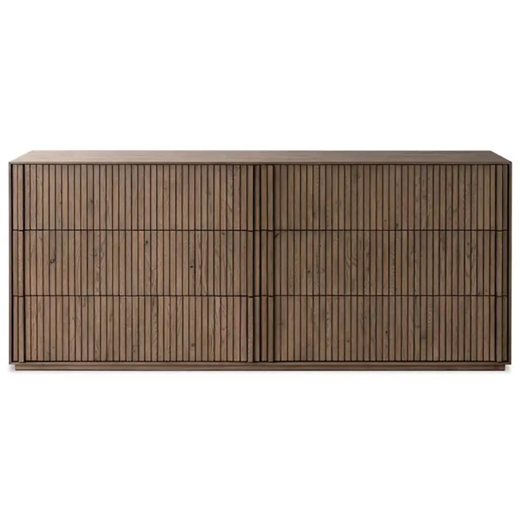 The Leo 6 Drawer Dresser from Four Hands unites Brazilian artistry with minimalist design principles through the collaborative vision of Thomas Bina and Ronald Sasson. The meticulous vertical reed detailing creates a fascinating pattern across the drawer fronts, while integrated wooden pulls maintain the clean aesthetic. Crafted from solid oak and thick oak veneer, this piece demonstrates exceptional attention to detail with soft-close under-mount drawer glides. The dresser's presence is enhanced by its precise linear composition, making storage both beautiful and functional.