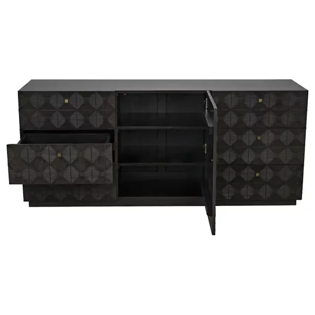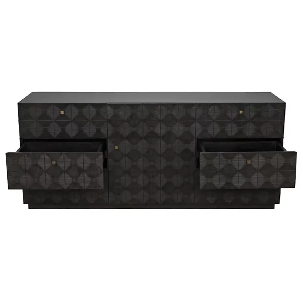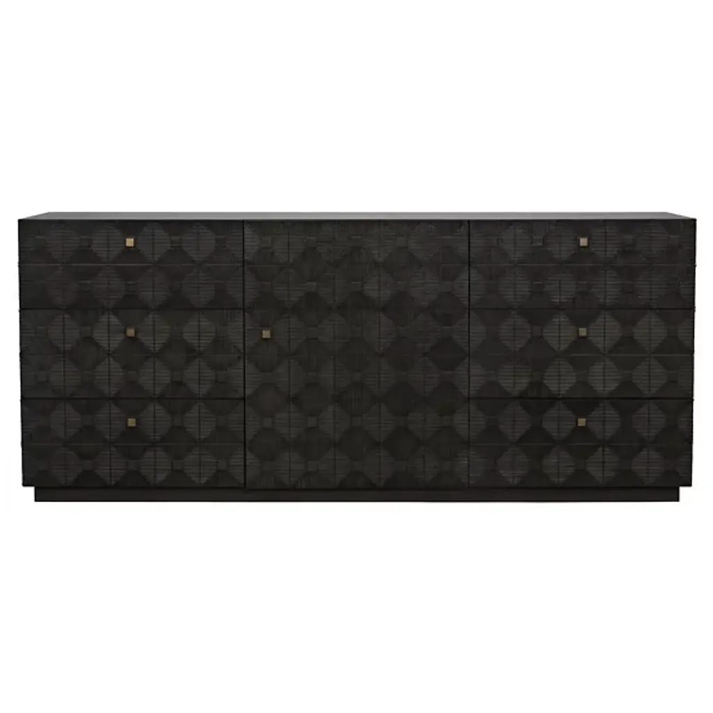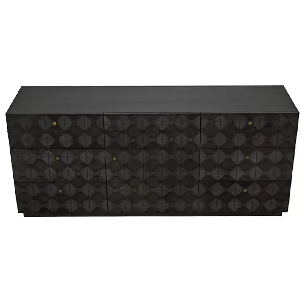The Leon Dresser from Noir showcases intricate geometric detail that creates mesmerizing diamond patterns across six drawer fronts arranged around a central door panel. Each decorative element catches light differently throughout the day, generating dynamic texture across the mahogany veneer. The repetitive diamond motifs flow seamlessly from drawer to drawer while brass hardware provides subtle metallic punctuation. Traditional woodcarving techniques transform simple cabinetry into sculptural storage through patient handwork and symmetrical precision.