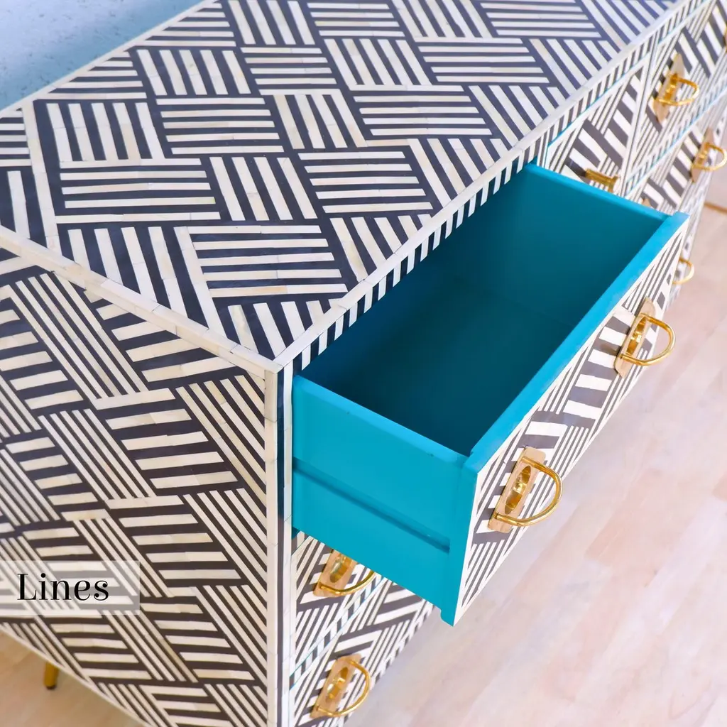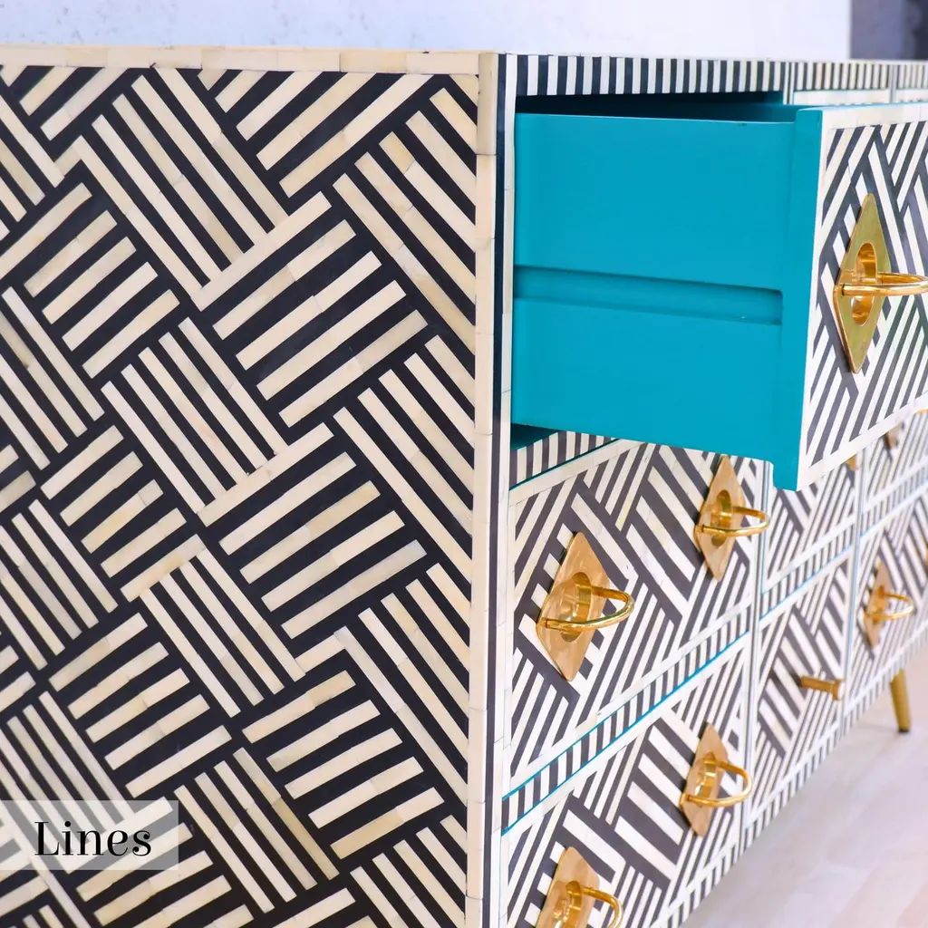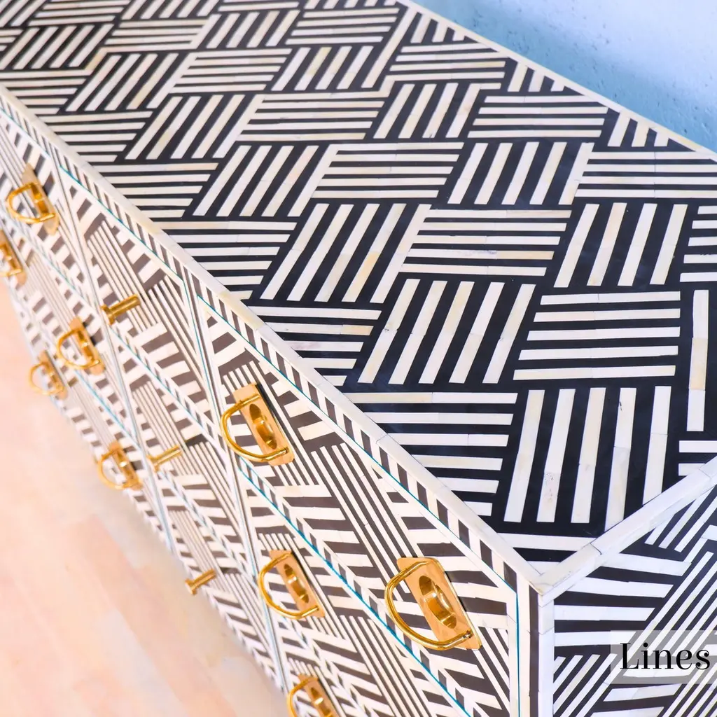 Elevate your home with Artisanal's exquisite black-and-white nine -drawer inlay chest—a stunning addition that seamlessly blends timeless craftsmanship with modern sophistication.Adorned with intricate geometric-stripe patterns, this dresser showcases the artistry of traditional bone inlay, honoring the ancient craft of decorated furniture. Finished with sleek brass-finished metal legs, it exudes a contemporary charm while retaining its classic allure.How It’s Made:Handcrafted with meticulous care, each piece is a true masterpiece, created through a traditional inlay process. It features over 2,000 small pieces of bone, carefully shaped into leaf or custom patterns. Each piece is precisely glued onto the surface to form the intricate design, followed by the application of color to enhance its beauty.Handcrafted in India by the artisans of Artisanal.For added safety during transit, we pack the legs and knobs separately, ensuring your chest arrives in pristine condition.Indulge in luxury and elevate your space with our bone inlay chest—a masterpiece that exudes elegance and sophistication, making it the perfect centerpiece for any bedroom or living room.At Artisanal, our mission is to revive and preserve India’s traditional arts by blending age-old techniques with contemporary design. Every piece we create is a testament to this philosophy, merging the beauty of the past with today’s functionality and aesthetics.For the past six years, with a team of skilled artisans and innovative designers, we’ve crafted every item in-house to ensure the highest quality and attention to detail. Our timeless pieces are designed not only for today but to be cherished for generations.