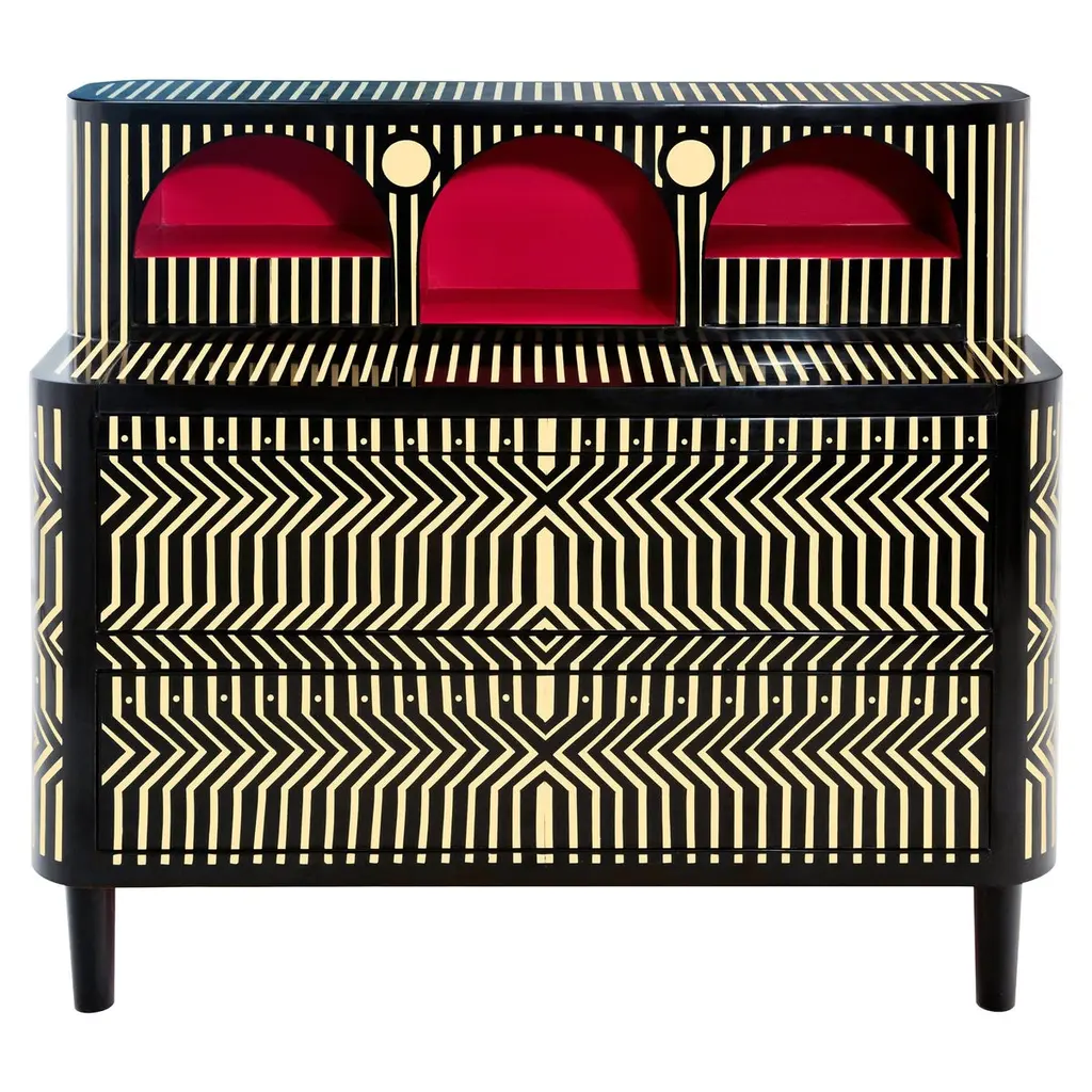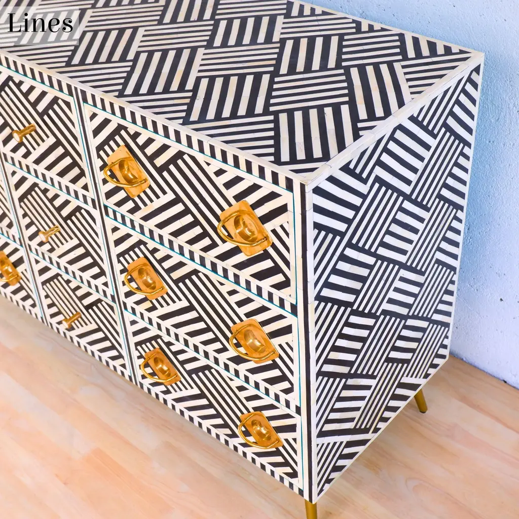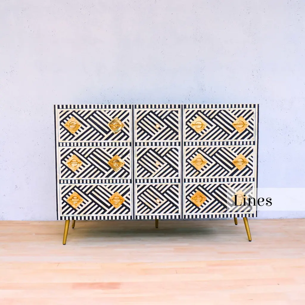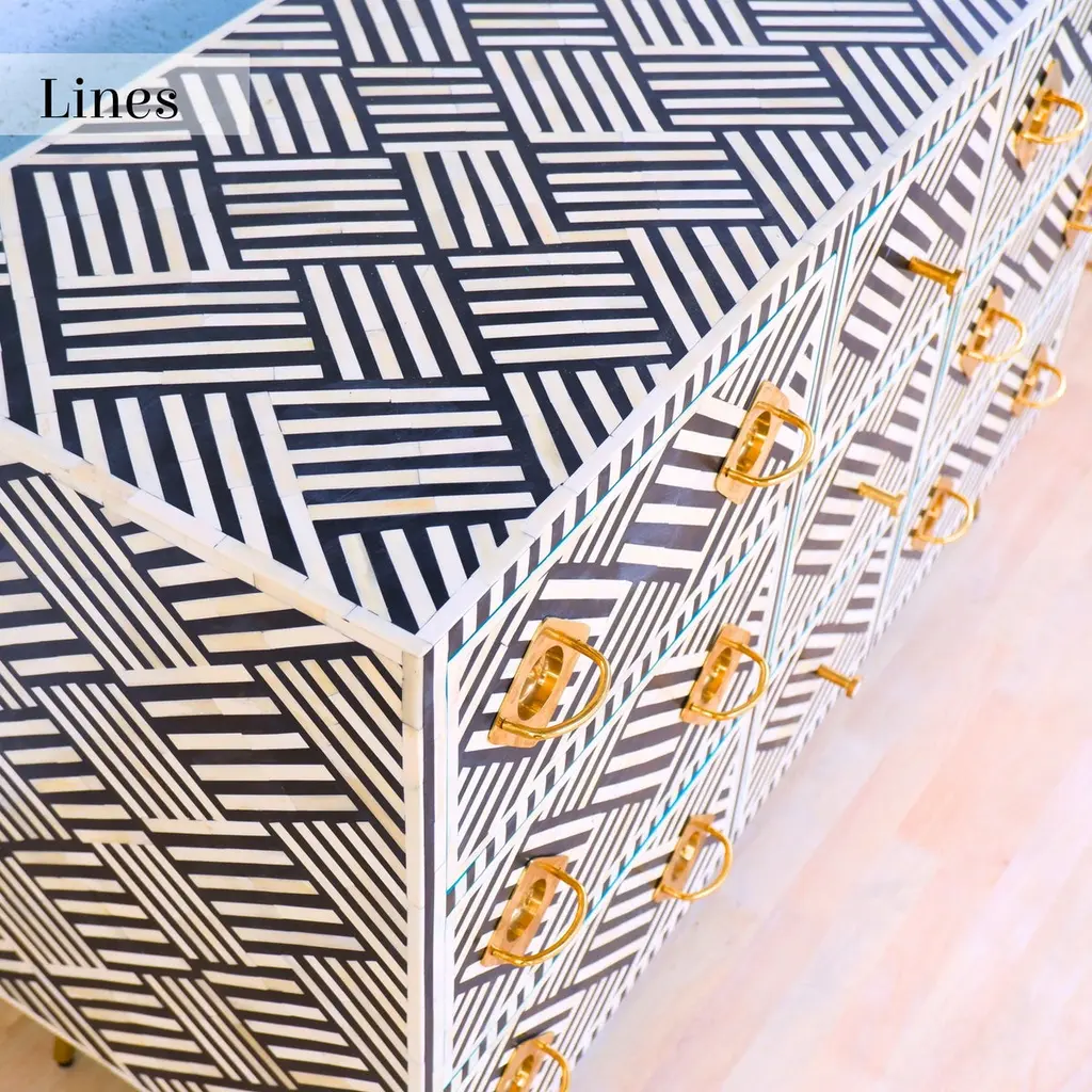 Elevate your home with Artisanal's exquisite black-and-white nine -drawer inlay chest—a stunning addition that seamlessly blends timeless craftsmanship with modern sophistication.Adorned with intricate geometric-stripe patterns, this dresser showcases the artistry of traditional bone inlay, honoring the ancient craft of decorated furniture. Finished with sleek brass-finished metal legs, it exudes a contemporary charm while retaining its classic allure.How It’s Made:Handcrafted with meticulous care, each piece is a true masterpiece, created through a traditional inlay process. It features over 2,000 small pieces of bone, carefully shaped into leaf or custom patterns. Each piece is precisely glued onto the surface to form the intricate design, followed by the application of color to enhance its beauty.Handcrafted in India by the artisans of Artisanal.For added safety during transit, we pack the legs and knobs separately, ensuring your chest arrives in pristine condition.Indulge in luxury and elevate your space with our bone inlay chest—a masterpiece that exudes elegance and sophistication, making it the perfect centerpiece for any bedroom or living room.At Artisanal, our mission is to revive and preserve India’s traditional arts by blending age-old techniques with contemporary design. Every piece we create is a testament to this philosophy, merging the beauty of the past with today’s functionality and aesthetics.For the past six years, with a team of skilled artisans and innovative designers, we’ve crafted every item in-house to ensure the highest quality and attention to detail. Our timeless pieces are designed not only for today but to be cherished for generations.