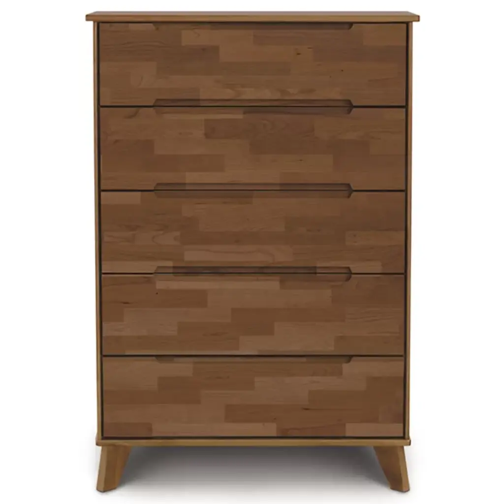 Organize and store your favorite clothing items with ease thanks to the Linn 5 Drawer Dresser by Copeland Furniture. This wooden dresser is made from solid oak hardwood, with each drawer box interior sanded smooth. Each dresser drawer is designed with adjustable glides that ensure the drawers stay on track at all times. Skip the headache and keep your shirts, pants, socks more organized with this modern dresser.
