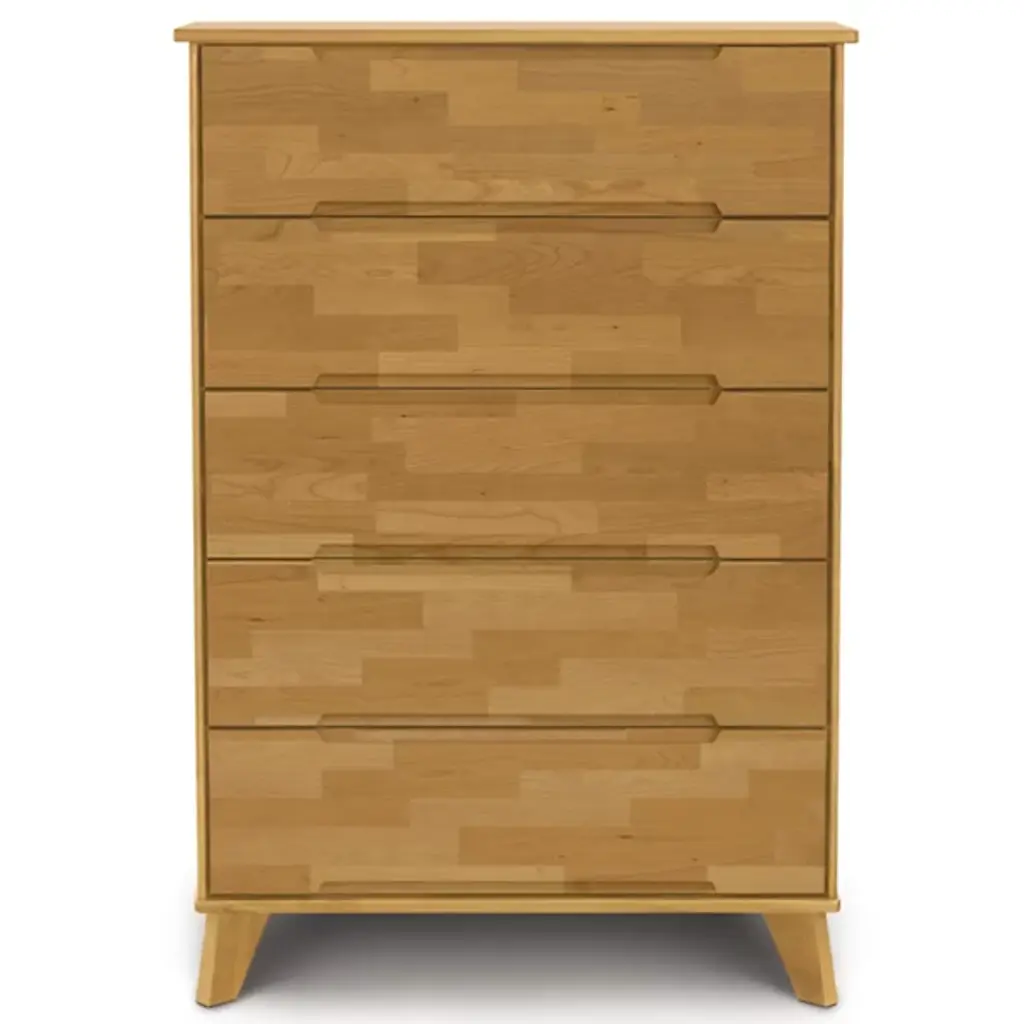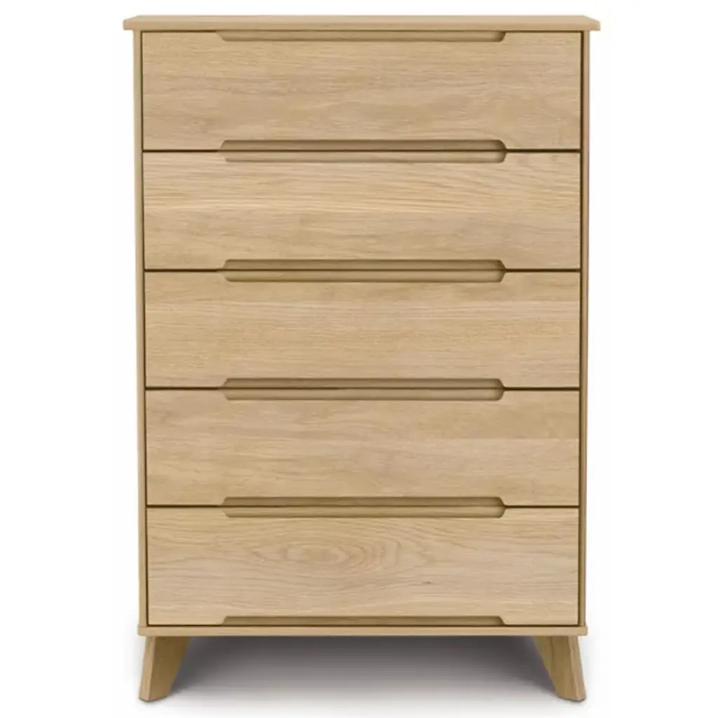Organize and store your favorite clothing items with ease thanks to the Linn 5 Drawer Dresser by Copeland Furniture. This wooden dresser is made from solid oak hardwood, with each drawer box interior sanded smooth. Each dresser drawer is designed with adjustable glides that ensure the drawers stay on track at all times. Skip the headache and keep your shirts, pants, socks more organized with this modern dresser.