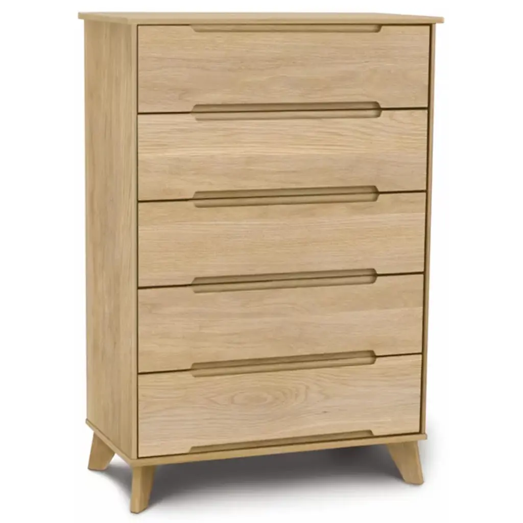 Organize and store your favorite clothing items with ease thanks to the Linn 5 Drawer Dresser by Copeland Furniture. This wooden dresser is made from solid oak hardwood, with each drawer box interior sanded smooth. Each dresser drawer is designed with adjustable glides that ensure the drawers stay on track at all times. Skip the headache and keep your shirts, pants, socks more organized with this modern dresser.