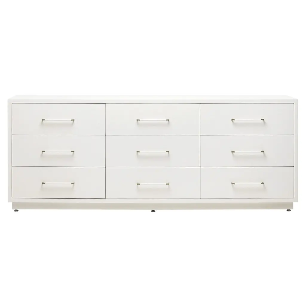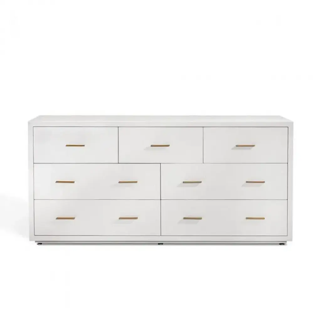 The Livia 7 Drawer chest brings super-chic style thanks to its natural white faux linen texture and antique brass-finished hardware.