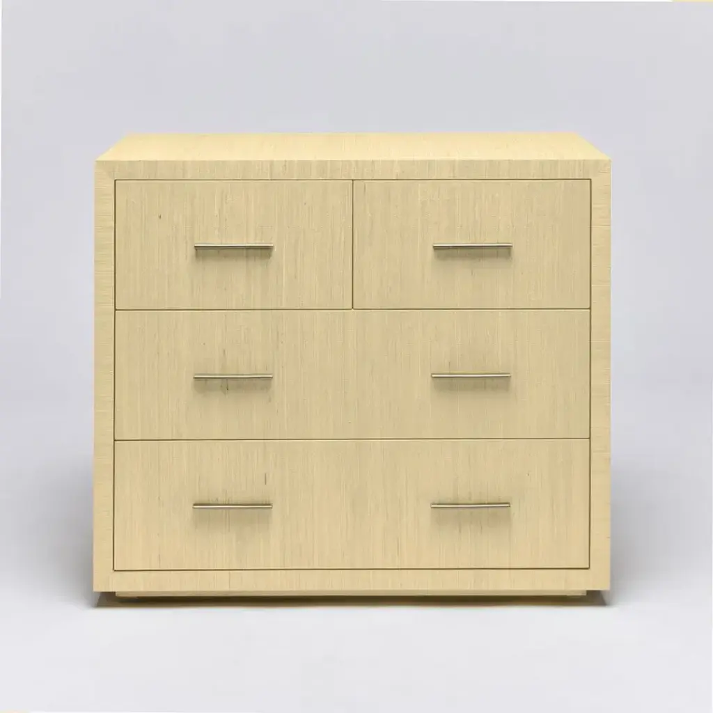 Pairing iron hardware in a champagne silver finish with a natural sisal texture turns the Livia Occansional Chest into an organic, yet super-chic, statement. Sisal is made from hand-woven strands of natural fibers on a rice paper backing. The texture and coloration of all natural fibers will vary and will patina with time and use. Each piece will have its own charm, character and coloration and should be celebrated for its uniqueness.