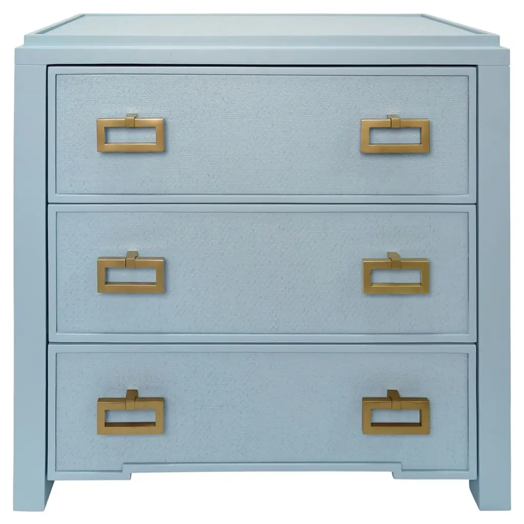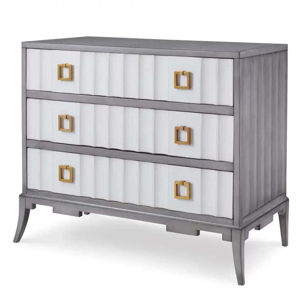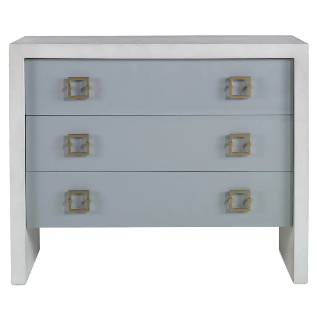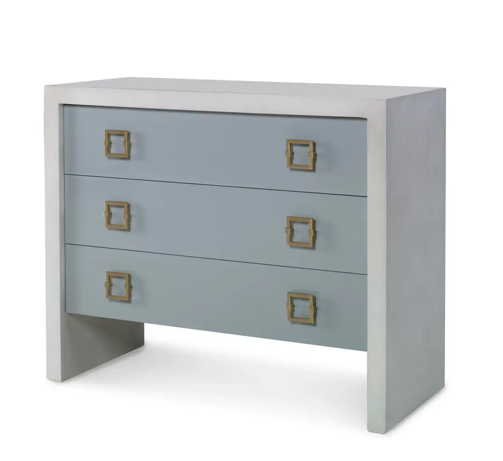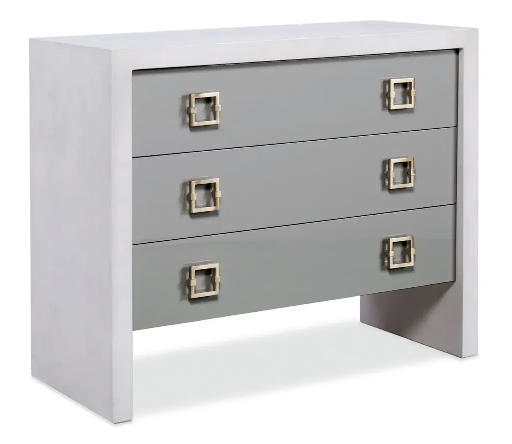 The Liza Drawer Chest is a modernized Parson form finished in an off-white textured concrete contrasted with a sleek gloss lacquer finish on the three drawer fronts which feature square brushed-brass handle hardware. Assembly Required? No Care Instructions: Dust with a soft, clean cloth slightly moistened with water, and dry completely with another clean cloth, always rubbing with the grain.