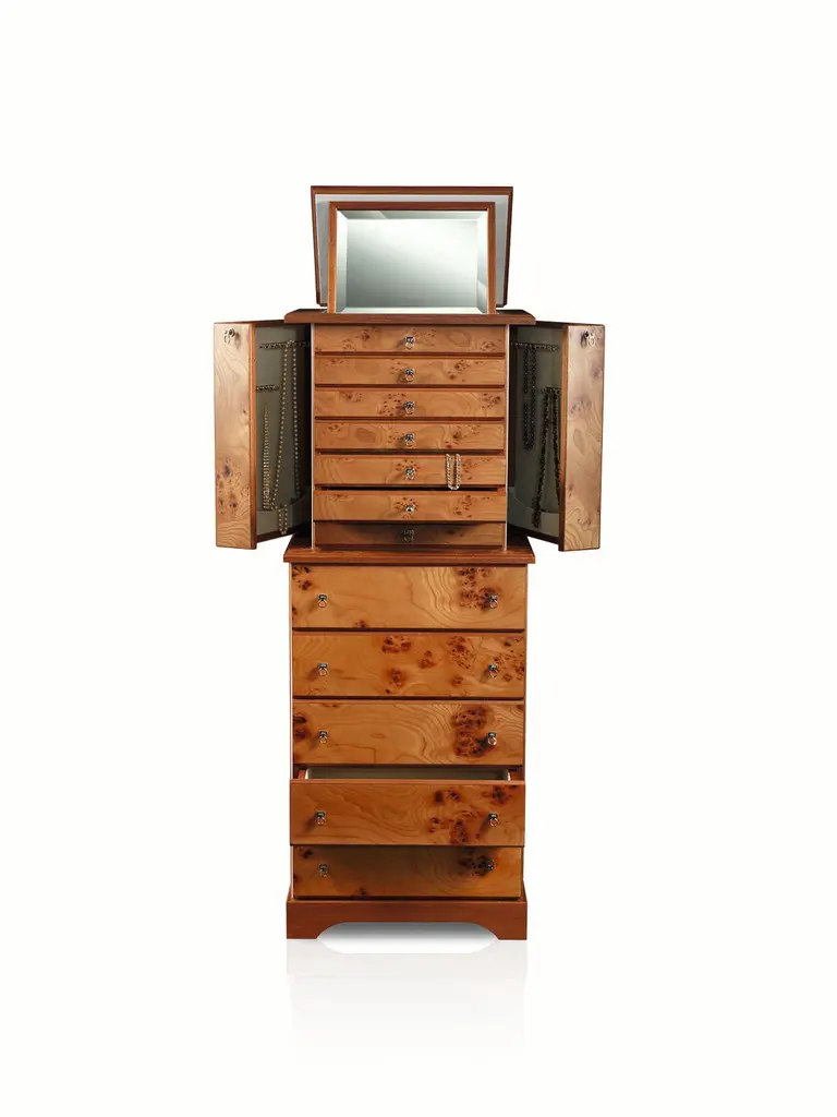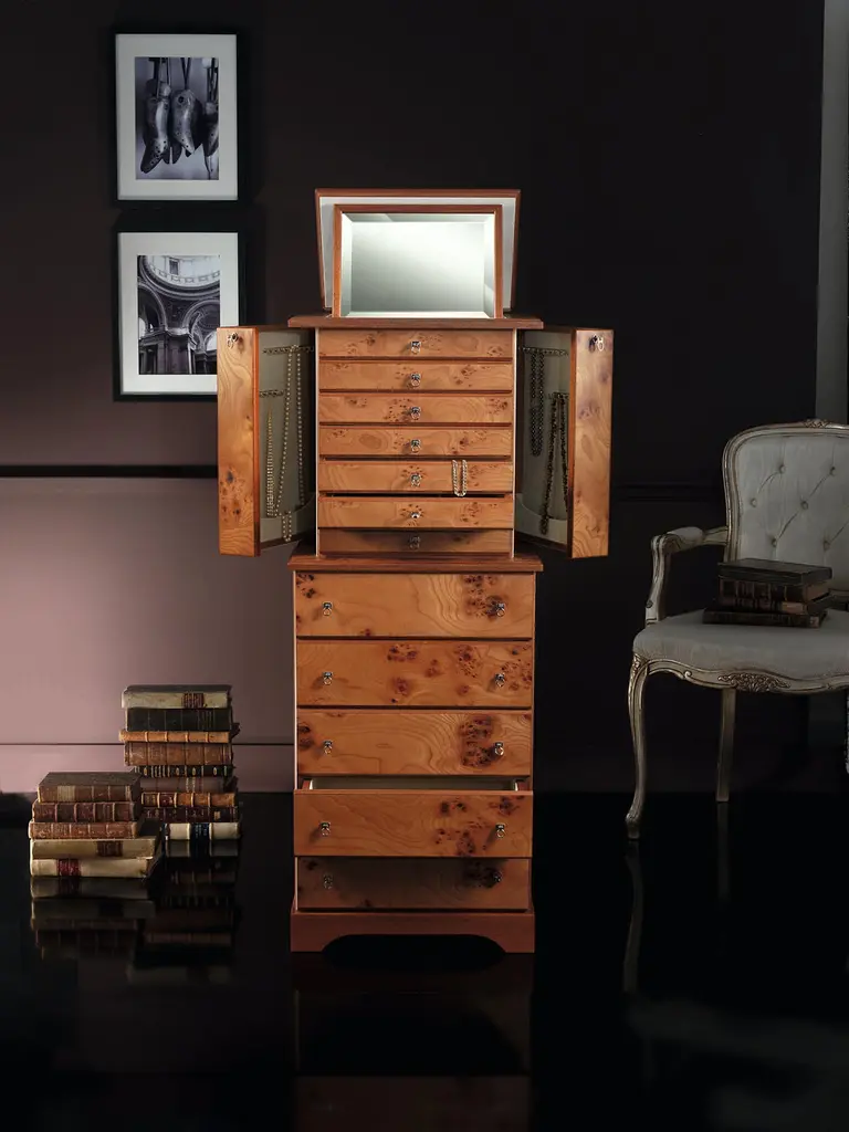 Jewelry armoire in briar and mahogany matte finish, ultrasuede lining. 24 karats gold plated brass accessories. Side lockable doors with necklace bars. The 6 top drawers can be locked and are lined for different jewels. Adjustable mirror in top part, and five large bottom drawers for scarves / lingerie / personal objects.