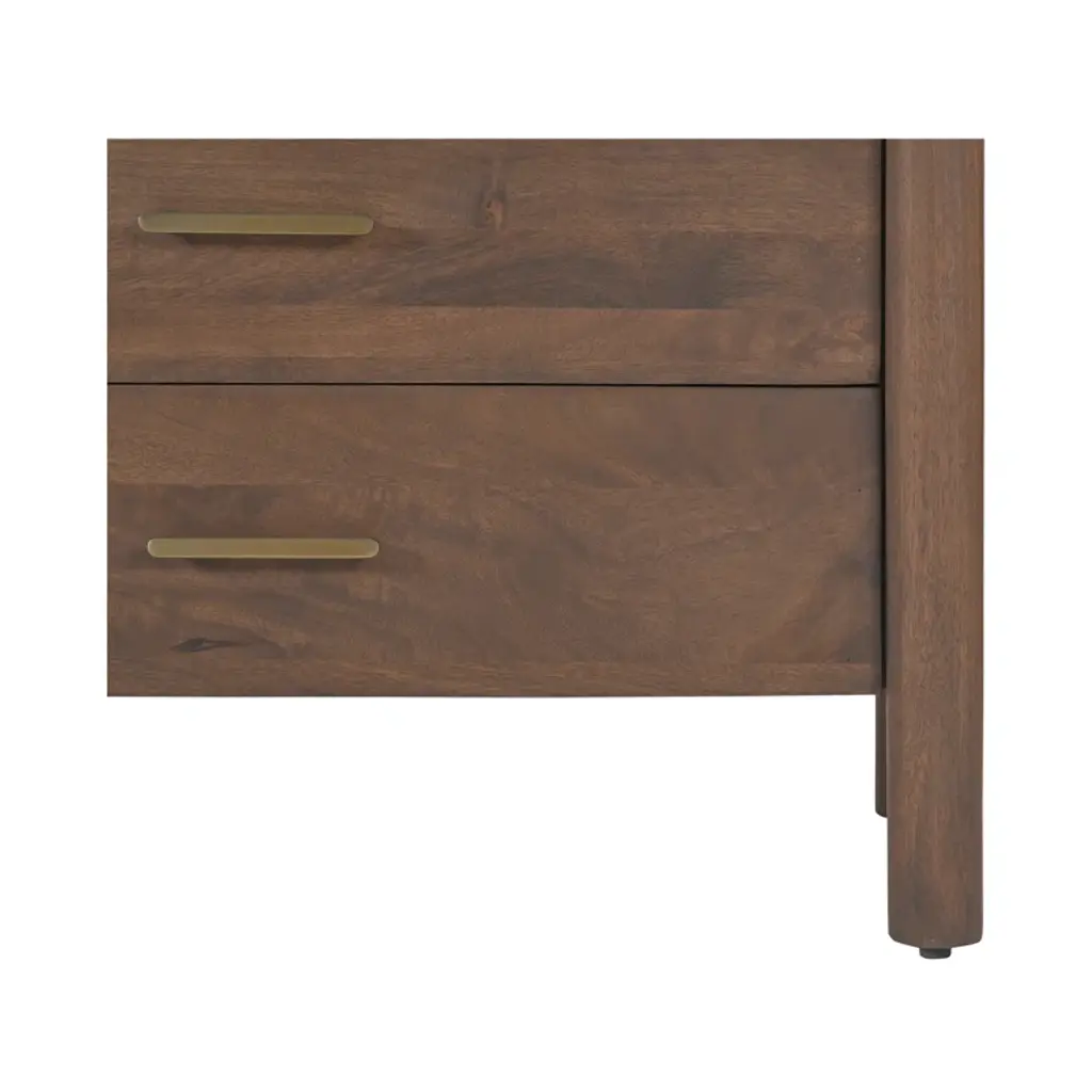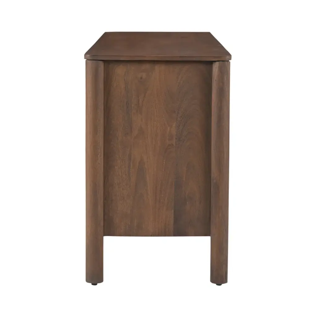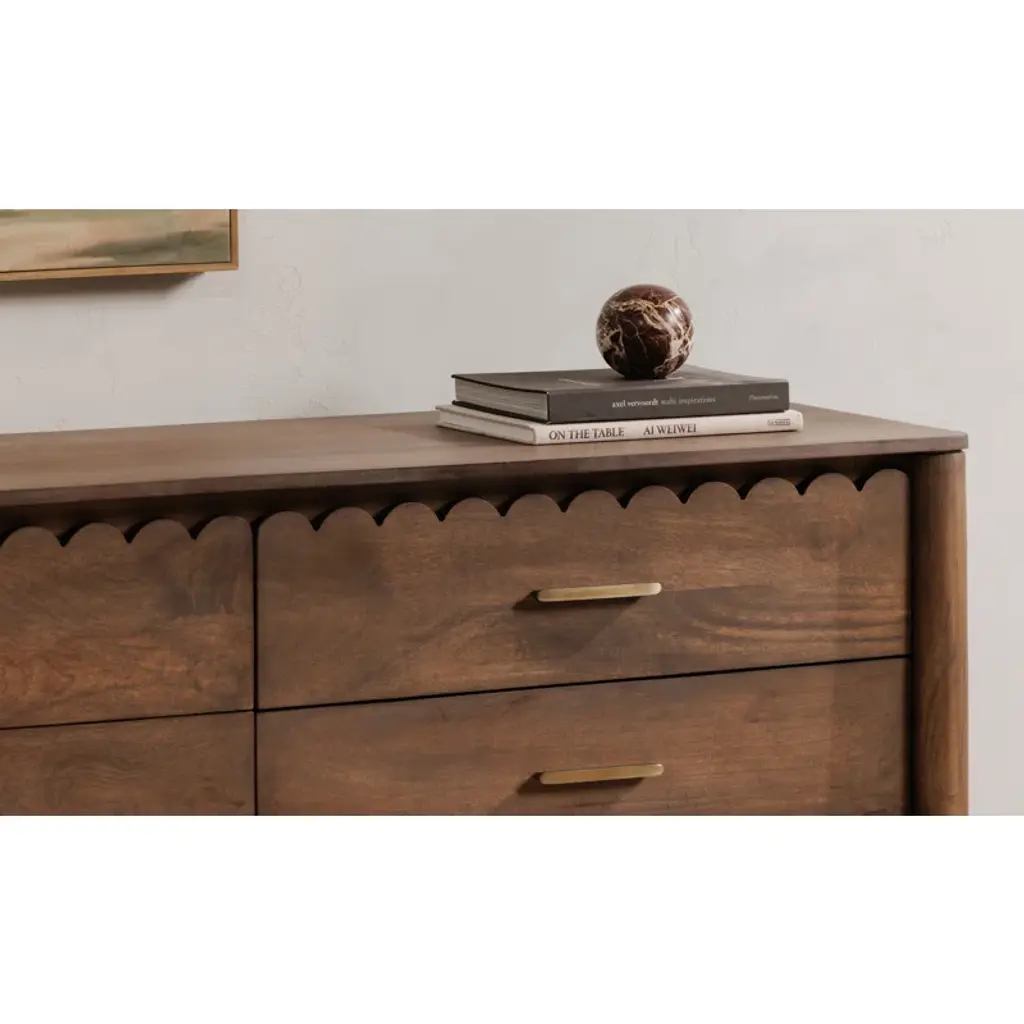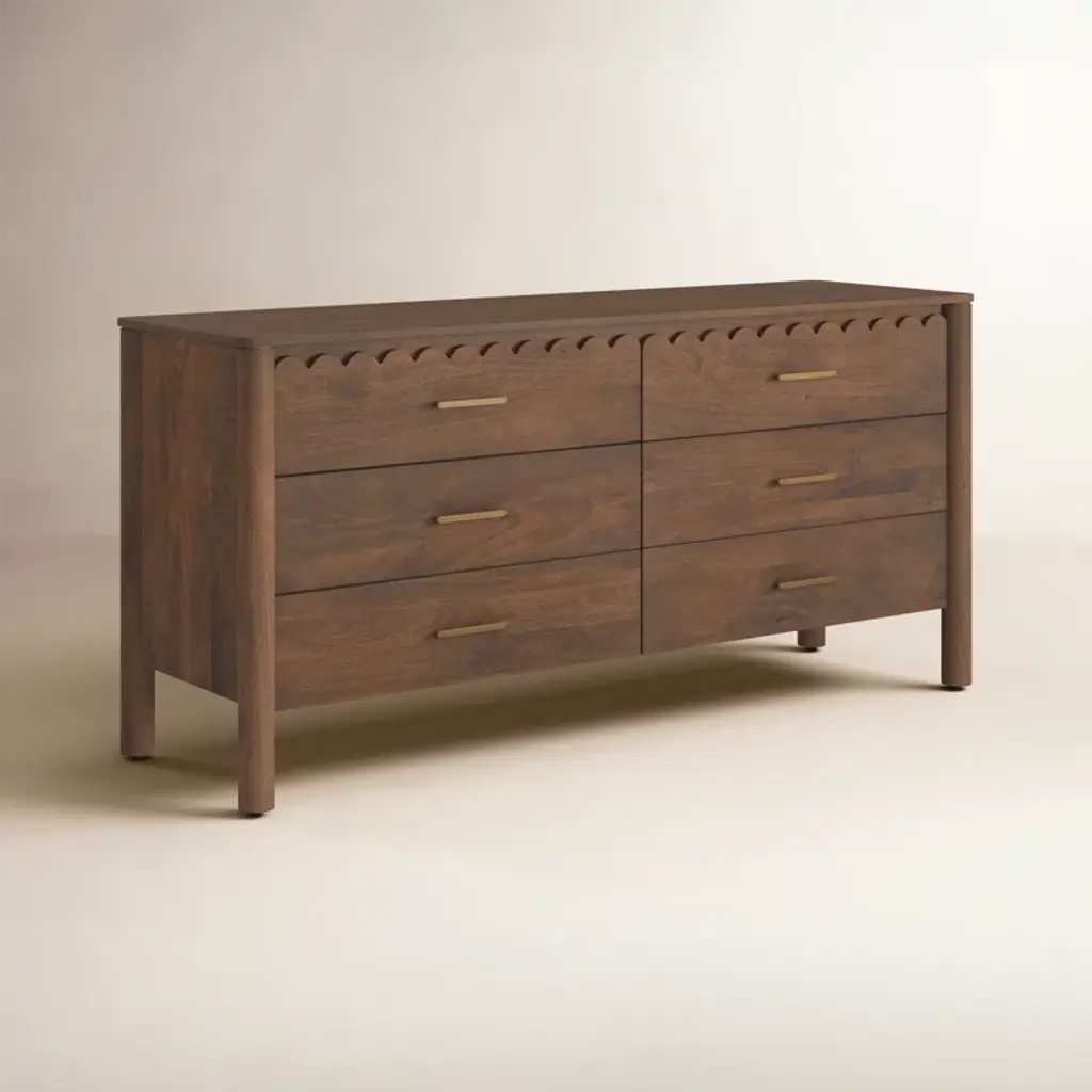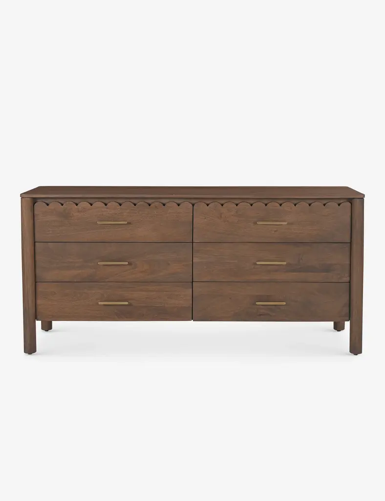This double dresser is a stunning addition to your bedroom, offering a warm and inviting atmosphere with its intricate scalloped edge details reminiscent of classical influences. Crafted from solid mango wood, this horizontal dresser showcases natural wood grain color variation and six spacious drawers with soft-close glides for easy access. The metal drawer pulls add a sophisticated touch, while the finished back ensures a polished look from all angles. Plus, there's no assembly required, so you can start enjoying it right away.