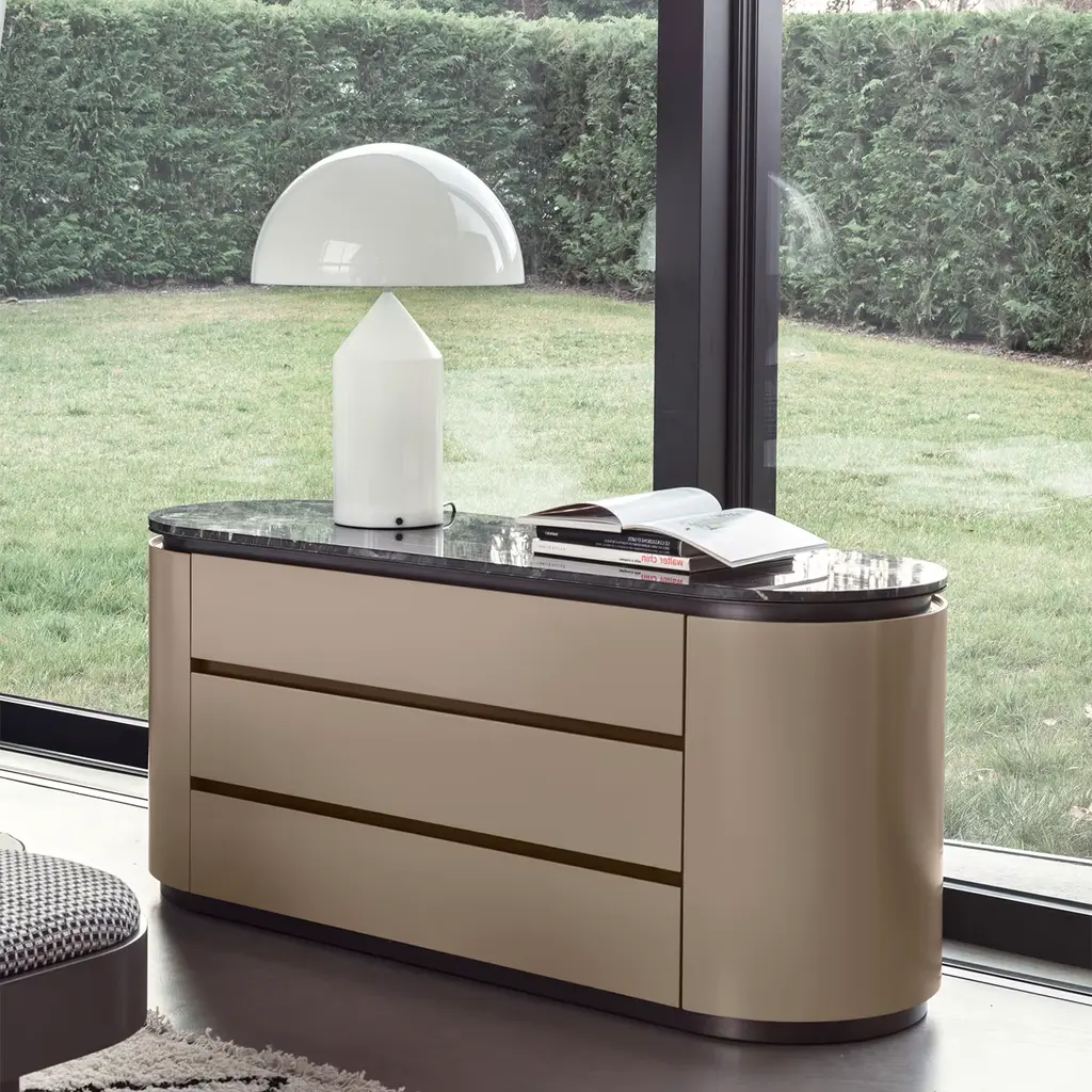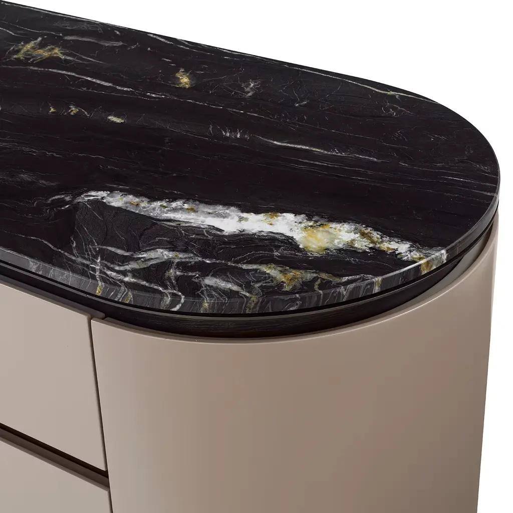 Indulge in opulence with our exquisite console. Distinguished by soft curves, this dresser's rounded silhouette is crafted of plywood and MDF lacquered with a matte Warm Grey finish. Crowned by a black Belvedere marble top, the metal frame and Biotite satin finish details elevate its allure. The three soft-closing drawers ensure ample storage and practical use in an elegant design. Explore available customizations by consulting the Concierge.