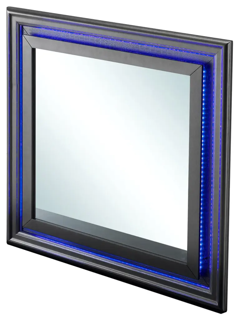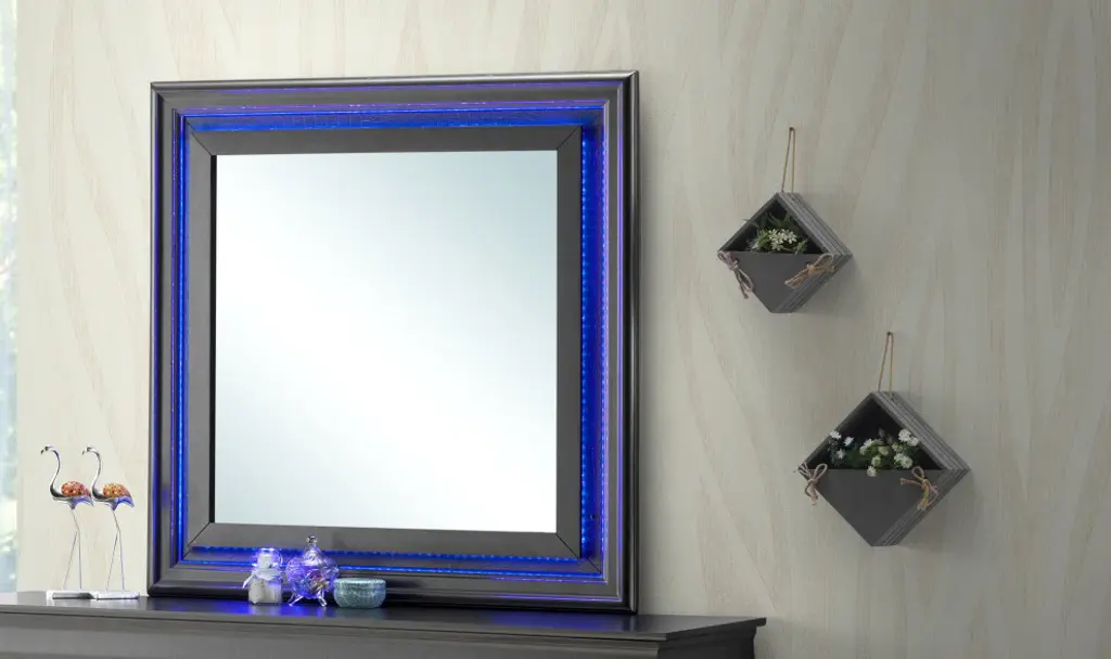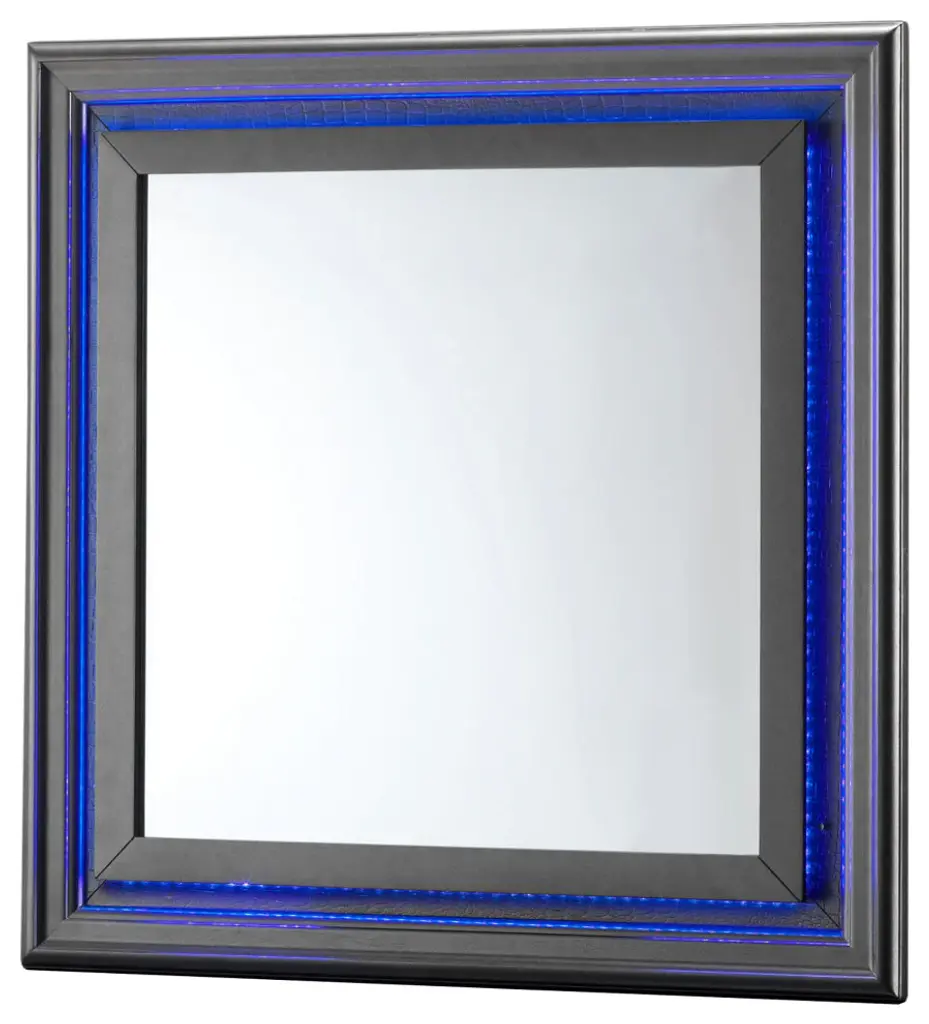 Led accented mirror with textured "Croc" Finish adds a stunning look to your bedroom. Nice looking mirror with wood veneer. A perfect choice for your home.Features:Textured "croc" finishLed accent on headboardWood veneerChoice of different colorMirror supports not included-supplied with matching dresserMade in Malaysia